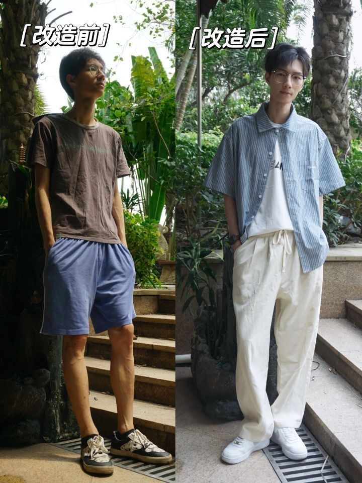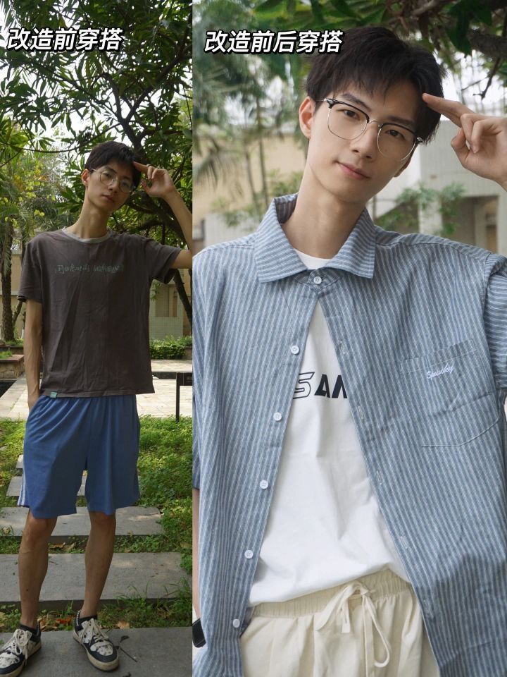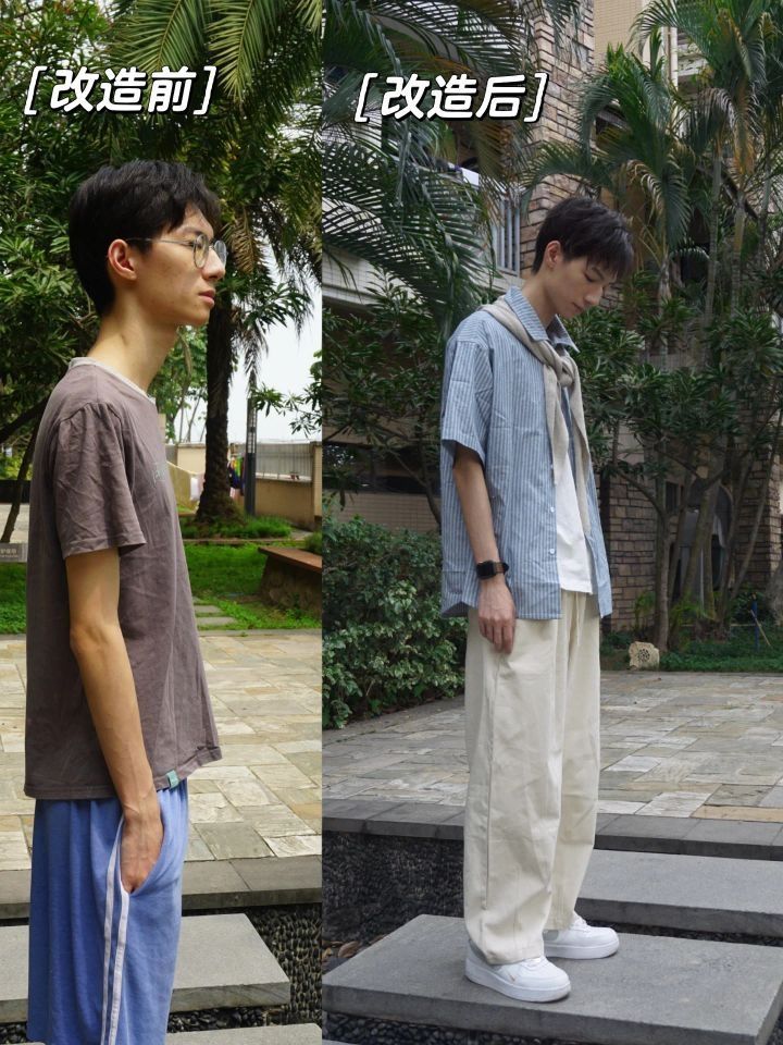 瘦子夏天穿搭技巧分享(理工男穿搭总结) 博主身高178 体重50kg 上身 1、T恤选择 ❌不要穿小码和皱皱的T恤文化衫 ✔️选择版型宽松 有垂感的短袖 200g重 不用太厚 太厚很热 2、叠搭(不热情况下) 选择一件肩部肩线合适的衬衫叠搭 肩线可以营造宽肩错觉 面料选薄但硬一点的面料 要有立领的衬衫可以修饰窄肩和长脖子 下身 3、裤子选择直筒长裤 ❌不要再穿松松垮垮棉运动短裤 显得腿...