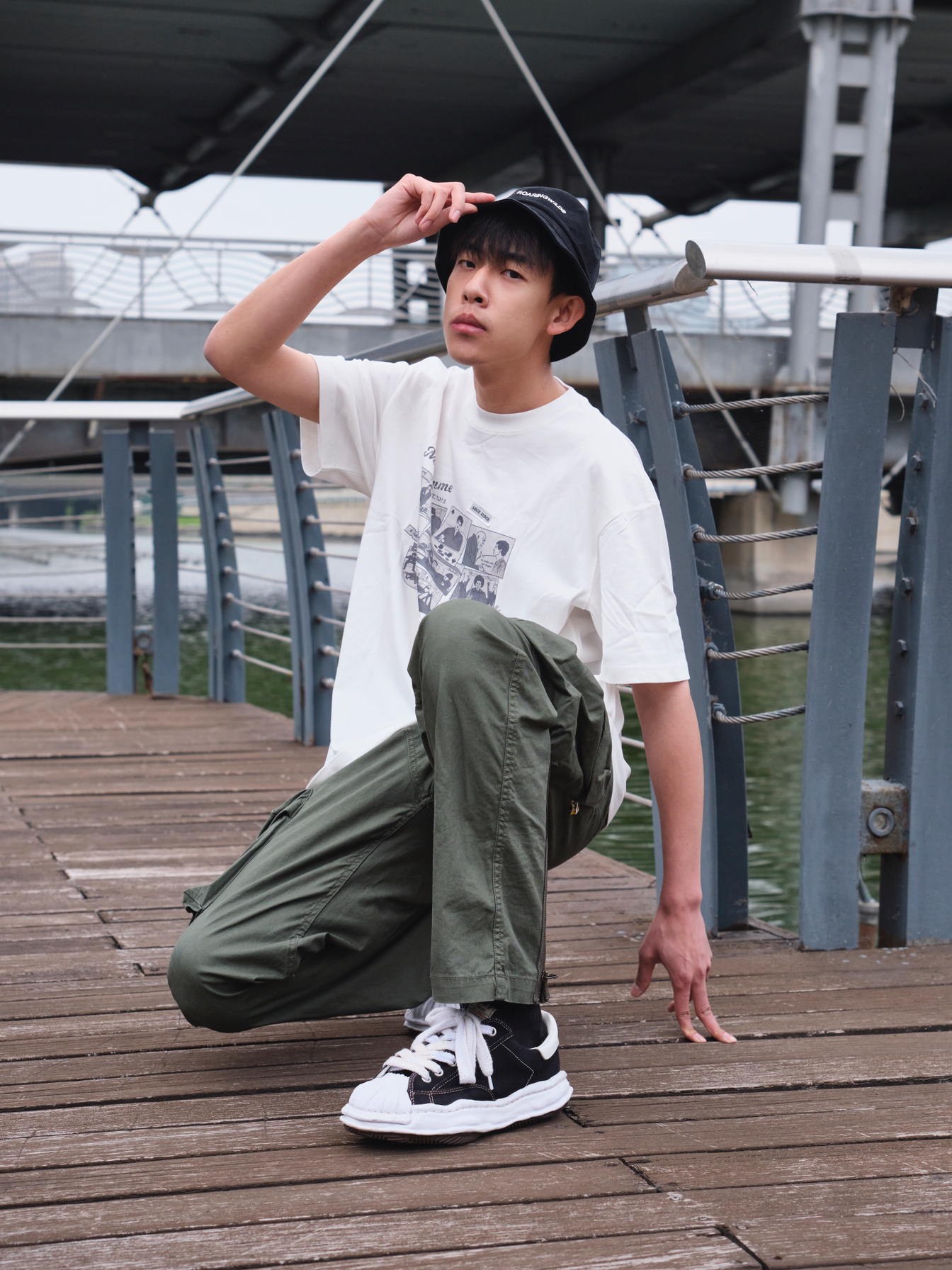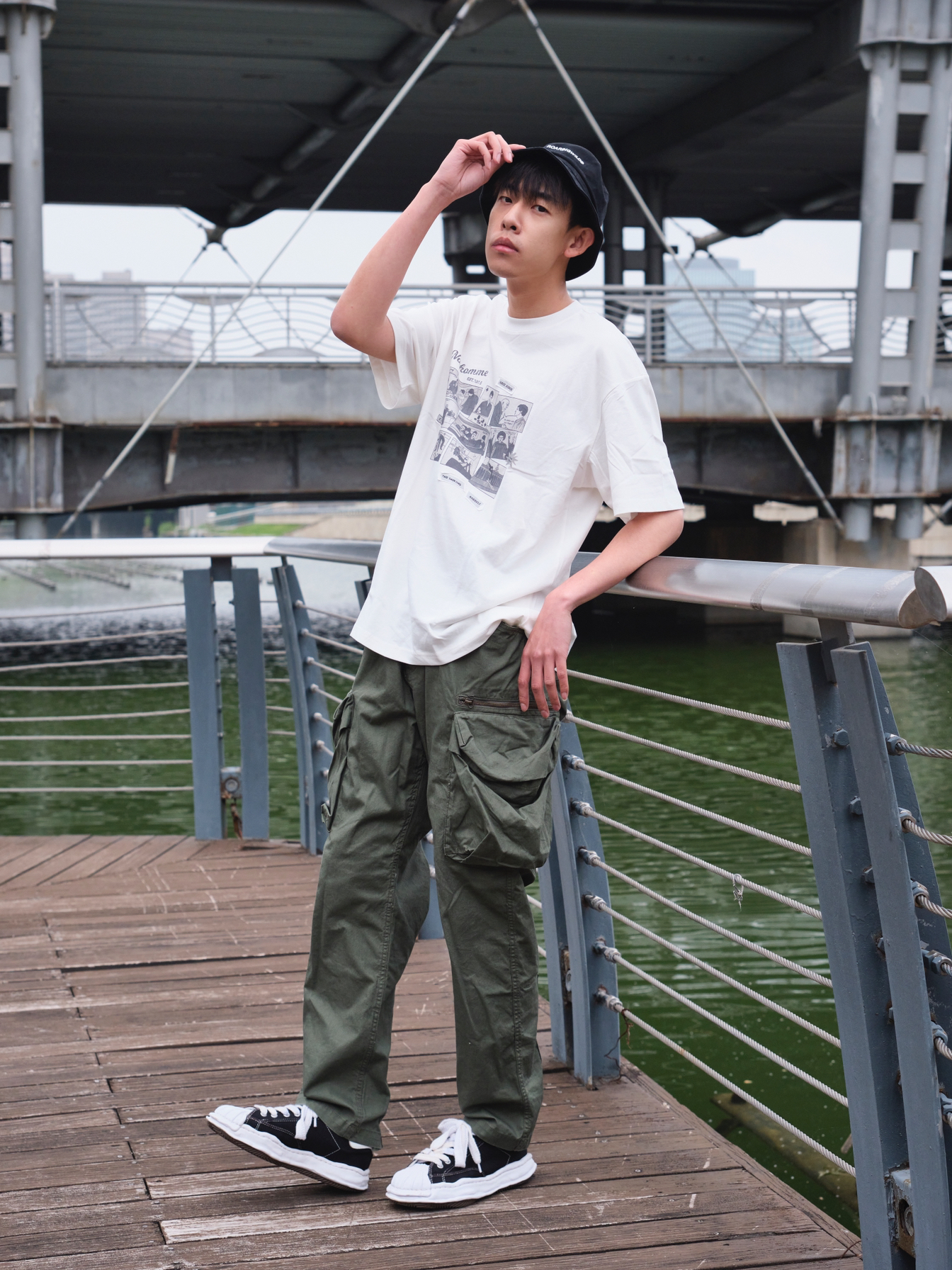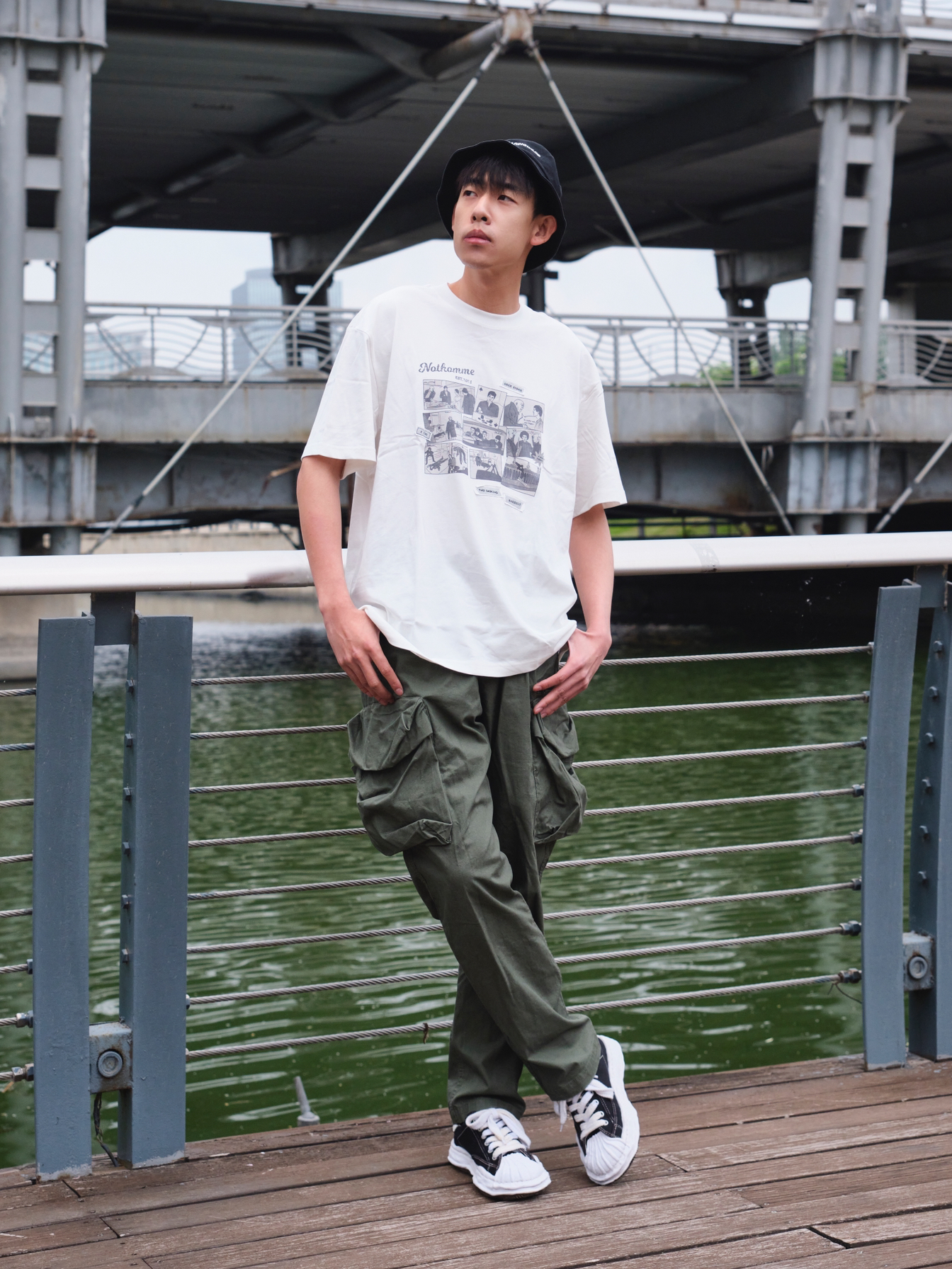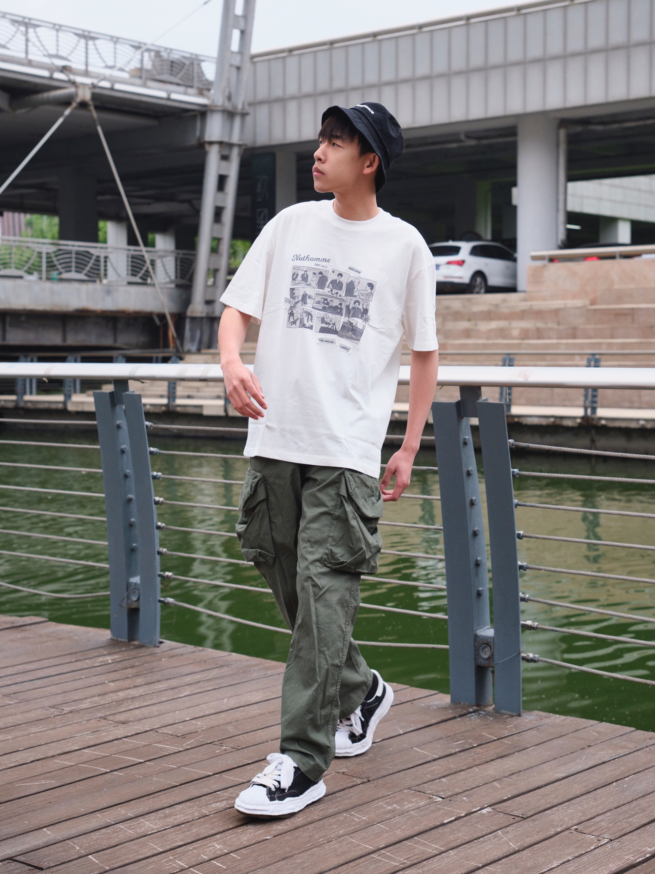 哟!wassup!大家好~ 520去约会怎么穿 来一套春夏简约工装风穿搭吧 松弛感拿捏到位 干干净净赴约~ - 上半身的T恤来自 NOTHOMME 简单干净的白T真的是氛围感穿搭神器 而且正面的电影印花和立体感十足的拼接 又增添了些许细节 不会显得过分呆板单调 版型方面微宽松 身高185体重140穿xl码 这件白T还很适合当情侣装或者520礼物哦~ - 下半身一条军绿色宽松工装裤 搭配一双黑白...