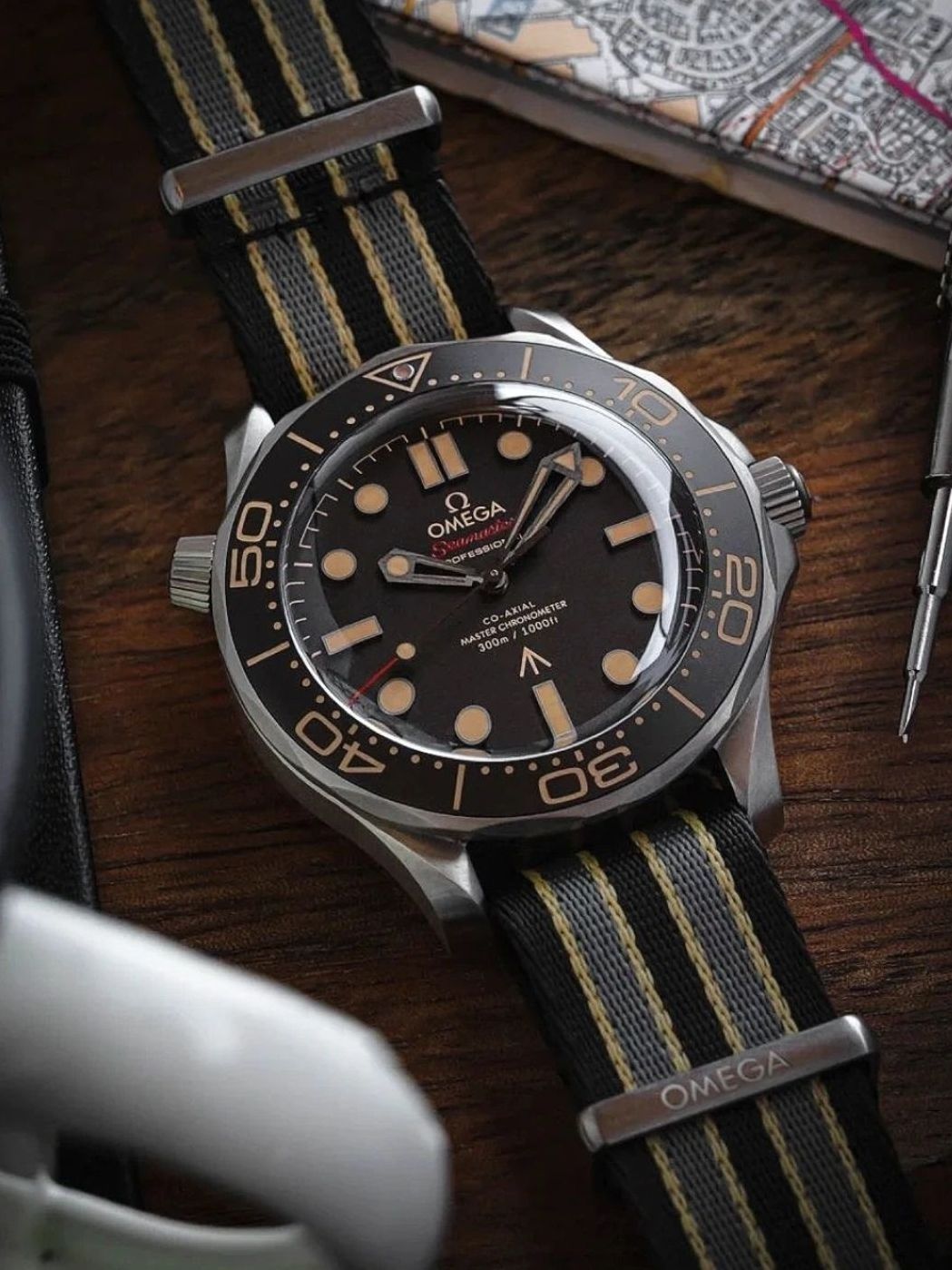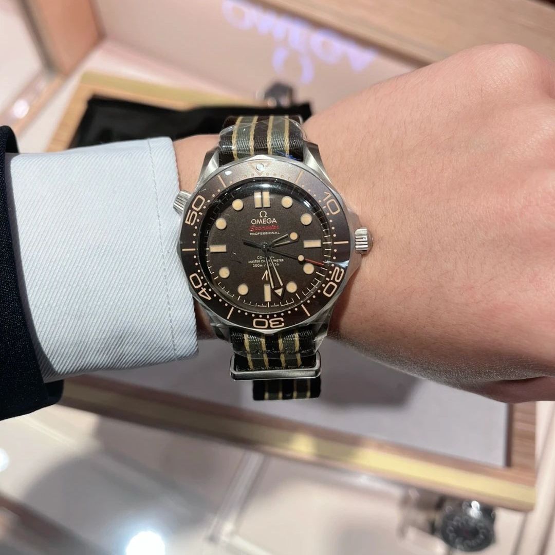 这款007版潜水表内部搭载欧米茄8806至臻天文台机芯,在精准度、防磁性和计时性能达到了行业更高标准❤️。 42毫米海马系列300米潜水表007版腕表以坚固轻盈的二级钛金属打造🍃,搭配铝质棕色表圈和表盘呈现复古表款历经岁月所展现的色调🌟 (图片来源于网络)
