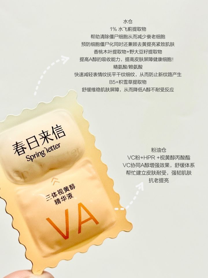 春日来信这个品牌想必大家也不陌生吧! 他家最近出了一款适合早C晚A入门新手的! 春日来信三体视黄醇精华 - 和别的VA不同寻常的 春日来信这个采用了【三体双仓】设计 三体是:水、油、粉3种料体 双仓是:上面3种料体放入两个仓内 次抛设计以及不透明避光包装 能够更好地使VA更稳定 - 🏻水仓 1% 水飞蓟提取物 帮助清除僵尸细胞从而减少衰老细胞,预防细胞僵尸化同时还兼顾去黄提亮紧致肌肤 香桃木叶提取...