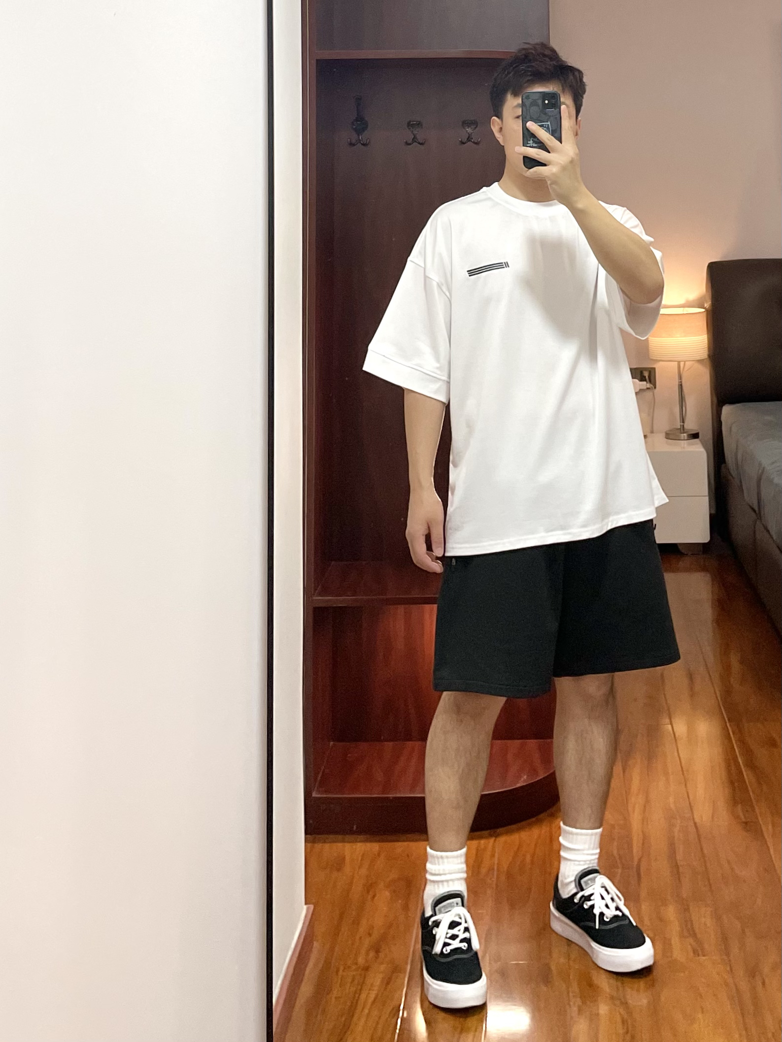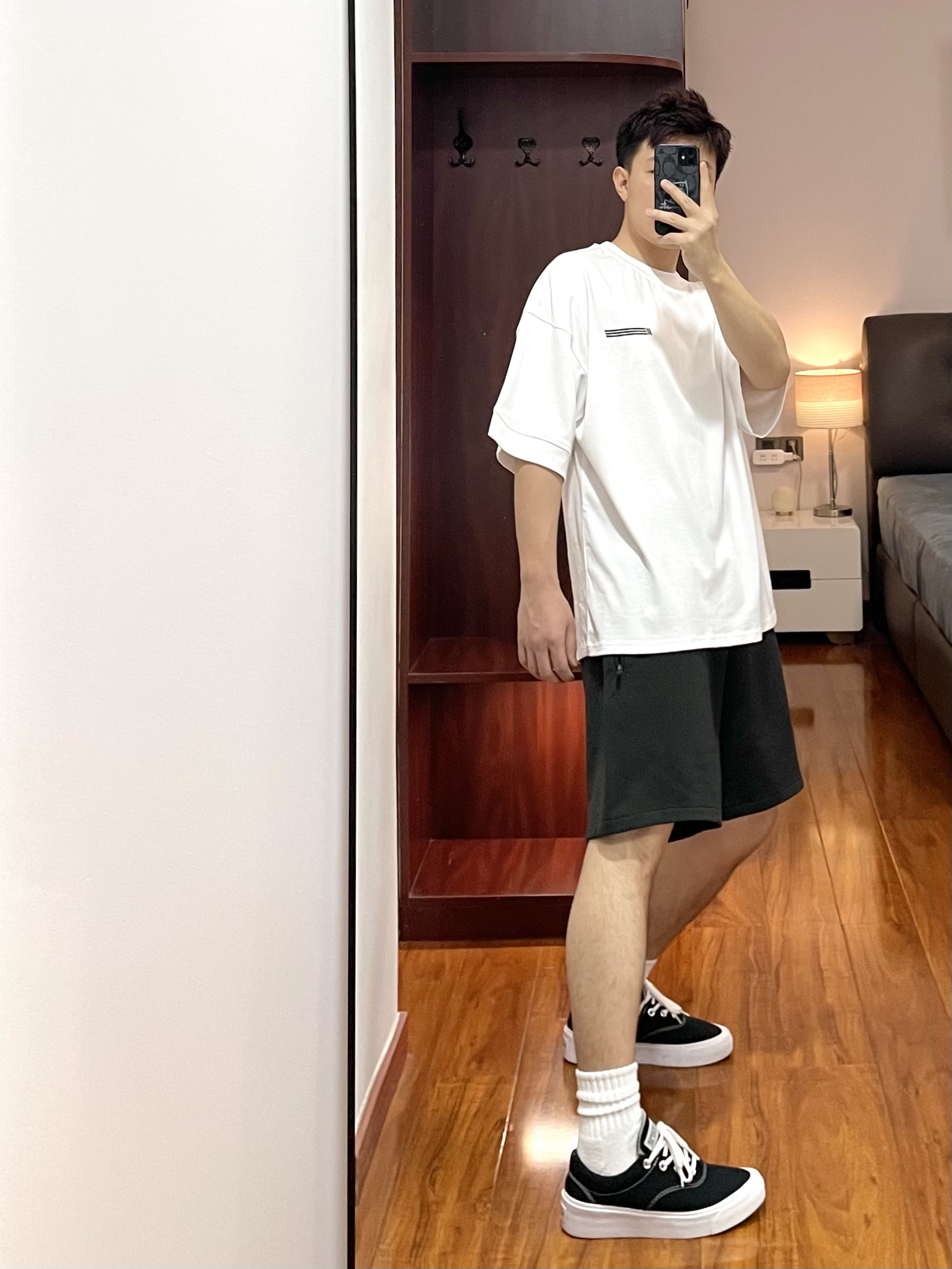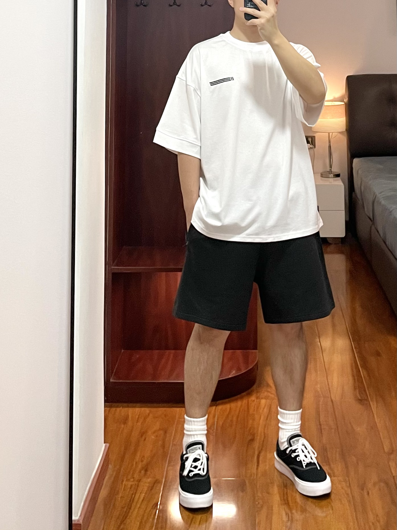 170cm/67kg 分享一个普通人的穿搭 - 👕:11ESTRANGER 短袖-S 白色T恤爱好者系列 领口螺纹宽大有质感,袖口也有螺纹 面料厚实立体,版型宽松舒适。 👖:11ESTRANGER 宽松短裤 宽松厚实的廓形短裤 深灰的颜色,很休闲自然 裤型宽大等满足各个裤型。 👟:converse skidgrip 休闲百搭鞋款。
