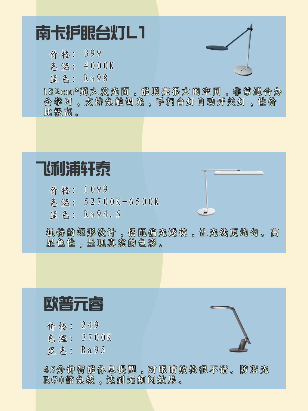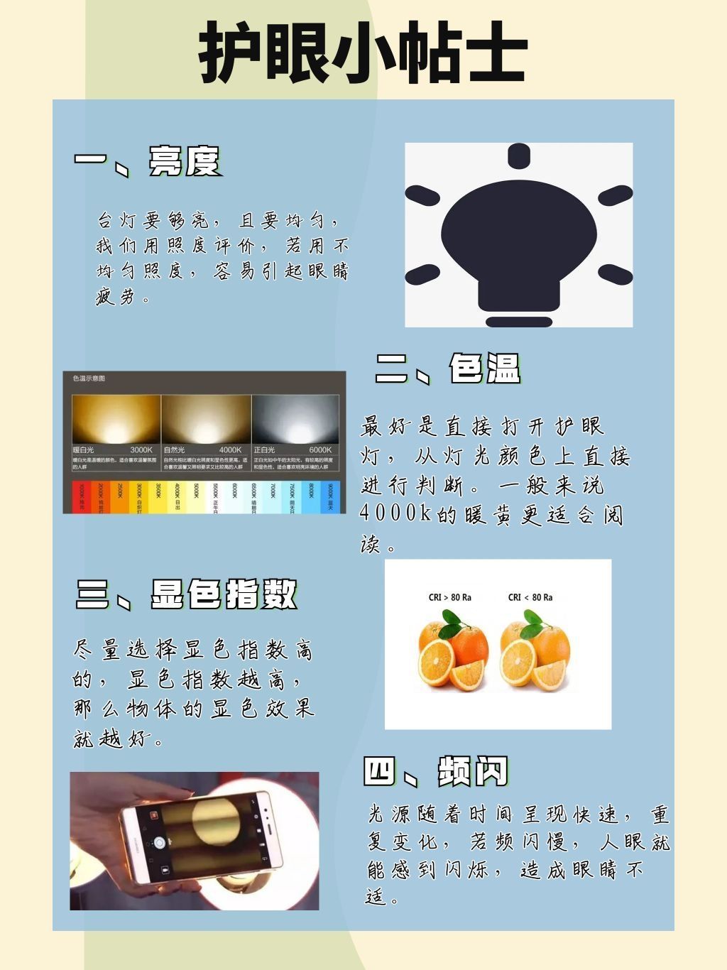 如今孩子近视的比例越来越大,而且时间越来越提前,二三年级就有孩子开始近视佩戴眼镜。 其实造成近视的原因不外乎作业坐姿不标准,学业时间太长缺少户外的运动,也包括可能灯 光光源的问题造成对于视力的影响。 在选择购台灯前,我们需要先看这些 色温 最好是直接打开护眼灯,从灯光颜色上直接进行判断。一般来说4000k的暖黄更适合阅读。 显色指数 尽量选择显色指数高的,显色指数...