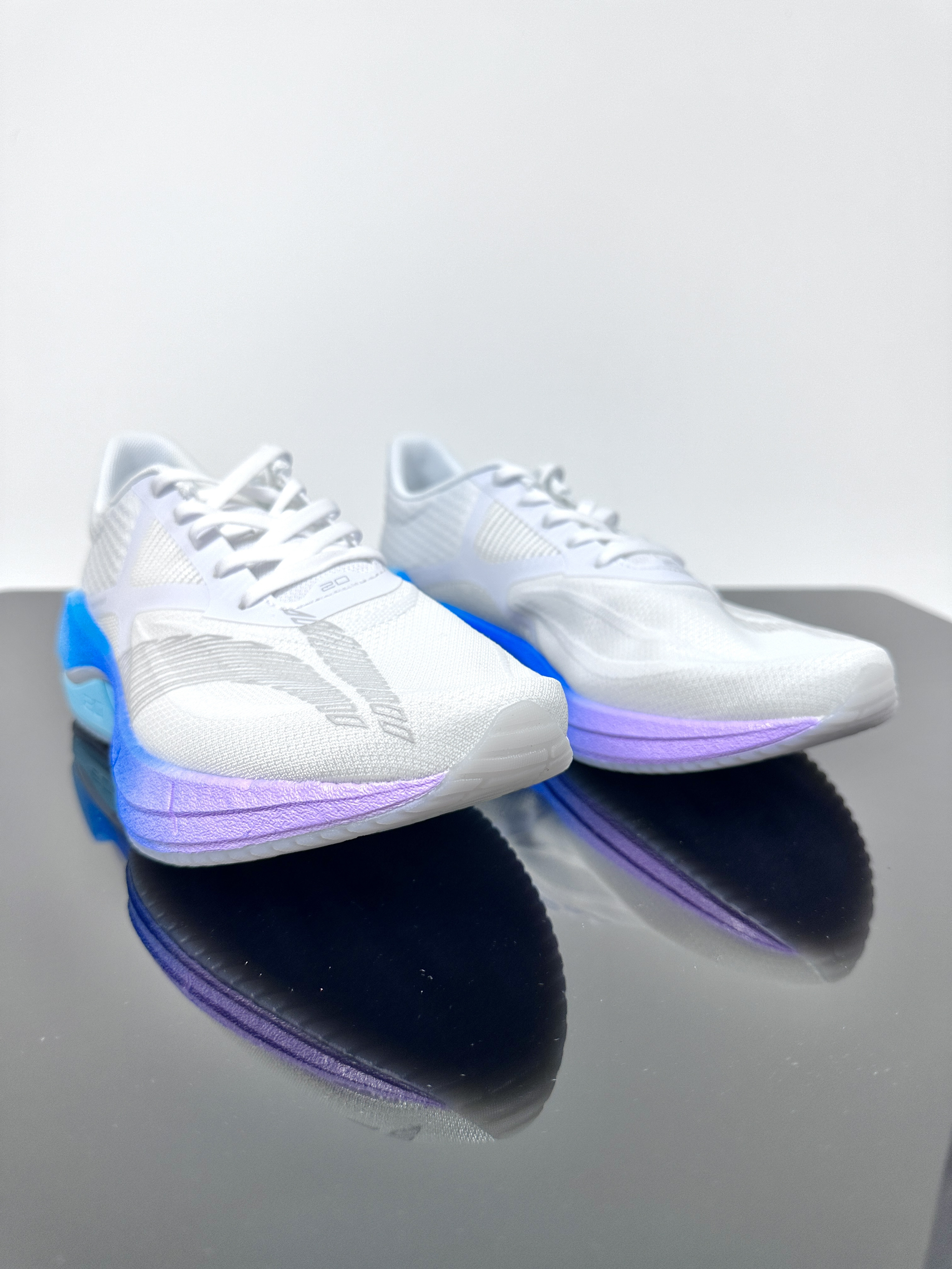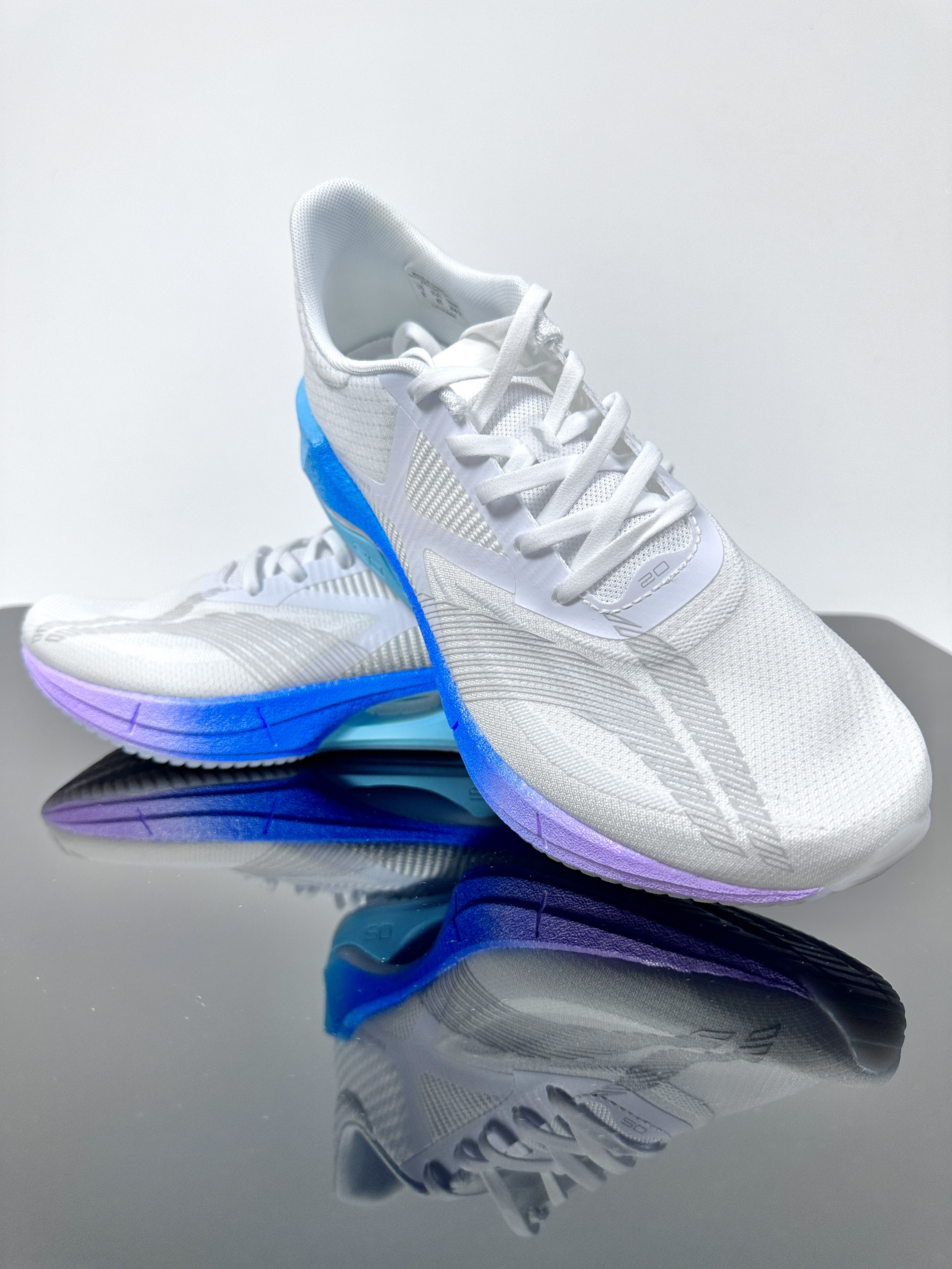 超轻20 新配色的颜值非常的高,蓝紫渐变色中底加上白色的鞋面,给人一种棉花糖配色即视感,喜欢的朋友可以赶紧入手! 跑鞋配置 鞋面:采用䨻丝材质,在轻量性、透气性和鞋面强度都非常优秀。 中底:搭载四分之三䨻科技,后掌的下层用的轻质EVA ,中间贴着异形抗扭片。 大底:采用GCR耐磨橡胶,相较普通橡胶重量更轻、湿地止滑效果更好。