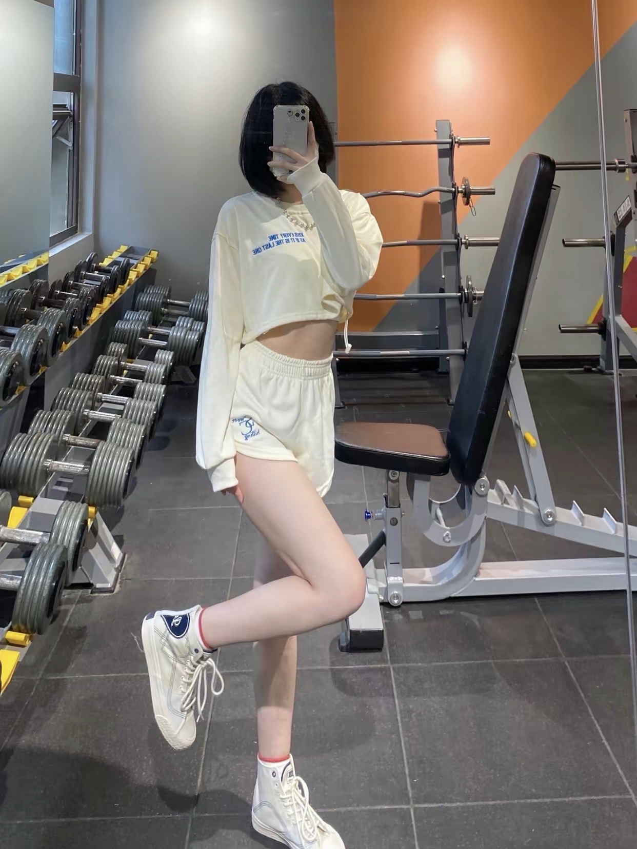 短上衣配短裤太显身材比例了 上衣内搭运动bra 健身运动很方便 脚上的人本高帮帆布鞋爱心平底百搭板鞋, 奶fufu的米兰色 ,已经是入手的第三双人本的鞋子了 ,便宜好看 跟高2cm
