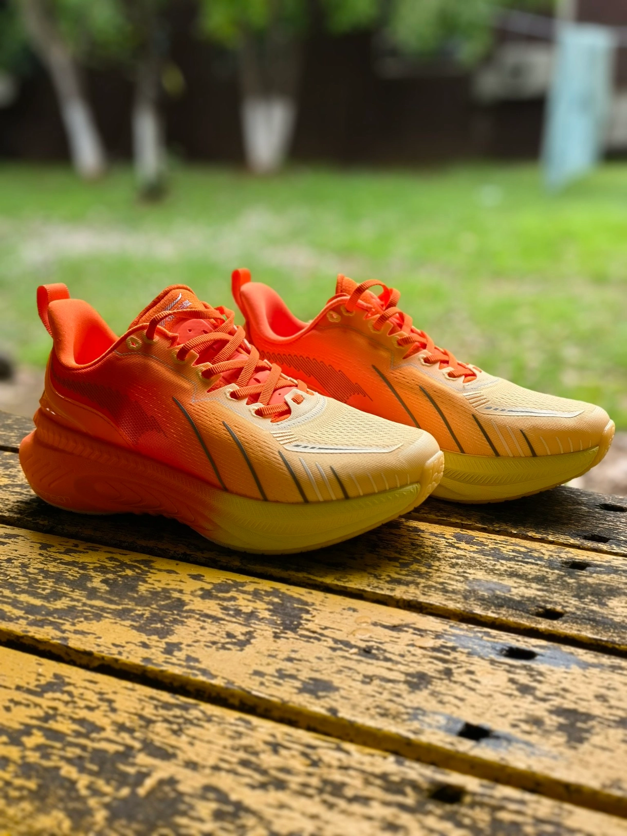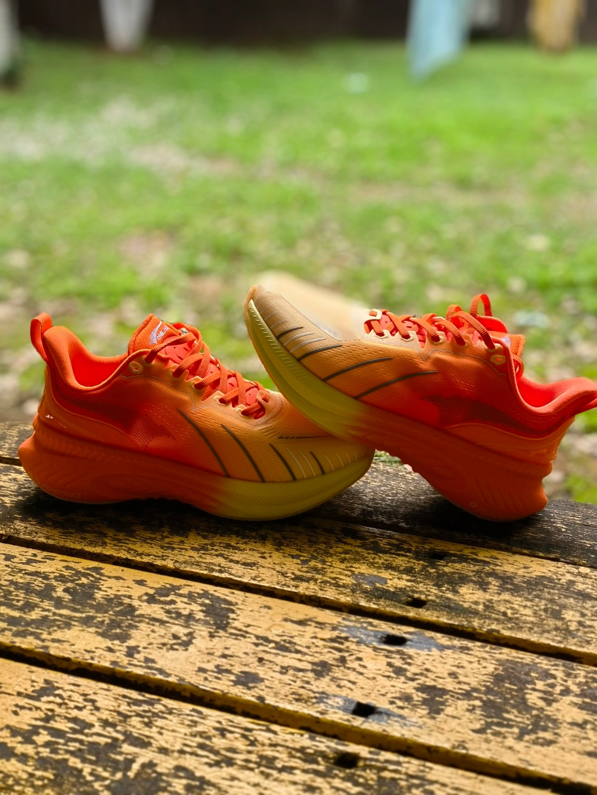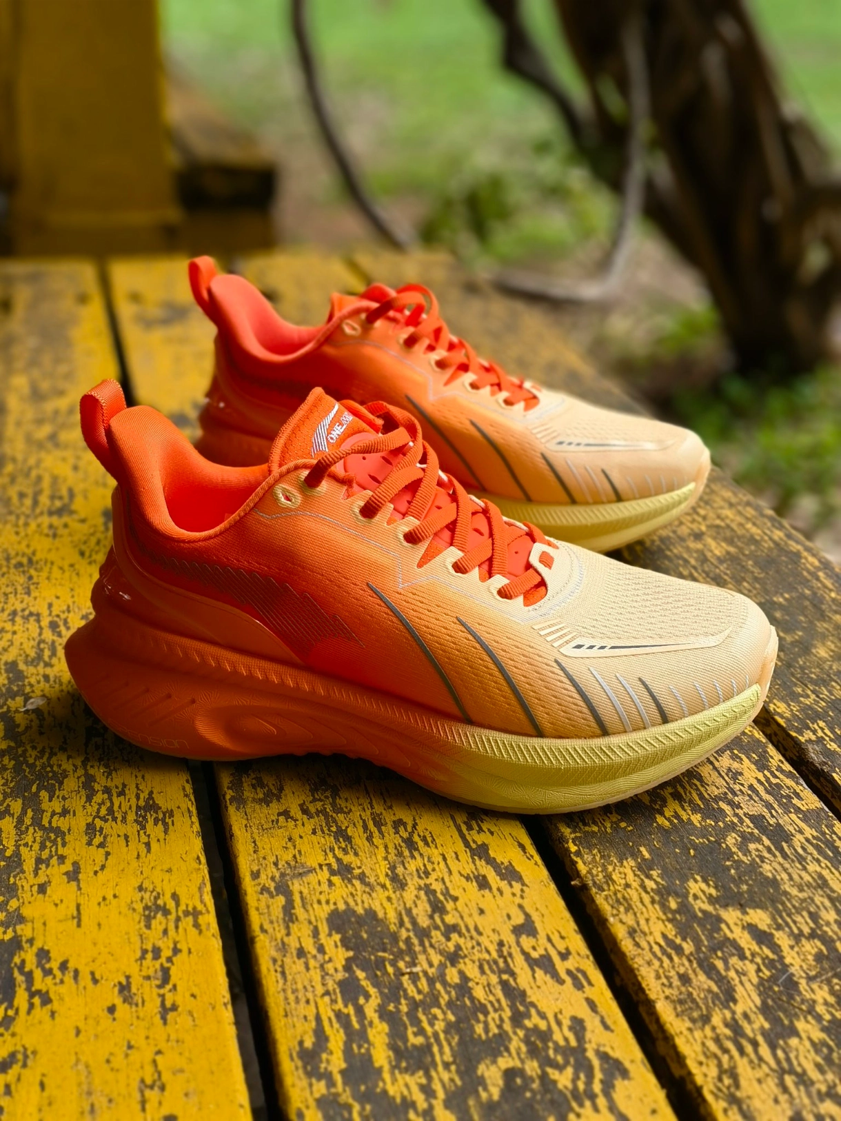 颜值很高的一款防滑缓震跑鞋/玩觅缓震跑鞋,宝石捷红配色,红色和黄色的渐变融合色,中底缓震配置给的很足,真空发泡泡棉,内置缓震气垫,后掌的缓震气囊,乳胶缓震鞋垫。轮胎防滑大底,鞋面采用透气网面,半内靴的设计提高包裹性。一款脚感不错的缓震跑鞋。#因为一个细节入了一双鞋 #为买鞋吃过的苦 #没想到这双鞋长这样 #跑鞋党必入 #高颜值跑鞋