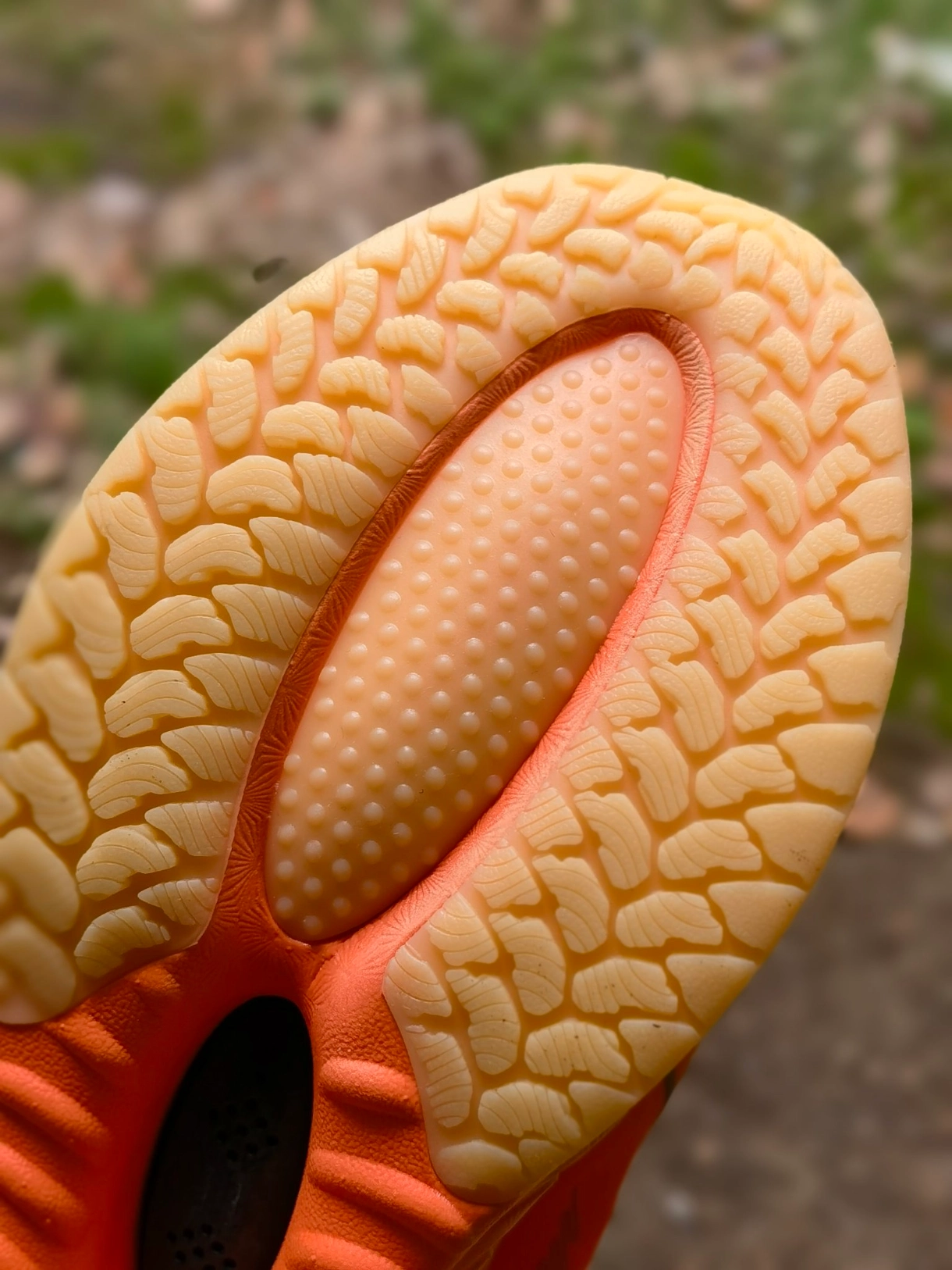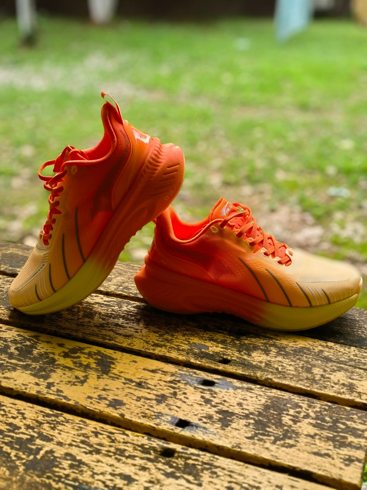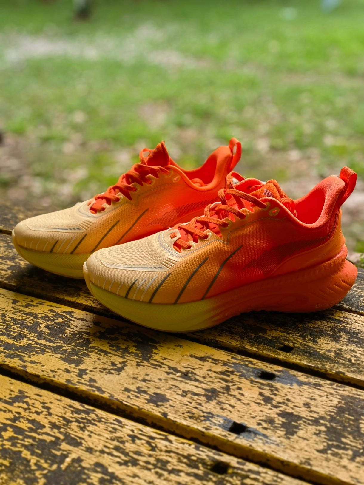 颜值很高的一款防滑缓震跑鞋/玩觅缓震跑鞋,宝石捷红配色,红色和黄色的渐变融合色,中底缓震配置给的很足,真空发泡泡棉,内置缓震气垫,后掌的缓震气囊,乳胶缓震鞋垫。轮胎防滑大底,鞋面采用透气网面,半内靴的设计提高包裹性。一款脚感不错的缓震跑鞋。#因为一个细节入了一双鞋 #为买鞋吃过的苦 #没想到这双鞋长这样 #跑鞋党必入 #高颜值跑鞋