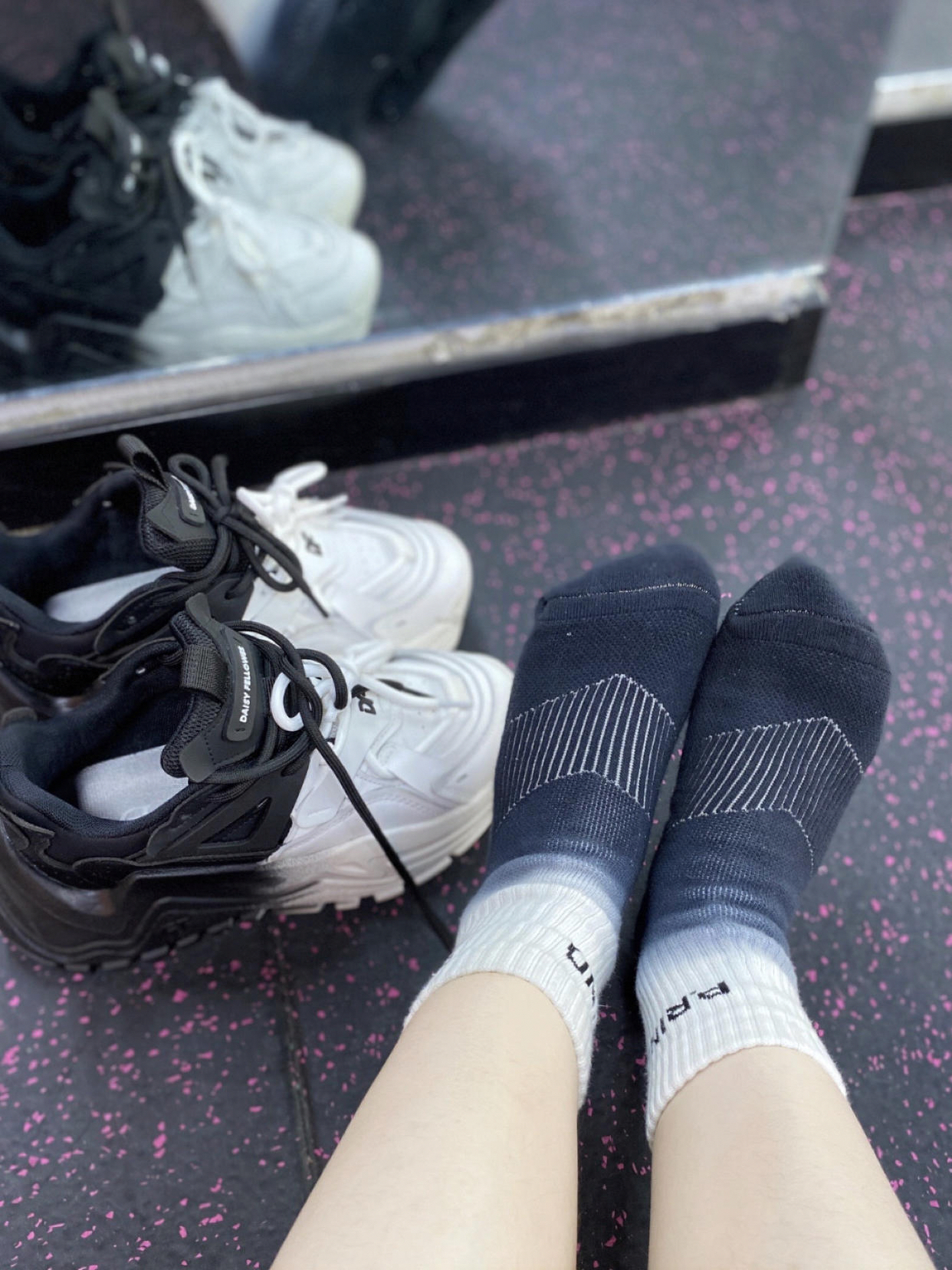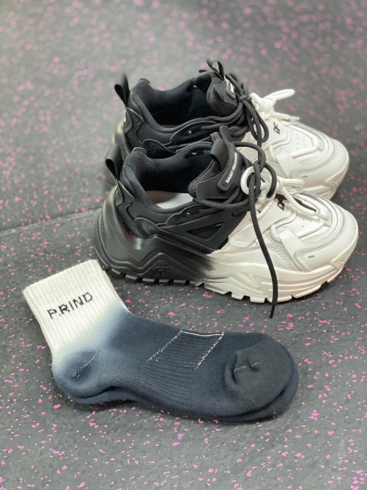 哇 今天鹤鹤得穿搭分享又来了 夏天要到了 背心 短裤穿起来了 今天搭配的鞋子是黛西法罗的老爹鞋 黑白拼接 帅气十足 袜子搭配的同样是渐变色 浦锐 黑白渐变扎染运动袜很好 毛巾面料的很适合我这种爱运动的女孩子 舒适透气 一年四季都能穿