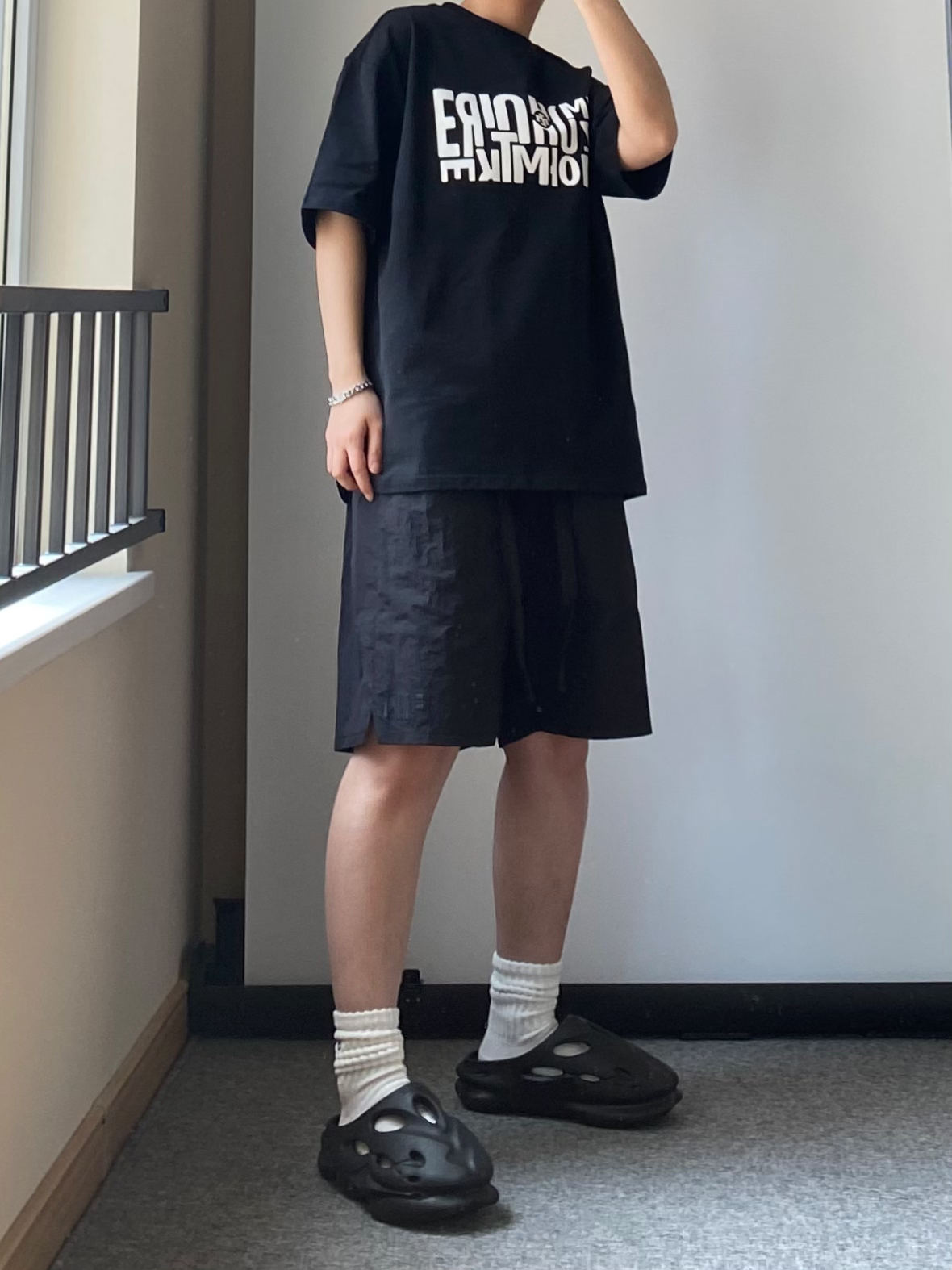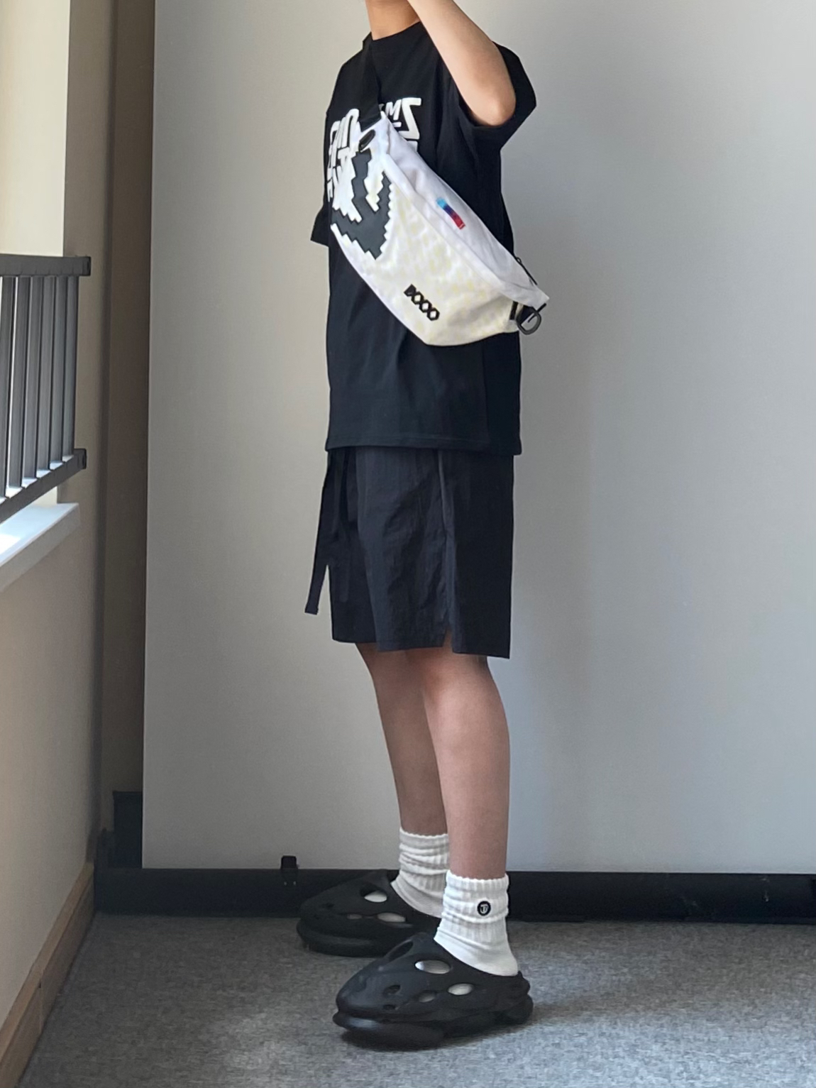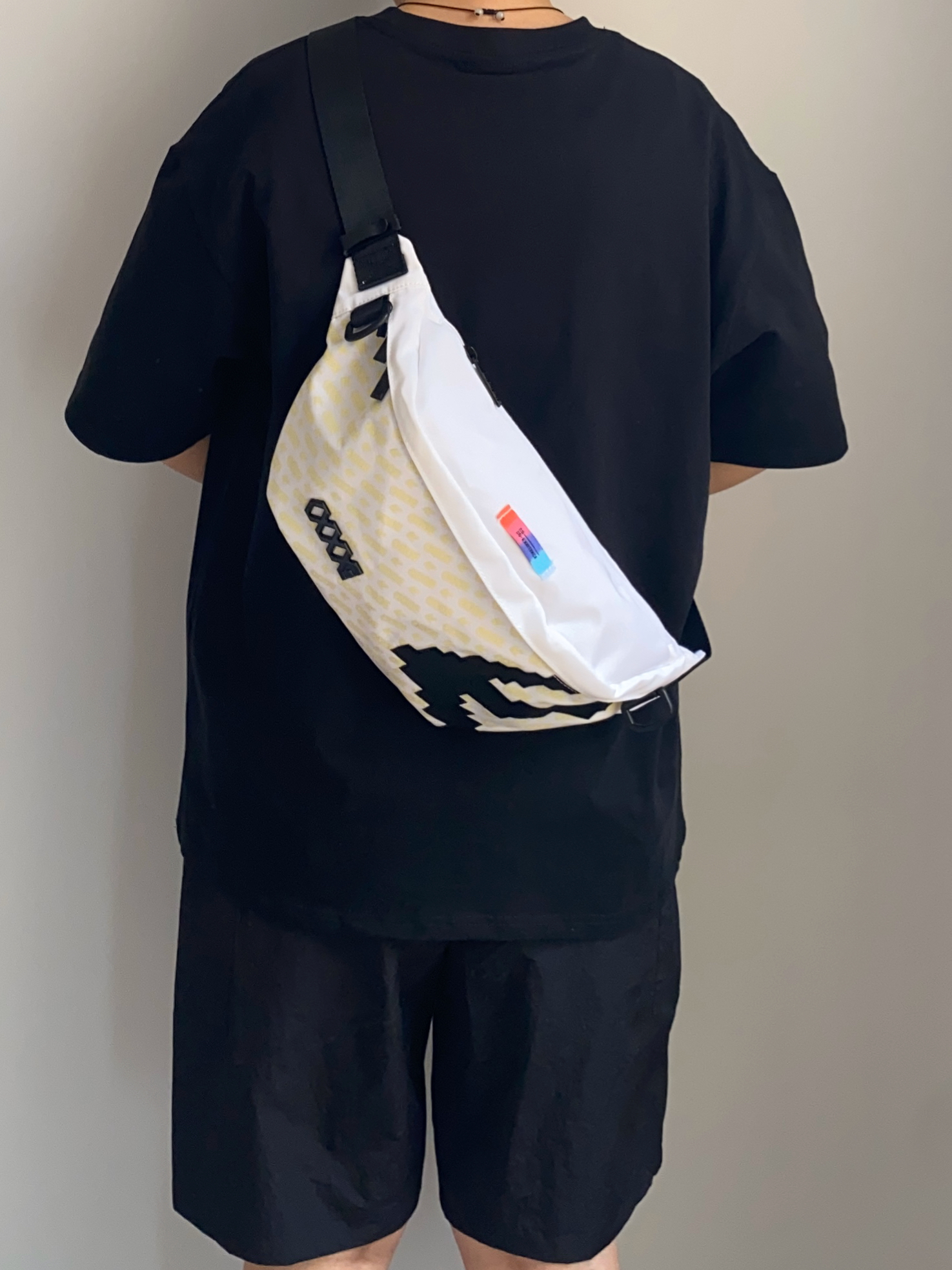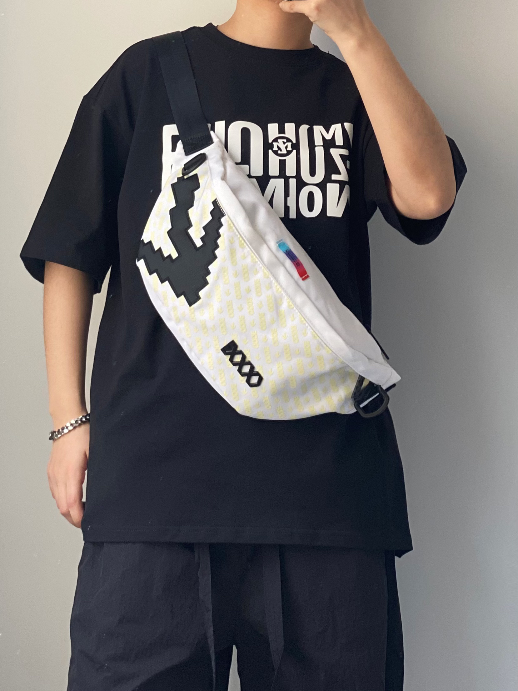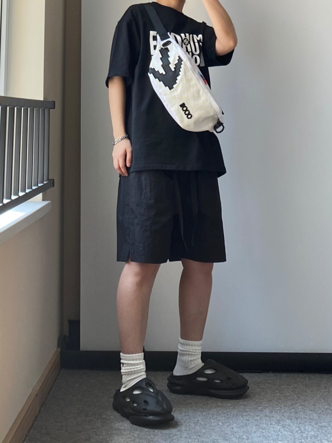 男生夏天这样穿 也泰帅了吧 黑色字母印花T恤+黑色速干短裤 鞋子搭配一双黑豹洞洞鞋拖鞋 还自带3cm的增高效果哦 五一出门当然少不了百搭斜挎包啦 这款白色系很适合夏天背 满印logo还自带夜光效果哦 作为520送给男朋友真滴不错 OF.I.W FANGIWEN EQLZ 🎒COEXISTENCE