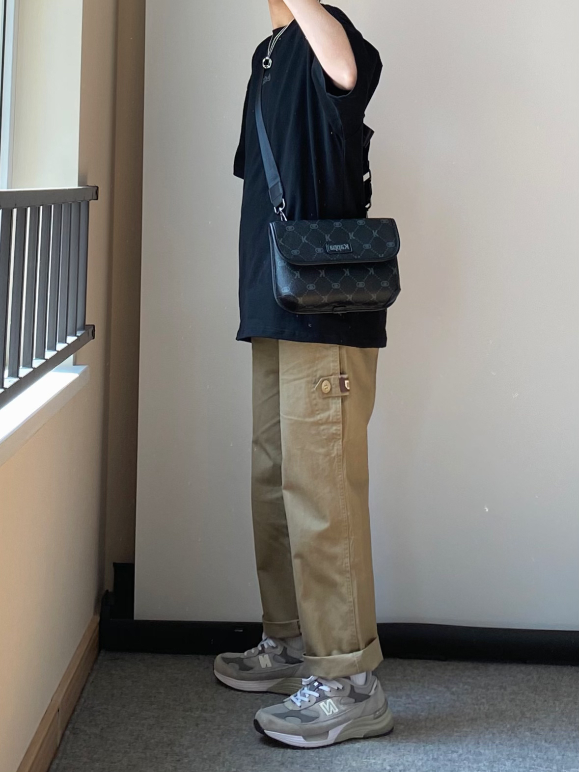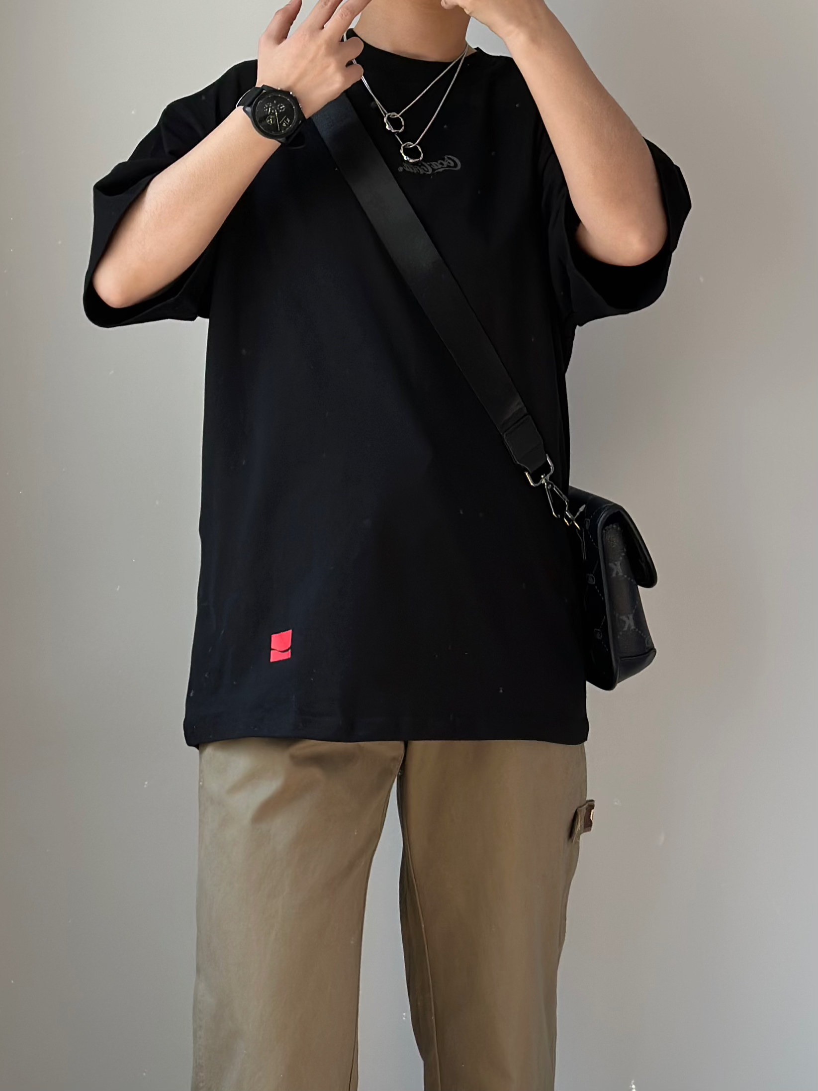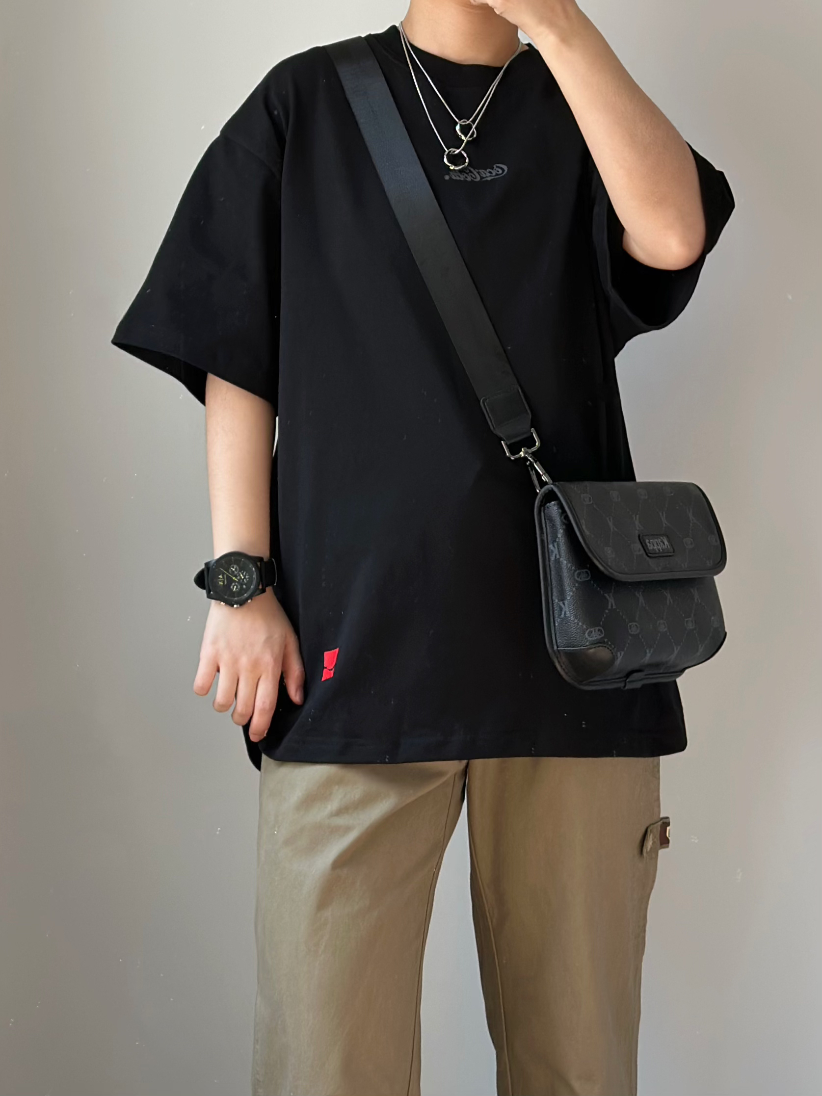 hello这里是皓月 今天分享一身很适合男孩子春夏穿 👔纯黑色的简约短袖T恤 ⌚️搭配一块三眼黑武士石英表 非常清爽的绿色指针设计 硅胶表带夏天戴起来不怕出汗 衣服裤子都是纯色系 👜可以搭配一个皮质的斜挎单肩包 增加细节感 👔Coca Cola 项链 cooraree 👖白告studio