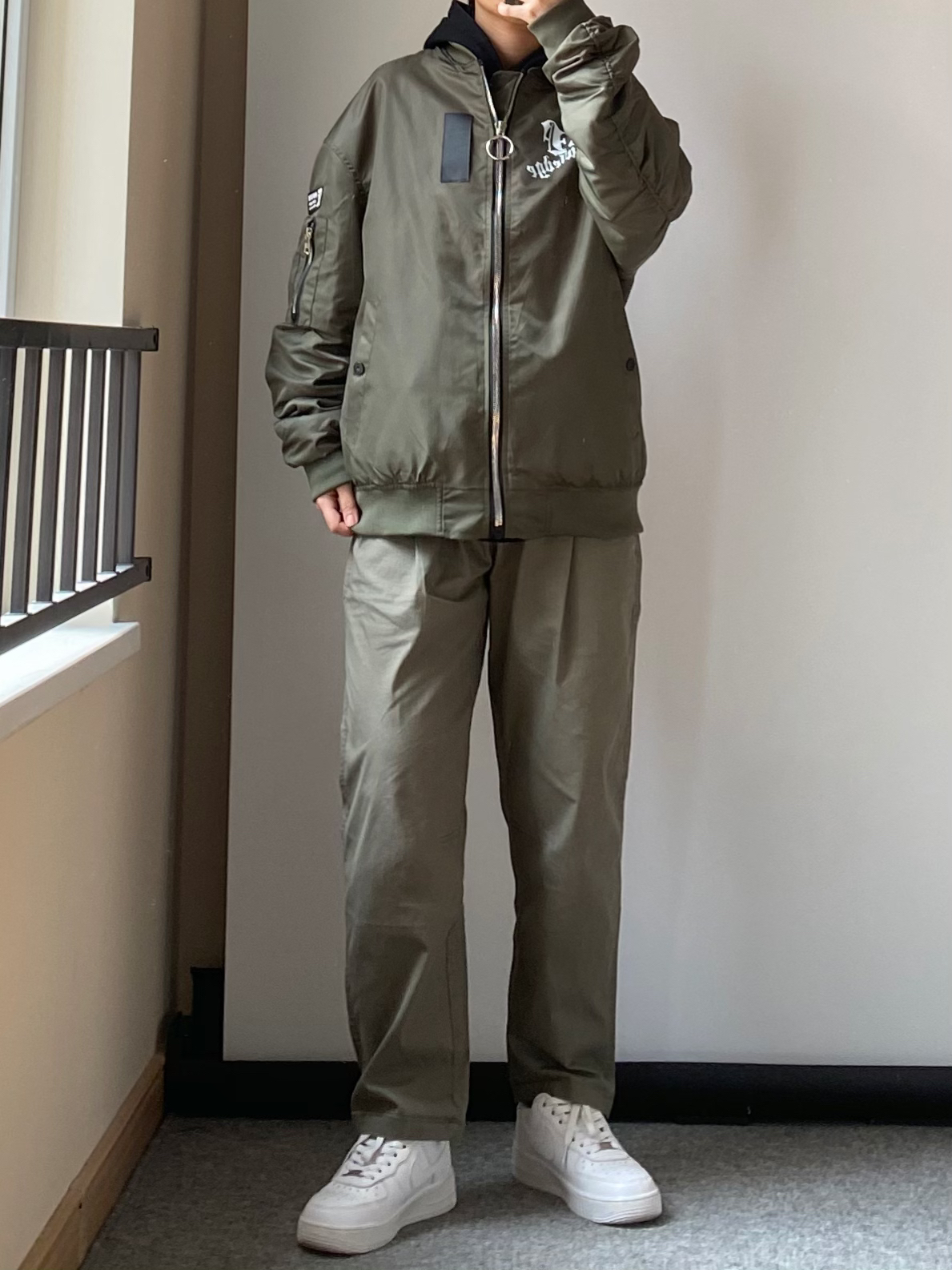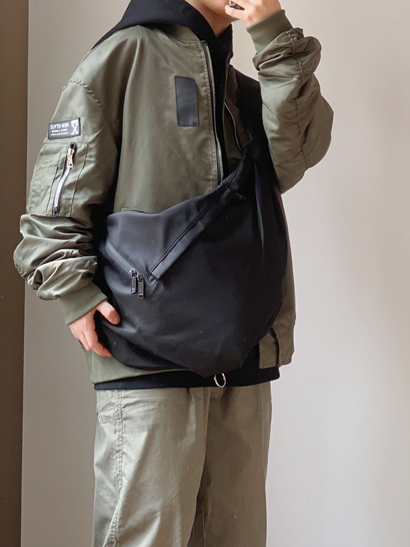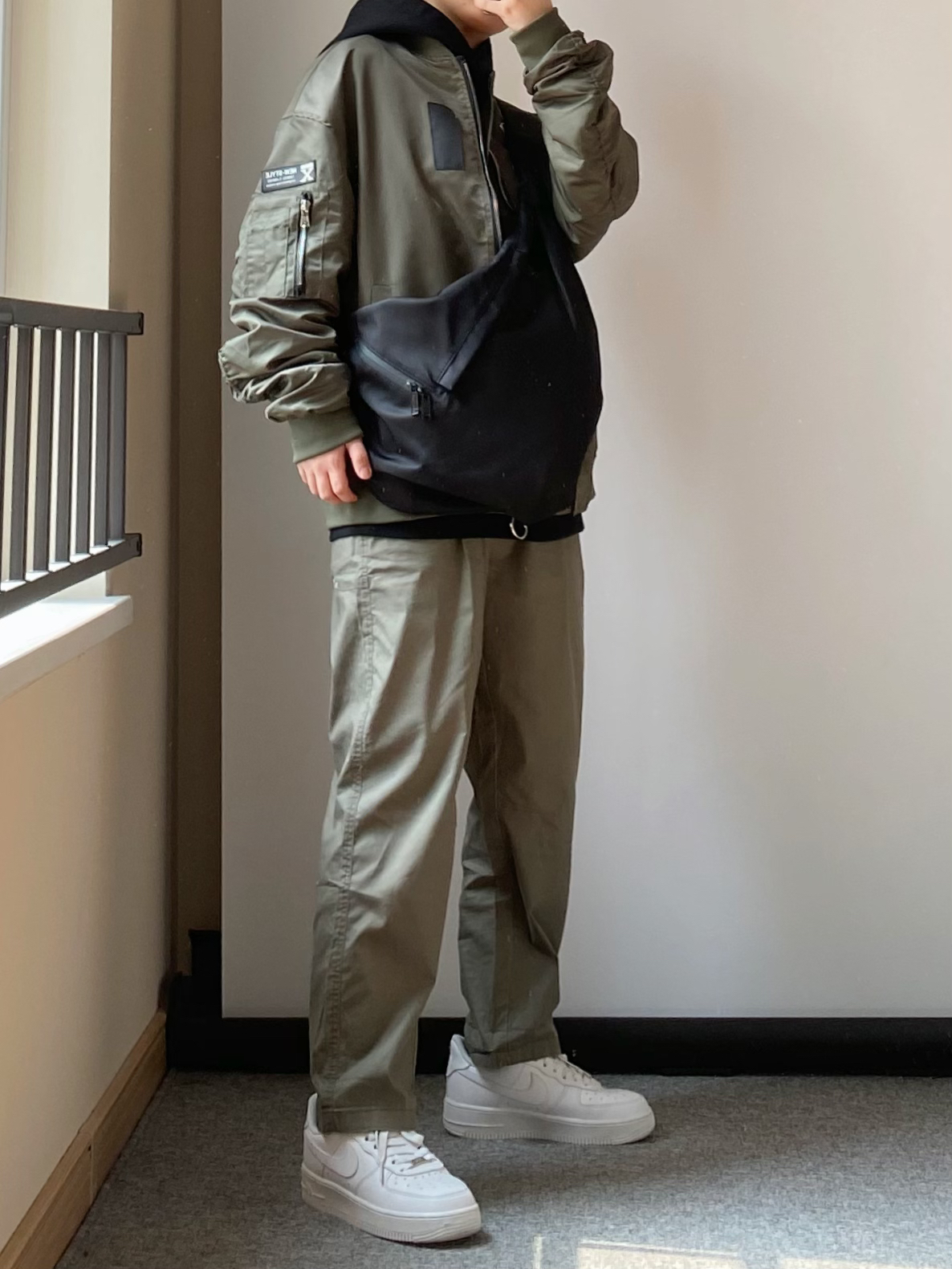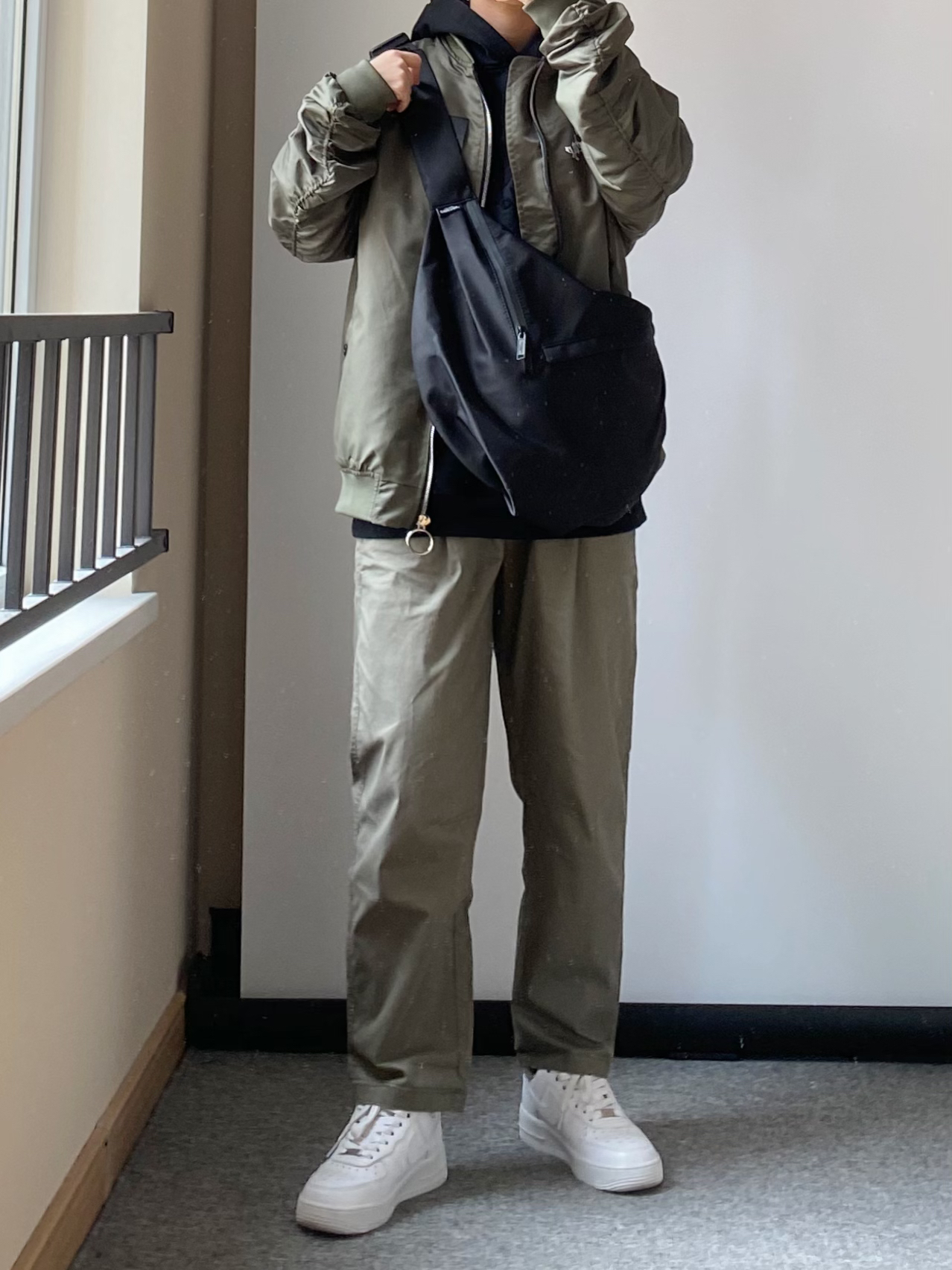 小个子男生特别适合穿的军绿色的飞行夹克外套 短板版型从视觉效果上可显腿长 搭配一条灰色直筒休闲裤 非常轻薄的面料 夏天也可以穿~ 春天出门怎么可以不背包包呢 这个黑色大容量饺子包的设计 真的好喜欢内里有小夹层平时出门要带的东西统统都可 以穿进去啦 👔UF9193 👖白告studio 👜MYEDITION