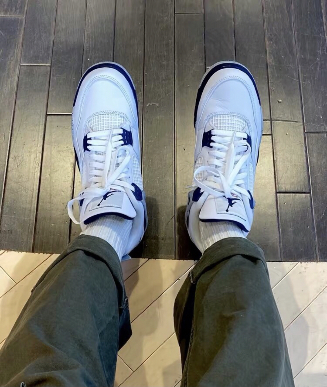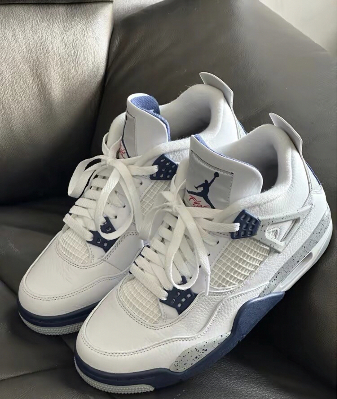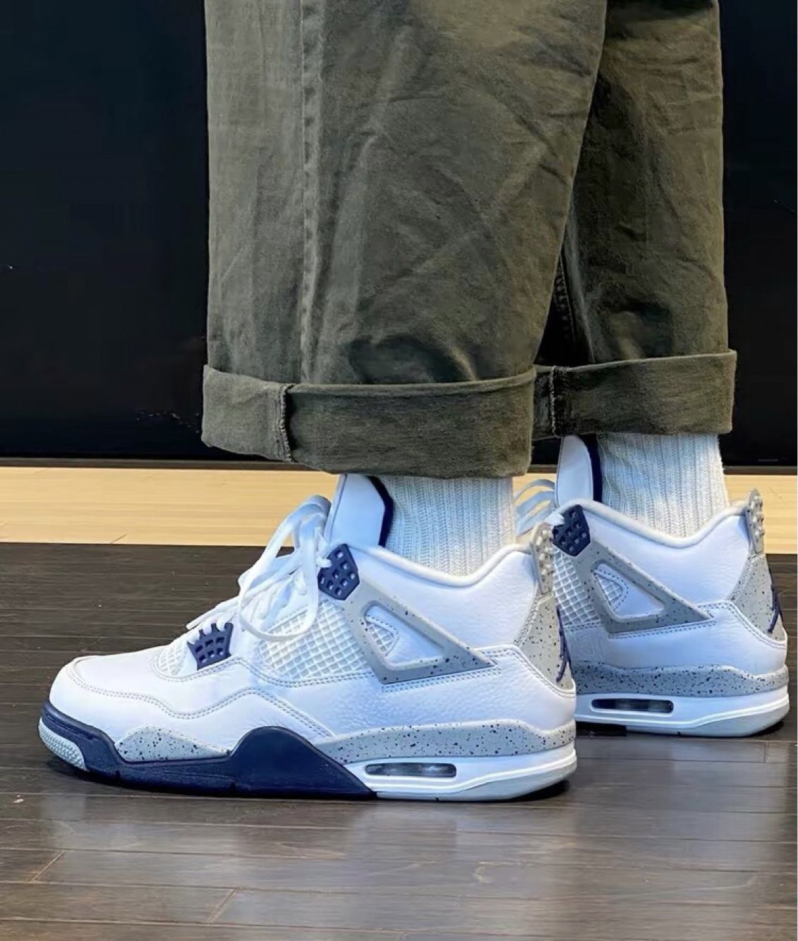 这双Air Jordan4 Retro是今年我觉得最“干净”的一双球鞋,大面积的白色色块,呈现出满满的少年感气息。 灰色和海军蓝点缀,让这双AJ4层次感更丰富,荔 枝纹皮革提升了整体的质感,但AJ4两边还是有夹 脚的通病,建议买大半码或一码