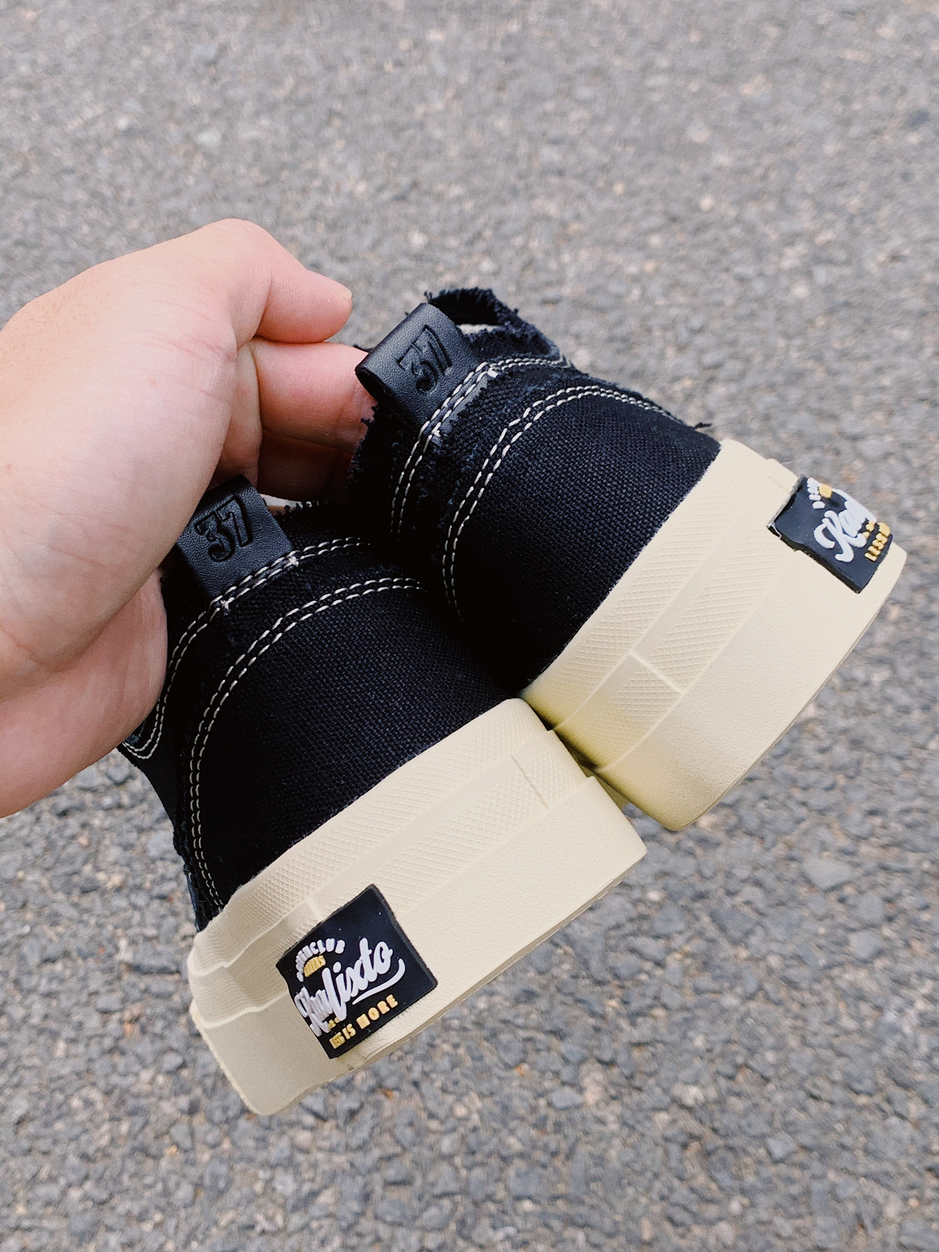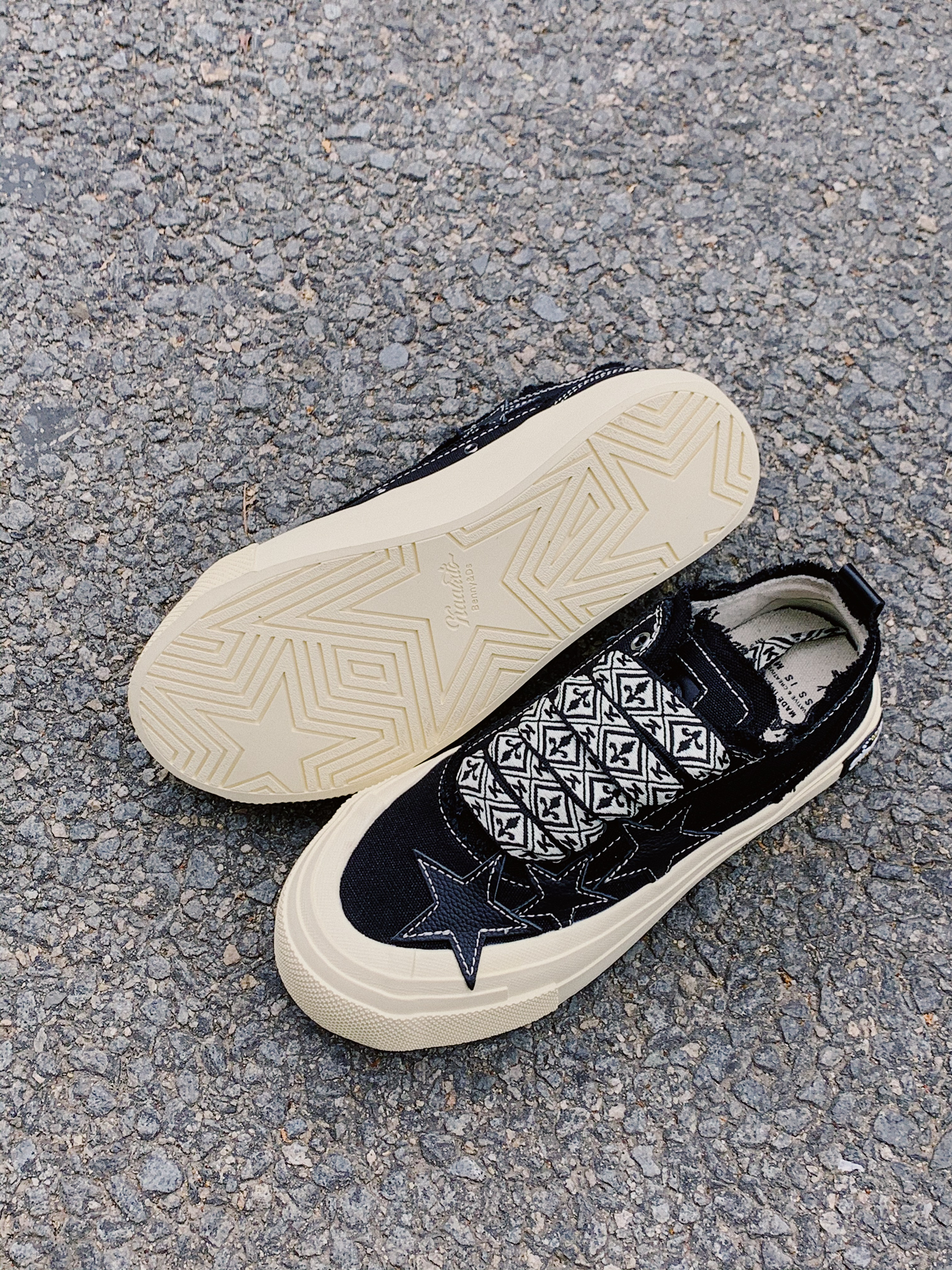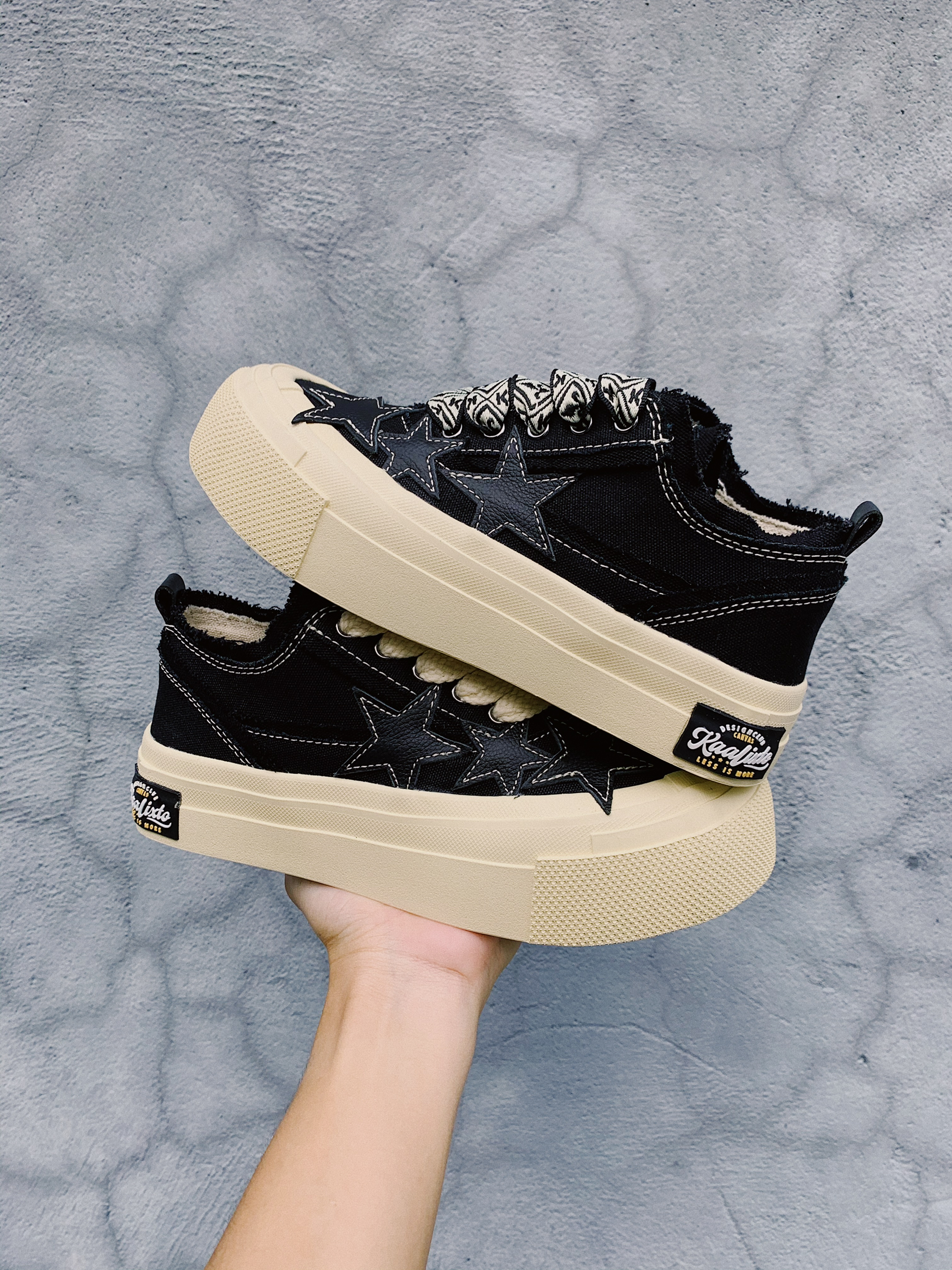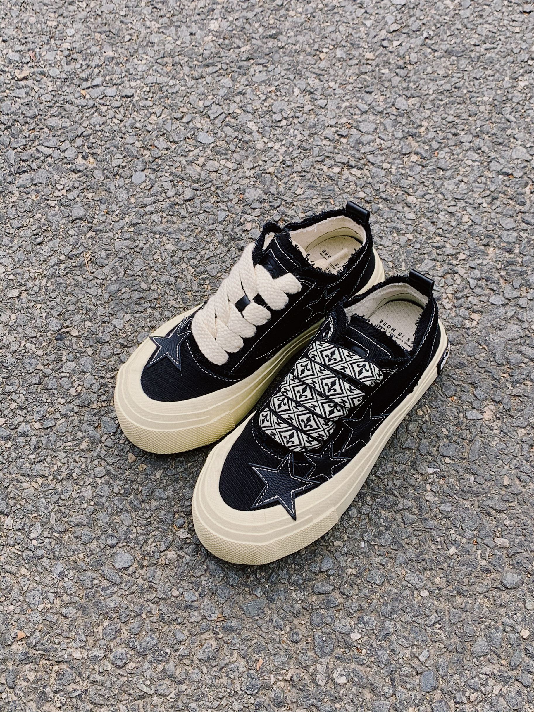 "LESS IS MORE" 大复杂的不适合做搭配, 大普通的又不显得有意思。 推荐一个不会错的520送礼选择。 帆布的材质鞋面,刚好现在这个季节就可以穿, 皮革的小星星非常俏皮可爱。 鞋子看着简约,实则藏着丰富的细节: "破坏”的毛边很有趣, 不规则的鞋带孔设计很有意思, 并且还有两幅鞋带,一副纯色一副图案, 可以组成两种完成不一样的风格。 —层层包起来的鞋底造型,增高又很耐穿。