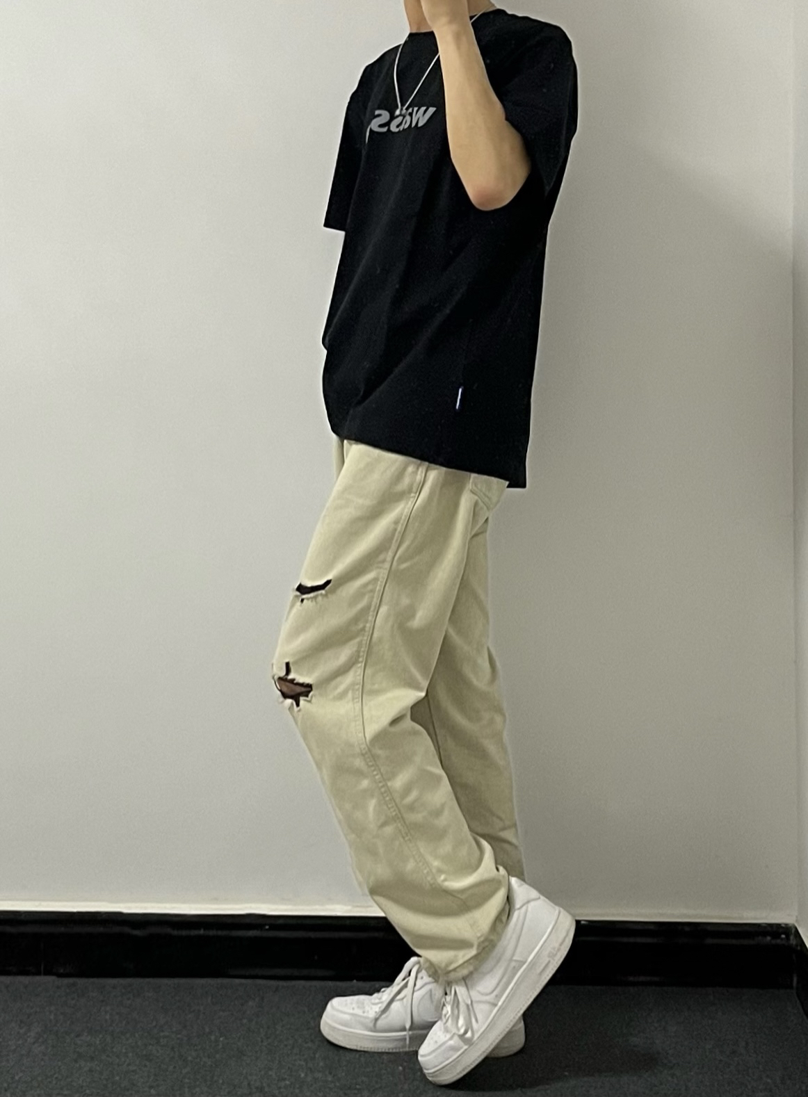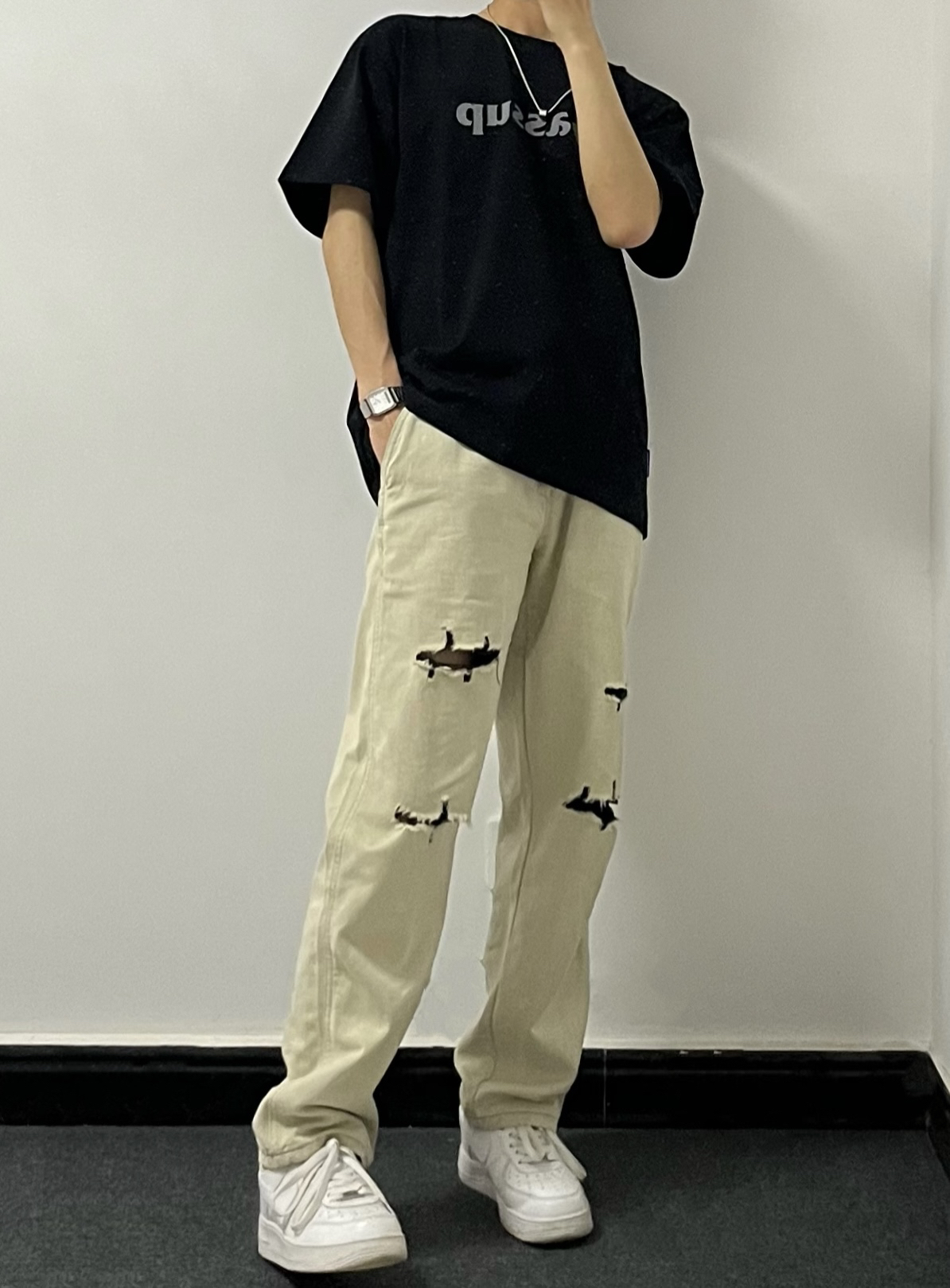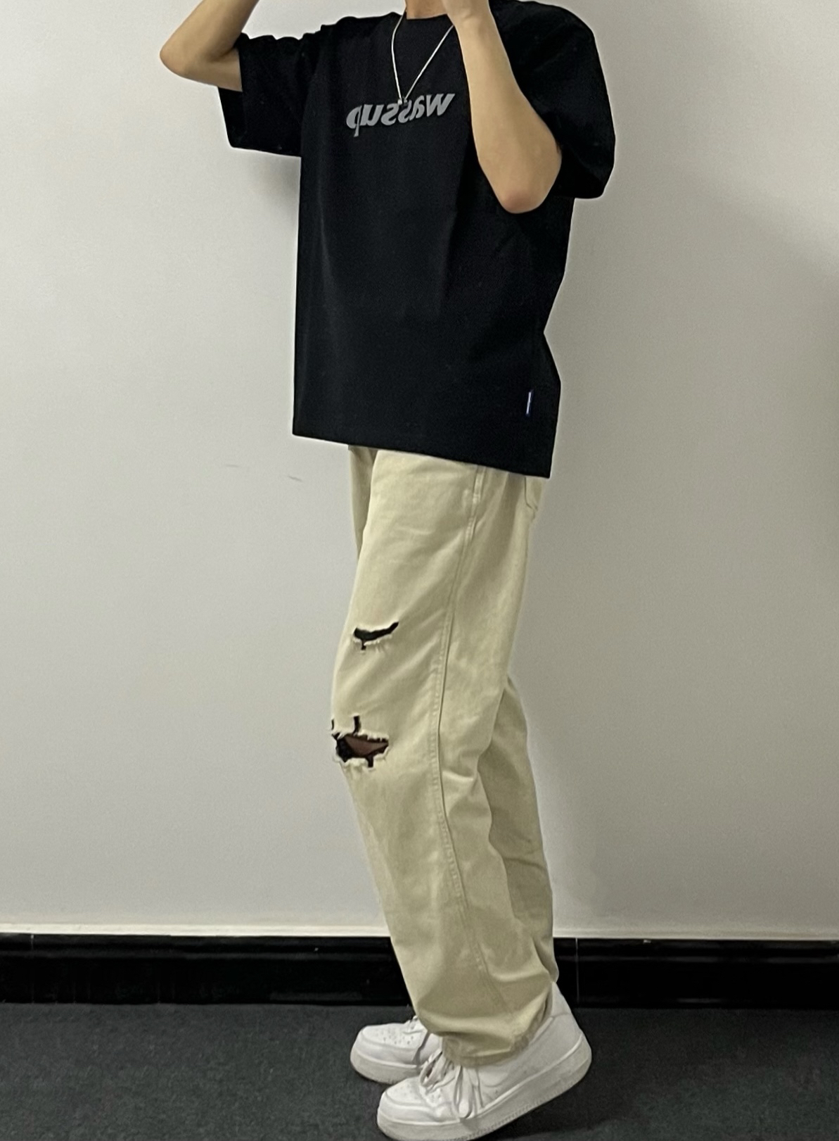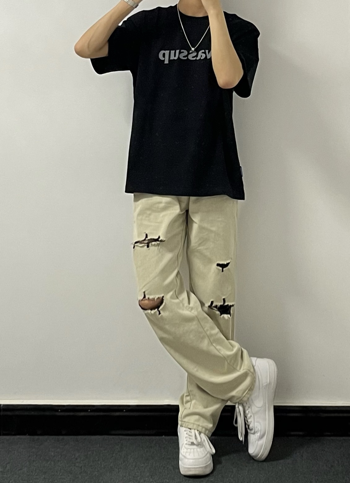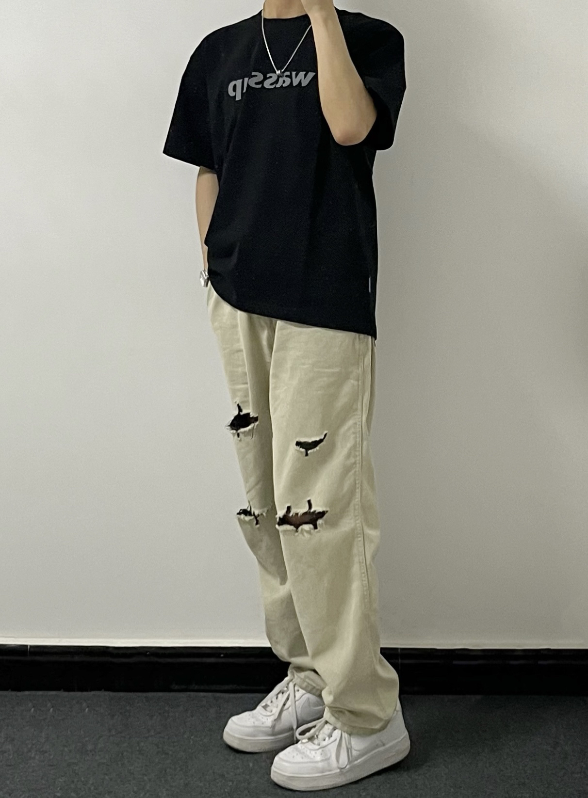 - 黑色基础wassup短袖版型很正~ 面料适中,夏天穿也不会感觉热耶✌️ - 这条白绿破洞牛仔裤简直了‼️ 这不就是专门为细狗男生量身定制吗😬🐶 - 再搭配一双纯白色的空军一号 妥妥的帅就完事了哈🥤 👔:黑色基础短袖 👖:白绿破洞牛仔 👟:空军一号 关注小王同学,分享更多实用穿搭~