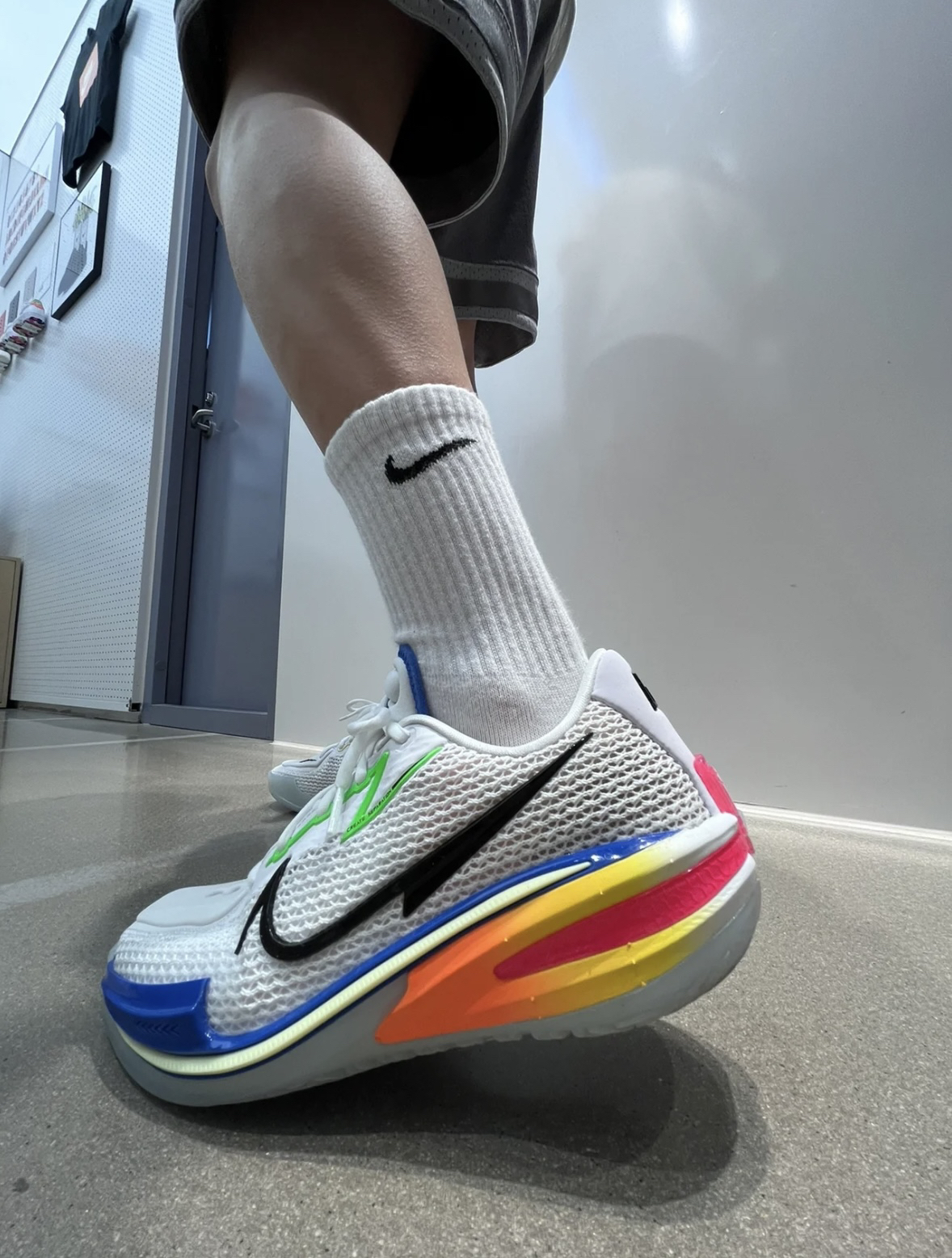 原价拿下的41GT CUT!! 买回家将近 ⑦个月,终于上脚实战了 因为是和同事约下班过后打球,挤地铁不方便,就直接穿着上了一天班。 颜值直接拉满,无可挑剔 但是中午开始脚背就有明显的压迫造成的疼痛感! 加上新的橡胶鞋垫,穿普通长袜摩擦系数大,脚底也明显的疼痛,以至于下午实战前换了双篮球精英袜,有所缓解 。 鱼和熊掌不可兼得,精英袜虽然更厚,包裹更强,但同时造成前脚背挤压愈加明显!! !!实战:场...