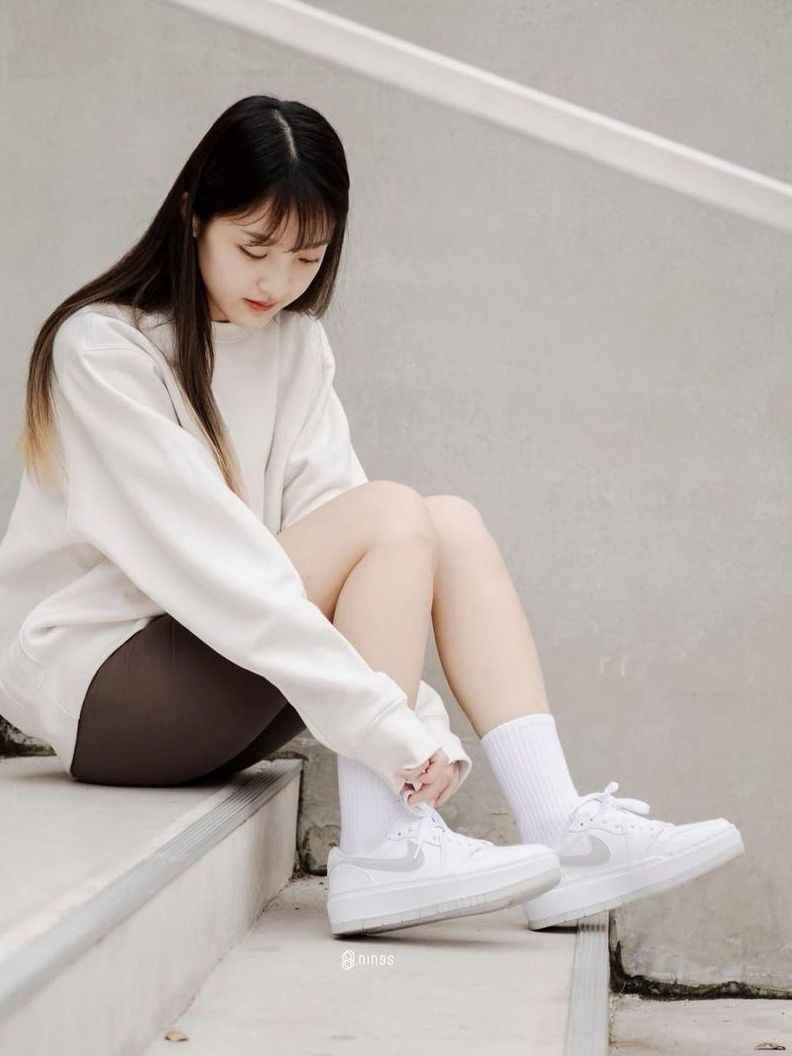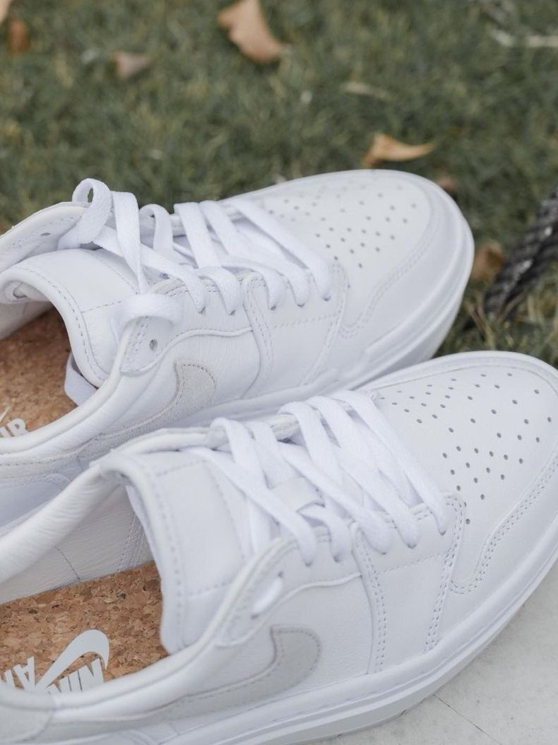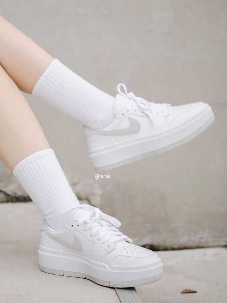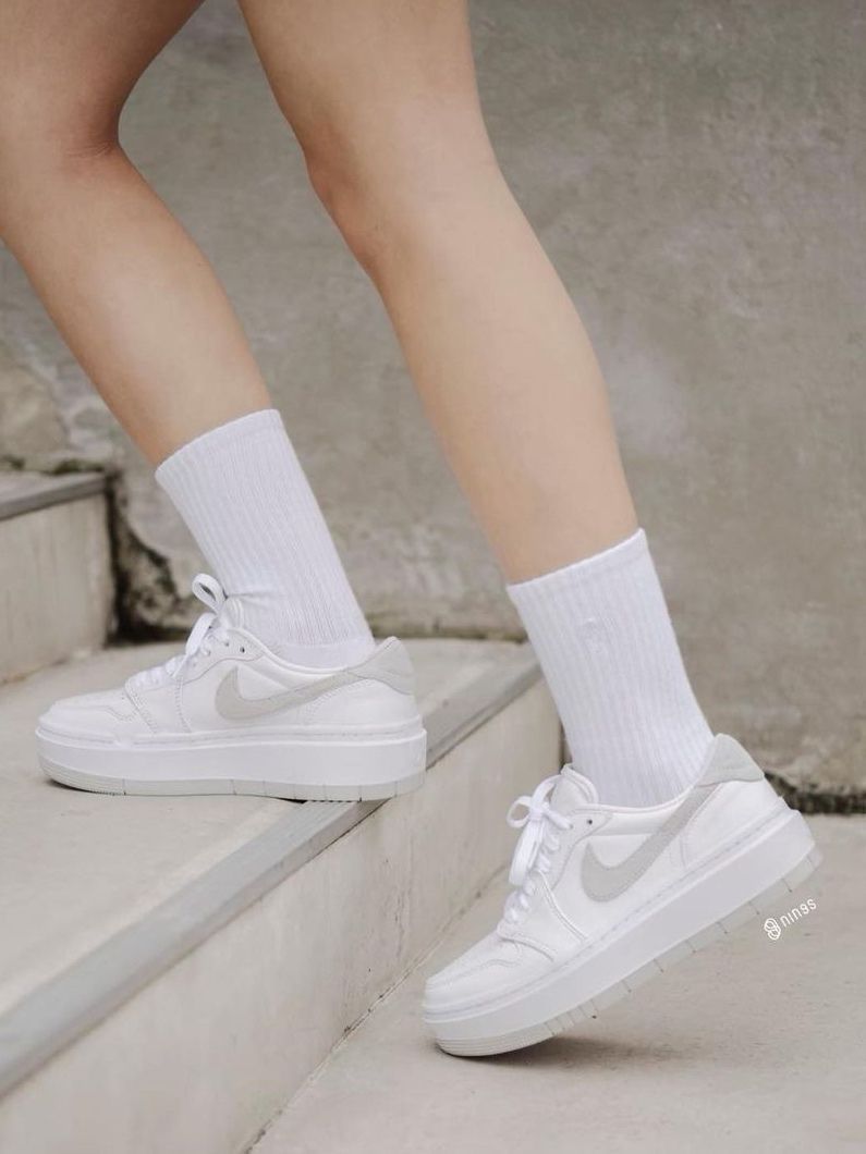 👟Air Jordan 1 elevate 厚底鞋 💟在AJ1 low低帮的基础上,增加了中底的厚度。让一双平底鞋变成了增高鞋,鞋子是白色皮革搭配灰色麂皮的材质,质感也很好 ☮️鞋子增高效果大概5cm左右,夏季搭配短裤还是很好看的,白灰的配色夏季上脚也比较显腿白的一双鞋 ✝️鞋子采用软木塞材质的鞋垫,上脚的脚感也变得柔软有弹性,小个子女生的夏日福音~
