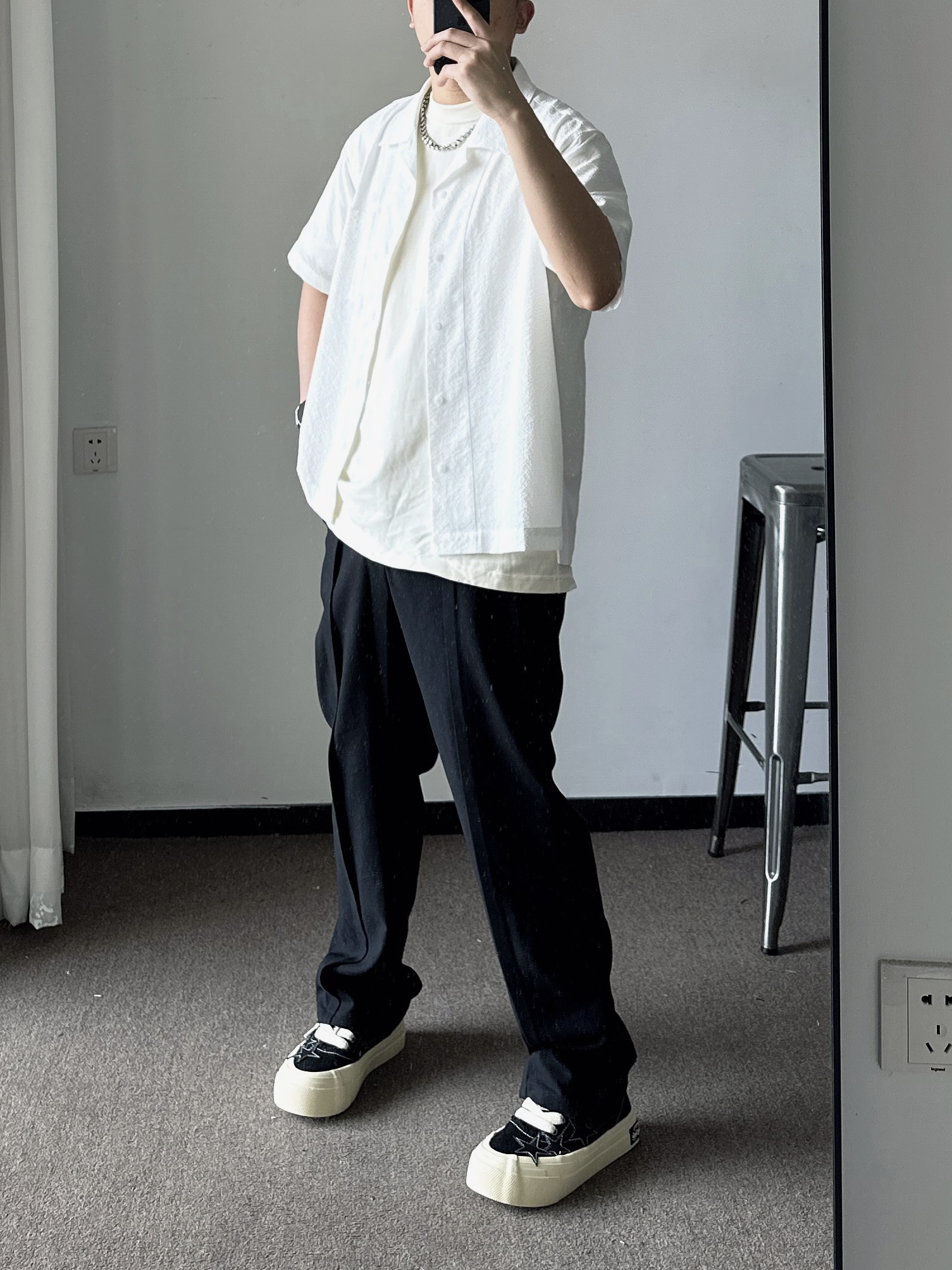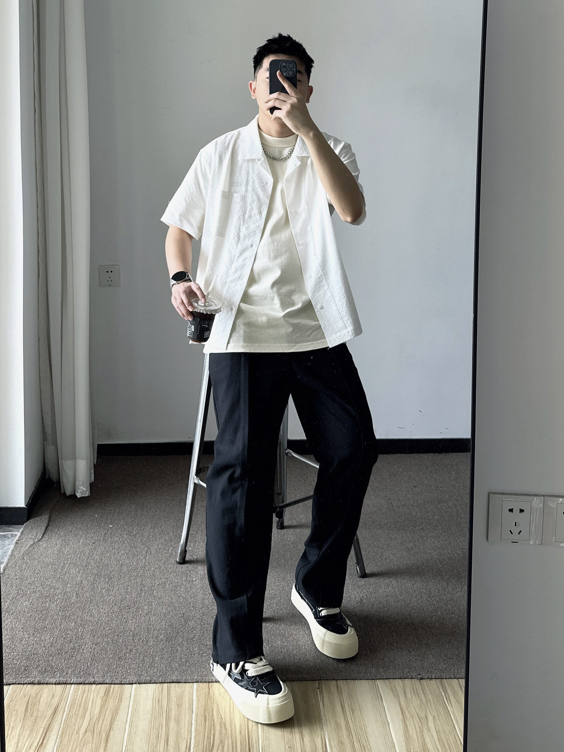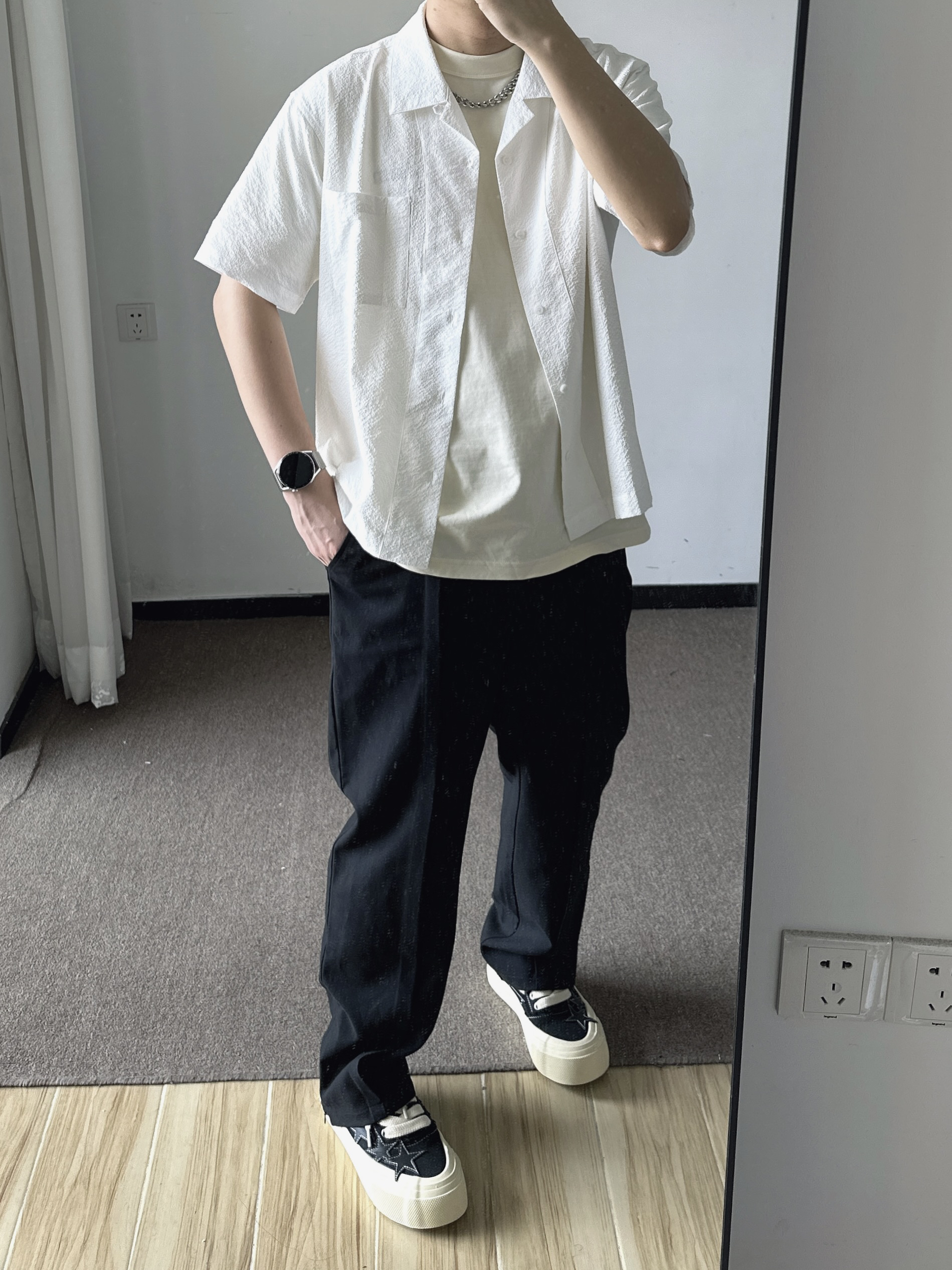 素人也能好看系列~ 174cm/65kg 🧥- 就算天气热了还要叠穿,泡泡棉外搭足够轻薄就好。 👖- 偏宽松的裤脚,能把大鞋楦的鞋子修饰好。 👟- 经典的黑白色,做旧中底简直最爱。帆布鞋做了一个不小的鞋楦,就得穿的微喇或者裤管宽松的搭。