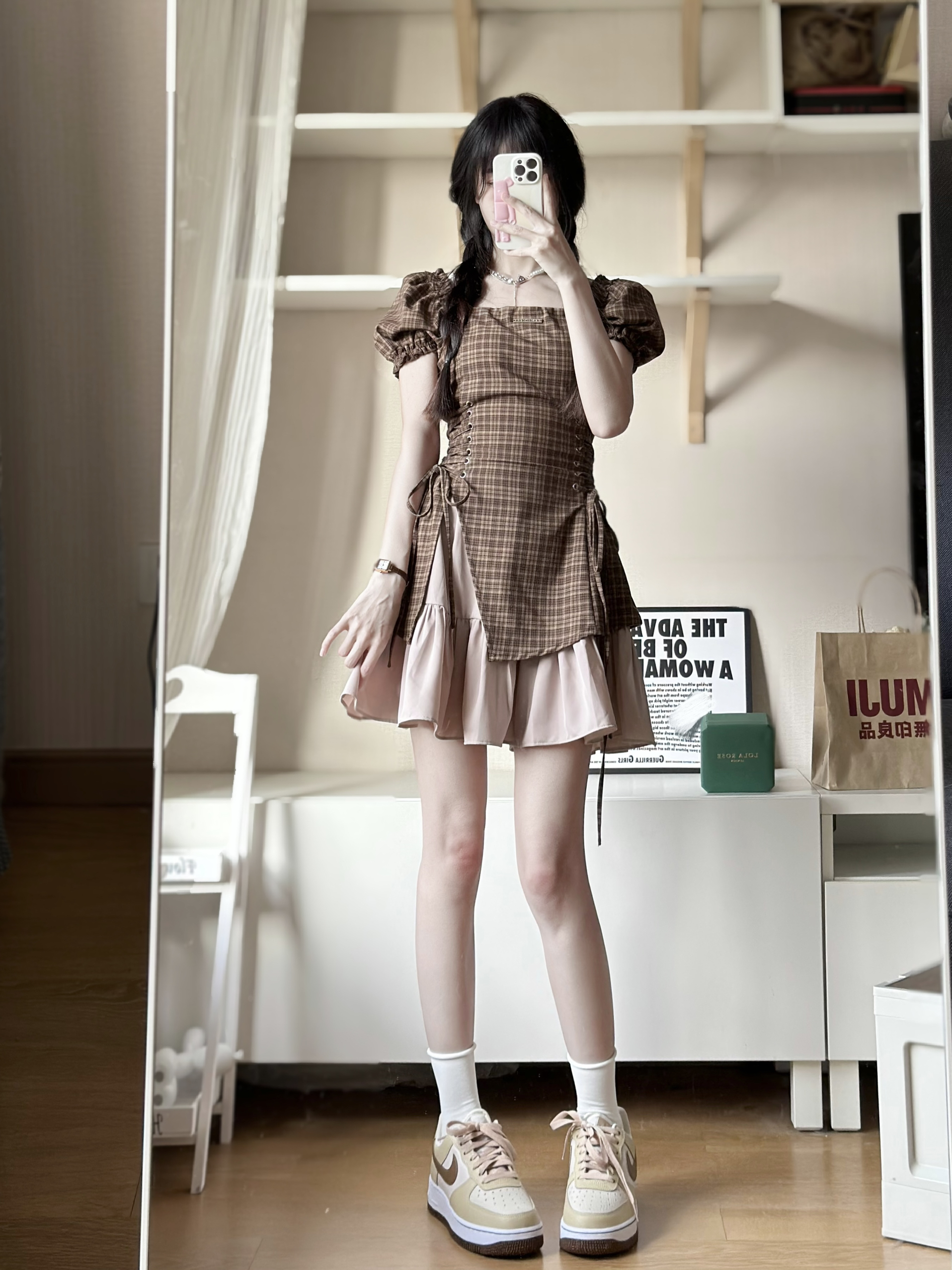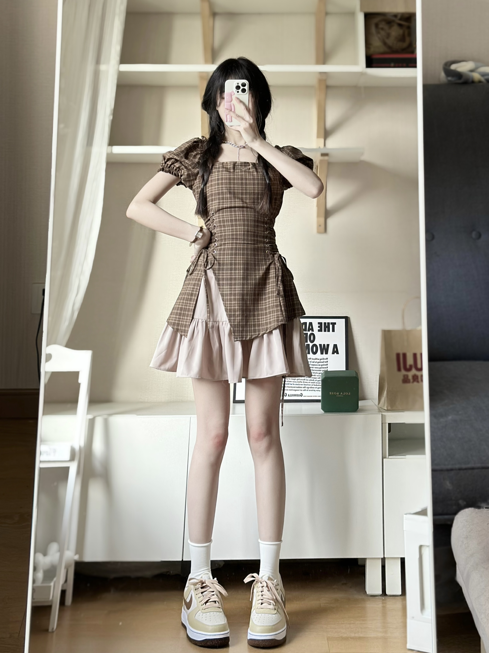 身高|体重: 🧍♂️ 穿搭风格:棕色系约会穿搭 👖 下装:棕色格纹连衣裙 👟 鞋子:啤酒棕空军一号 🎒配饰:小棕表
