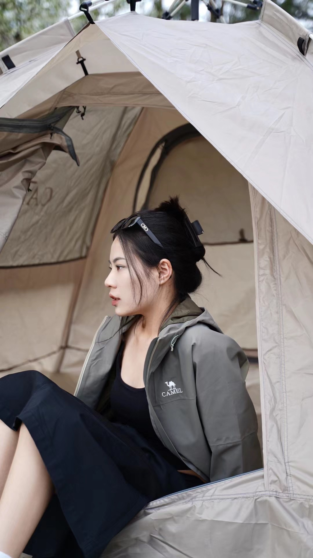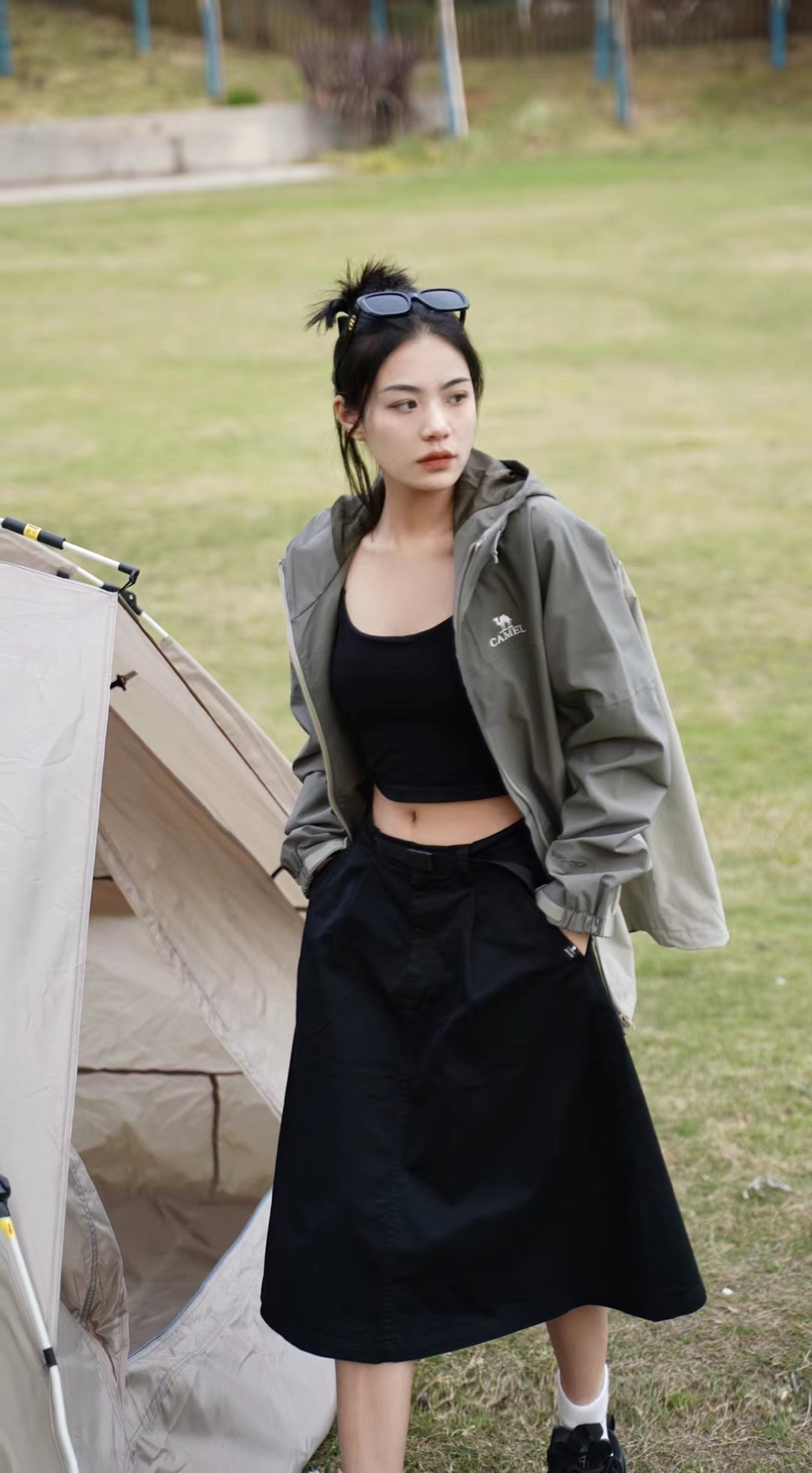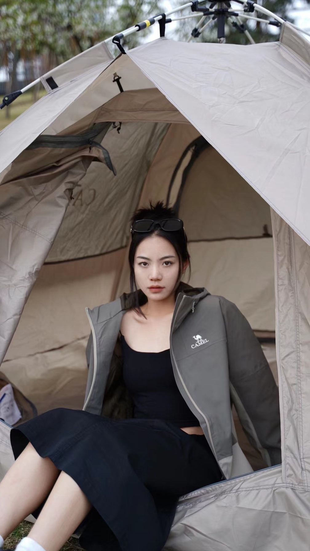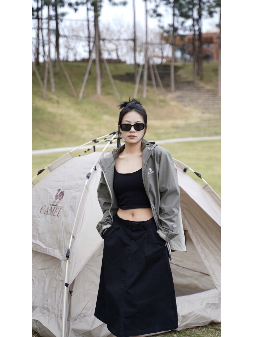 女生户外穿搭可以看过来啦~ 肯定很多宝子不知道骆驼除了服饰 还有帐篷!户外露营设备也不在话下⛺️⛰️ (关键是便捷,不需要手动搭,自动折叠敲方便!) 一起看看今日份露营的穿搭🔥 与帐篷同色系的深色搭配会更加潮酷! 拼色冲锋衣➕A字半身裙,又酷又飒! 露营主打的就是一个舒适度🤨 无论是着装方便还是露营装备都得选优质🆒🐛