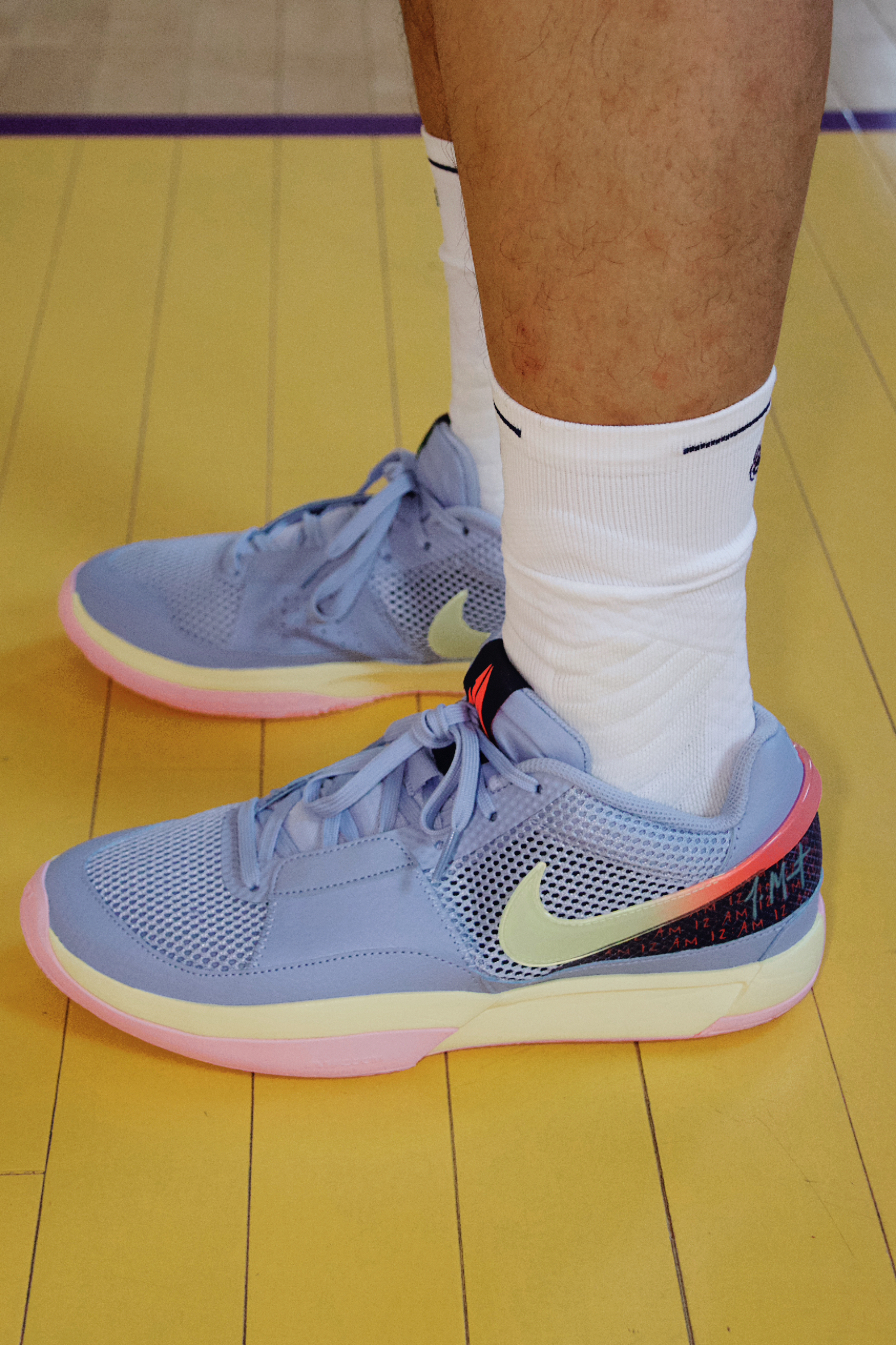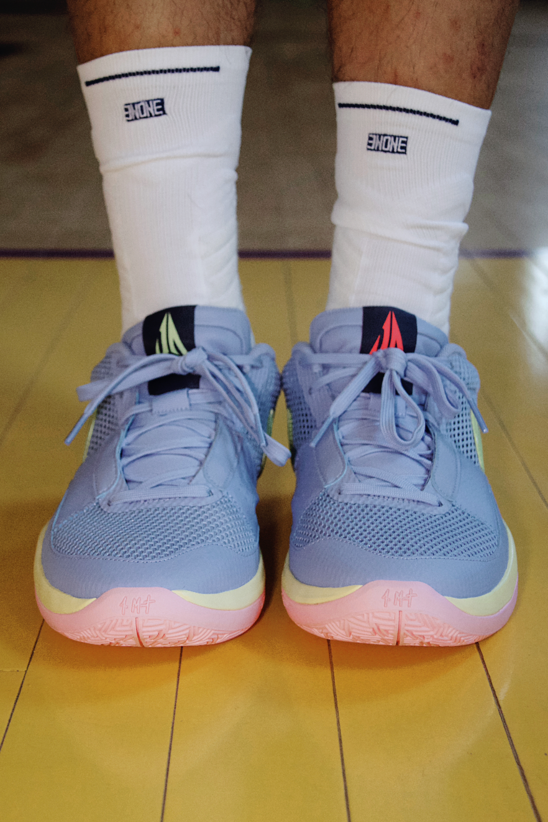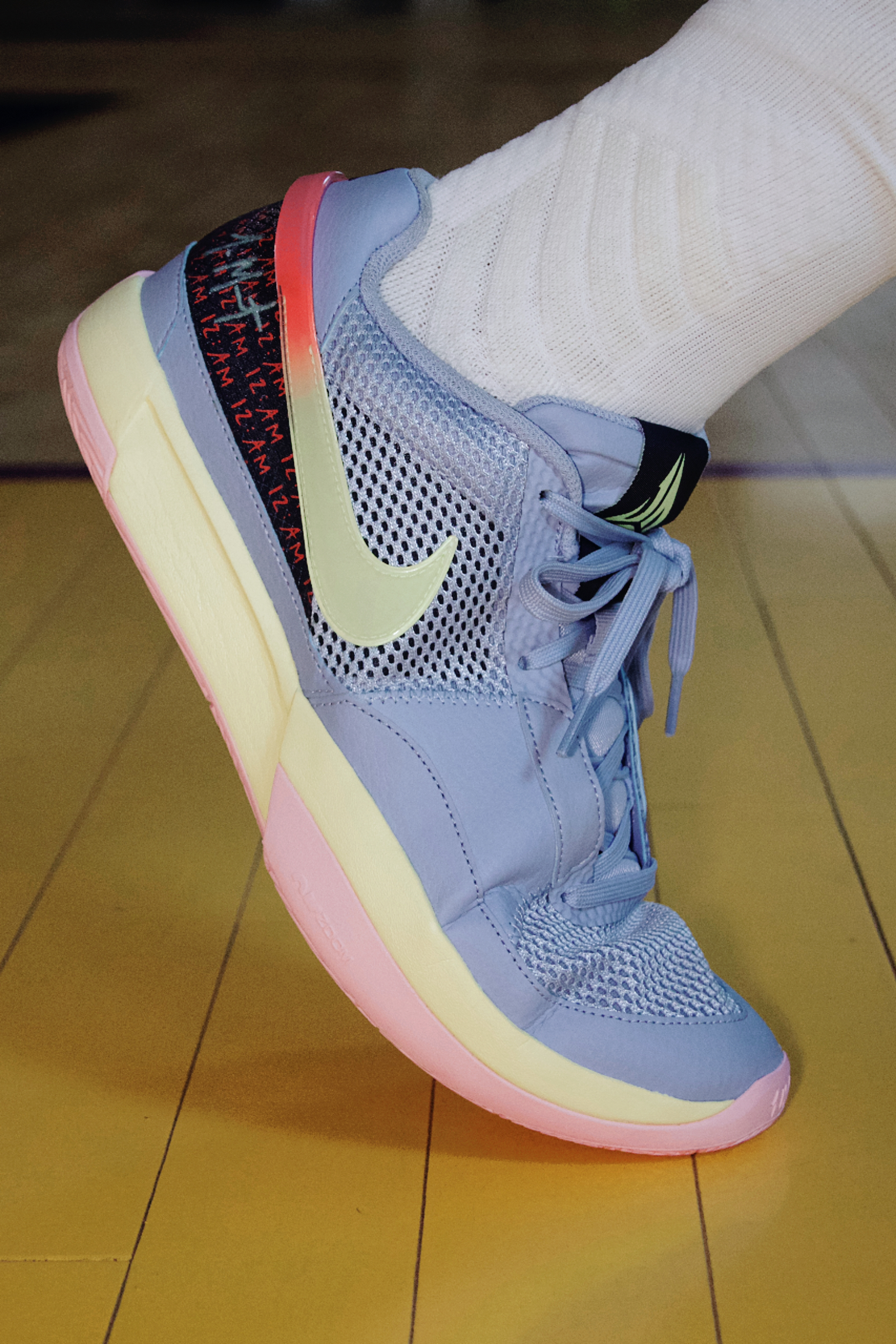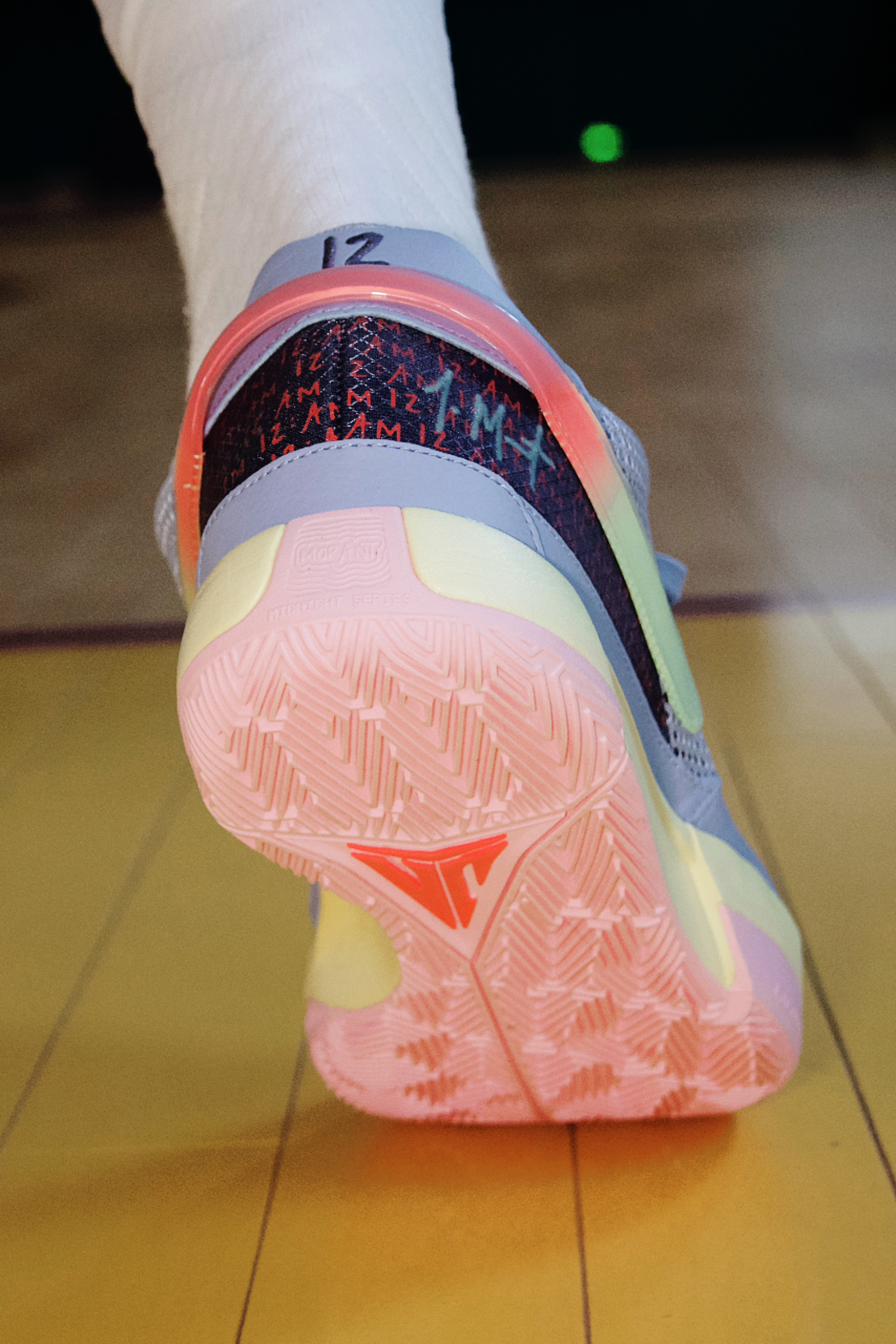 细节方面鞋舌两只脚的个人 LOGO 是不同颜色的,内侧分别是 JA 和 12 的字样,外侧环绕型渐变的钩子果冻感十足,后跟皮革上 12 的刺绣一深一浅,下方的大底上也印有了 莫兰特 的字样!中底内侧印有了她女儿的名字,往前看还印有类似于从头开始的英文。