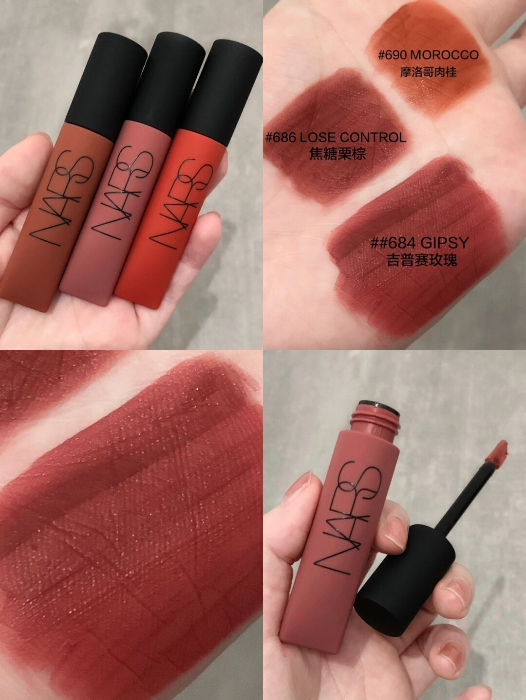 本篇笔记关联了NARS/娜斯 空气柔雾唇霜 哑光 7.5ml 684吉普赛玫瑰GIPSY、NARS/娜斯 空气柔雾唇霜 哑光 7.5ml 686焦糖栗棕LOSE CONTROL、NARS/娜斯 空气柔雾唇霜 哑光 7.5ml 690摩洛哥肉桂MOROCCO等商品,为用户提供真实的使用体验和购买参考。