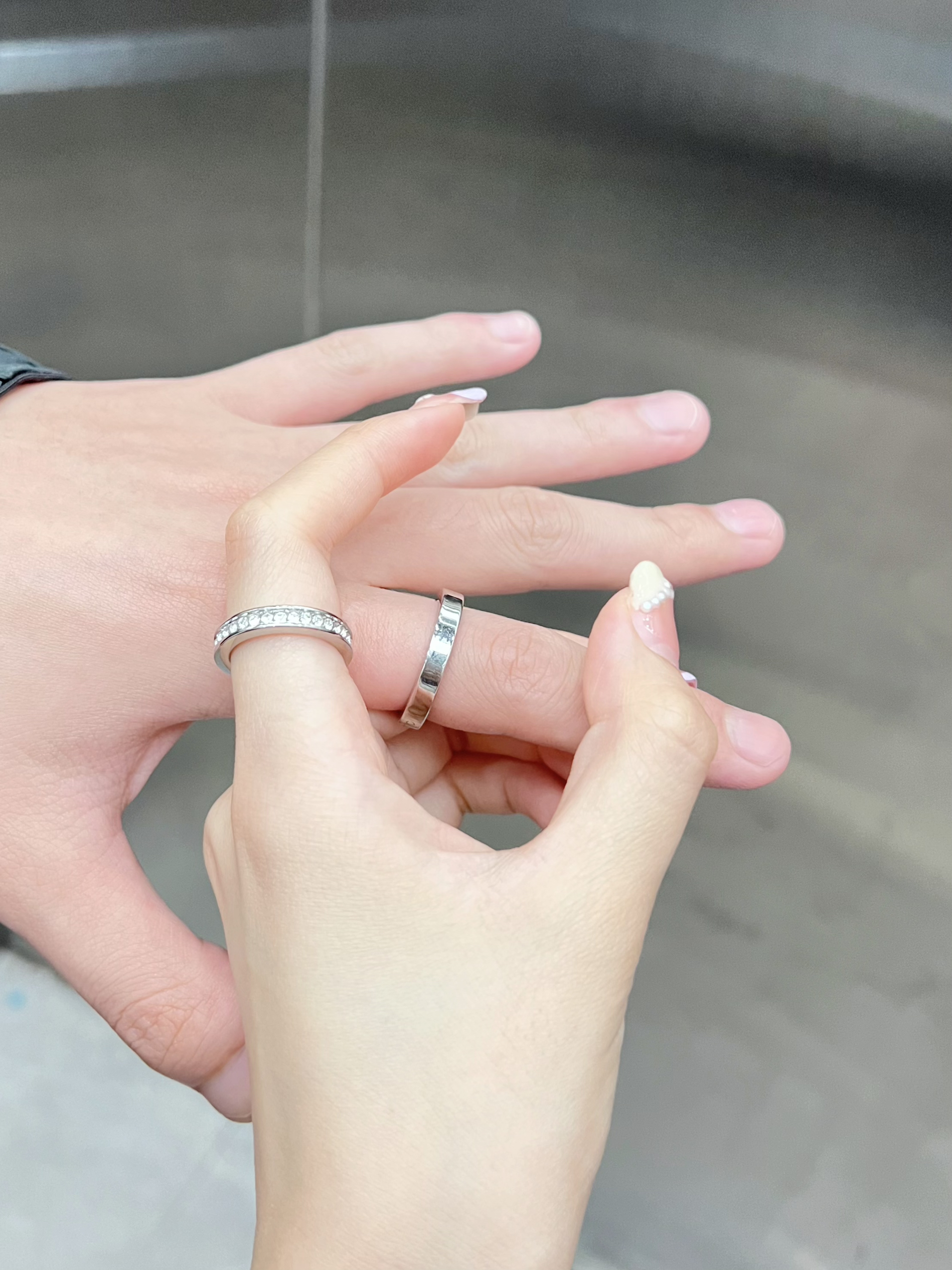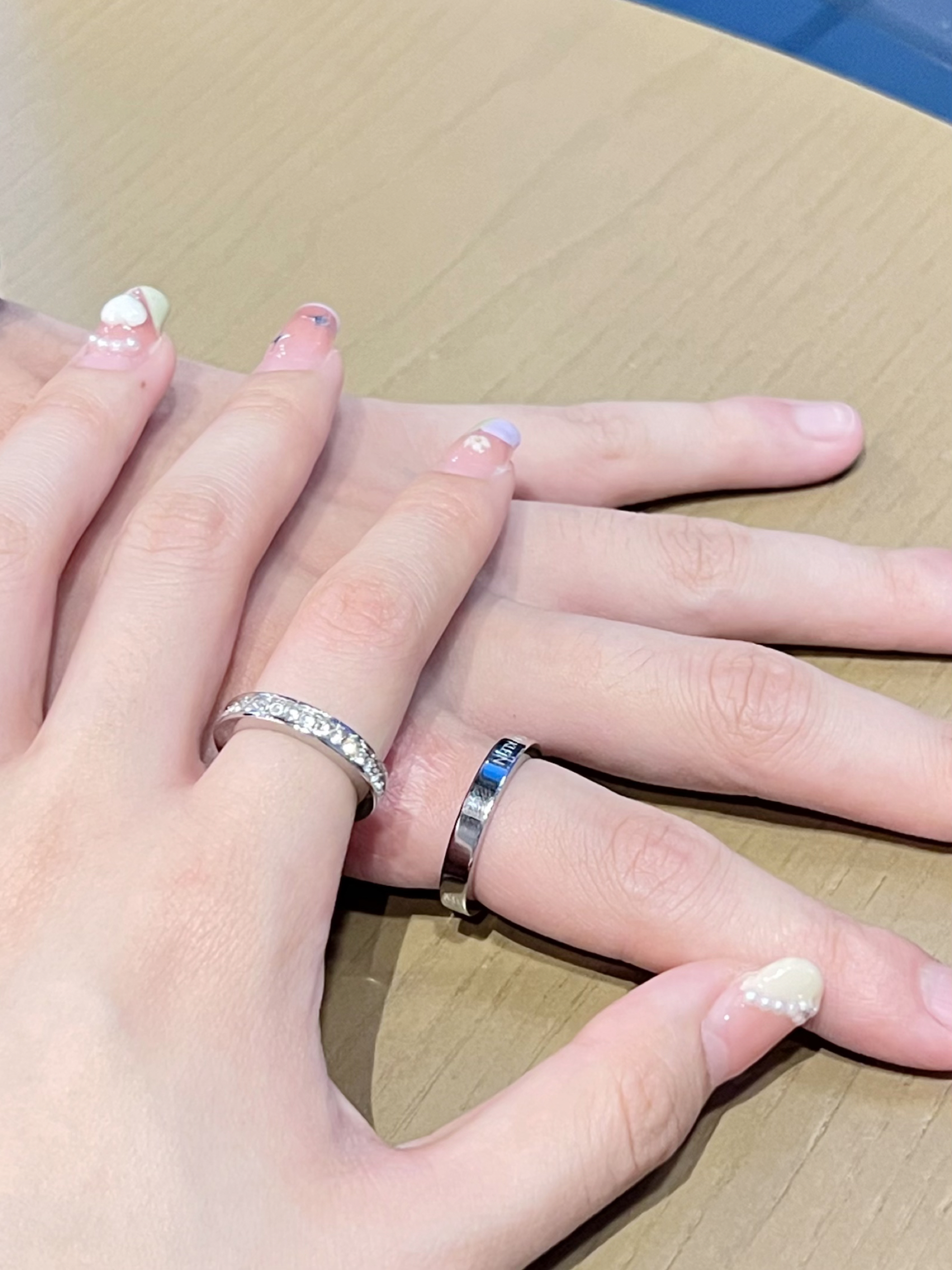 收到了男朋友送的纪念日戒指💍 女款满天星✨真的好闪呀 上手真的好显瘦显手细长呀 哪个女孩子能拒绝呢🥰 男款是带logo的素圈 男朋友说带上低调又很有档次 情侣当然要戴情侣戒指呀💕 快和你的对象一起戴吧~