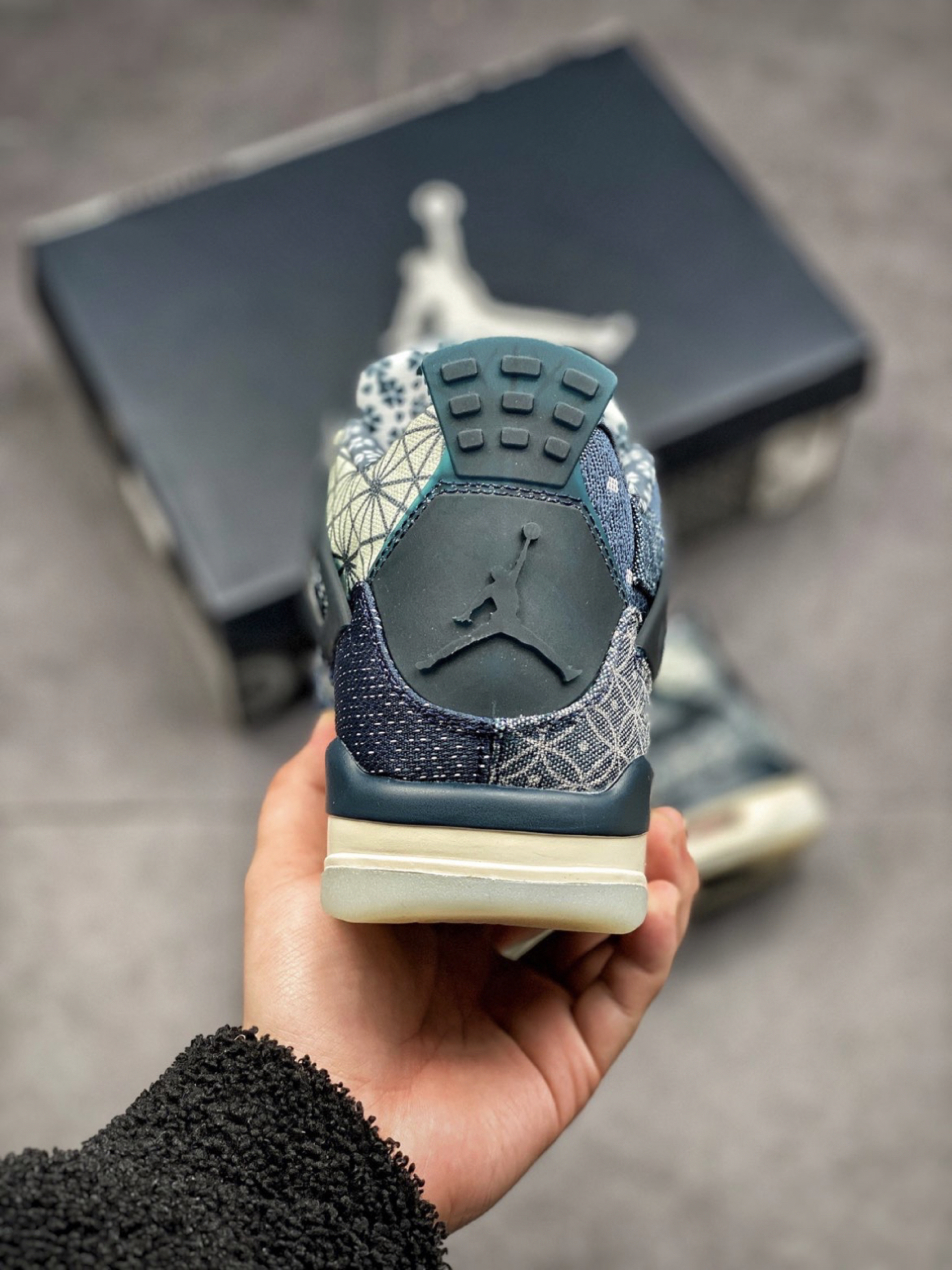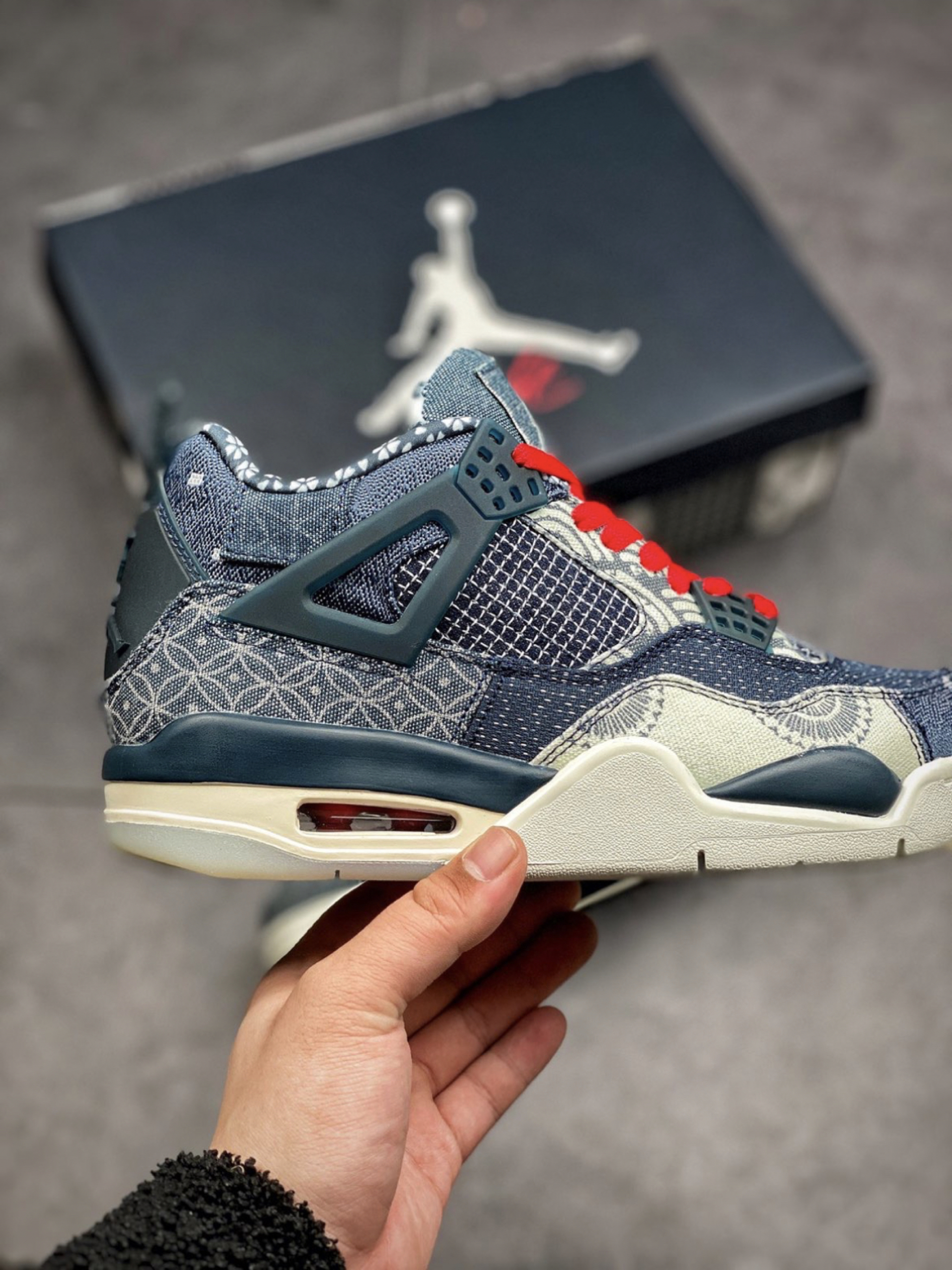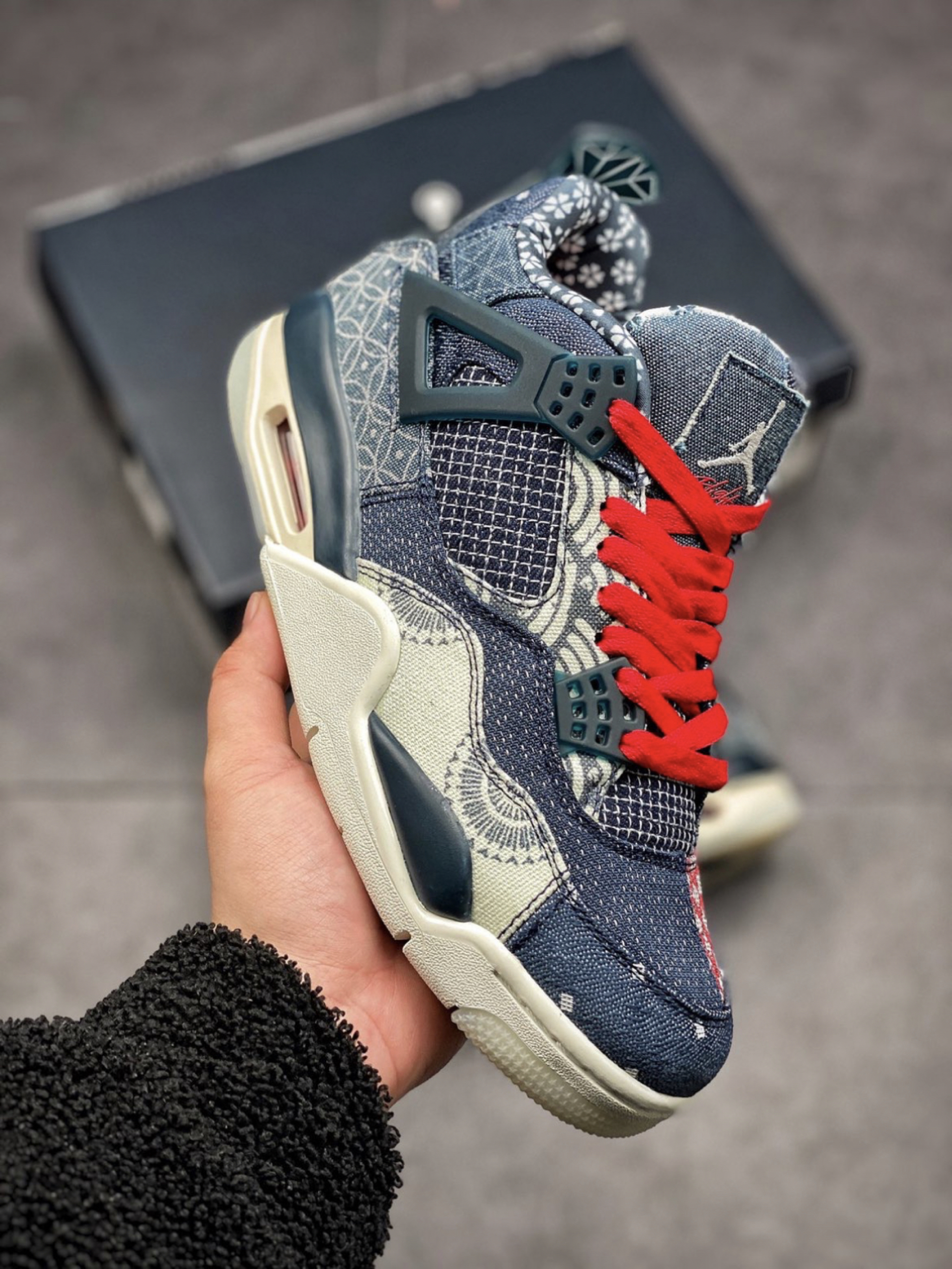 眼前这双 Air Jordan 4 SE “Sashiko” 则将日本刺子绣的经典图案悉数囊括,通过不对称的拼接手法,最大限度展现丰富的视觉魅力。 除了靛蓝色外,还有些许白色、红色点缀鞋头及鞋舌位置。 鞋带也附赠了红、蓝双色,构建鸳鸯穿发。 后跟鞋提内侧都充满细节,承载的信息量将刺子 绣的经典图纹展现的淋漓尽致