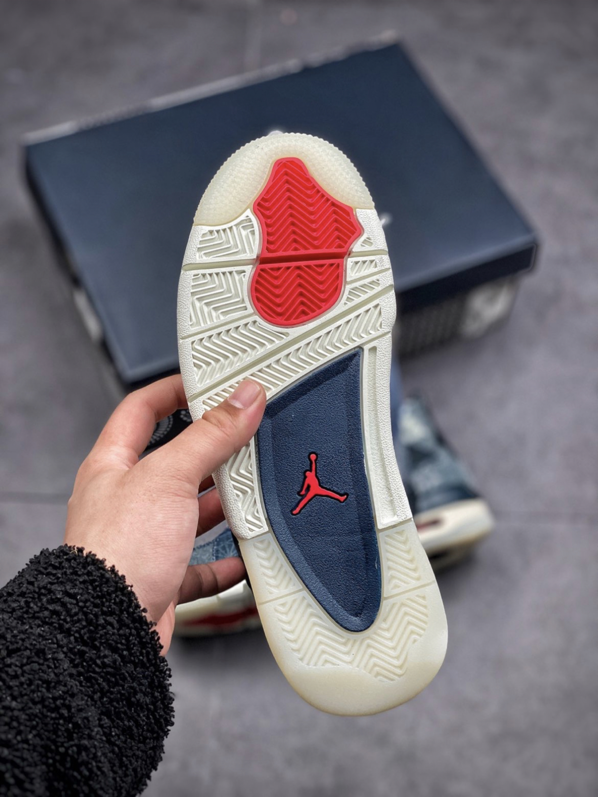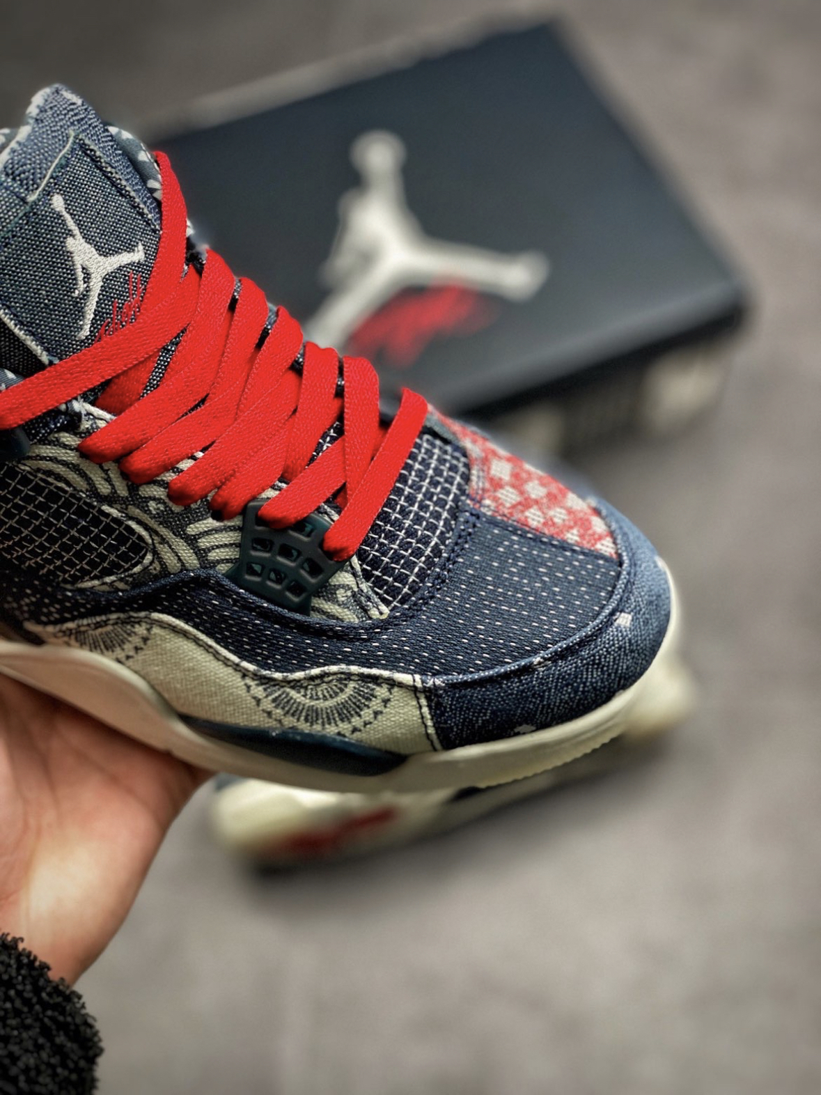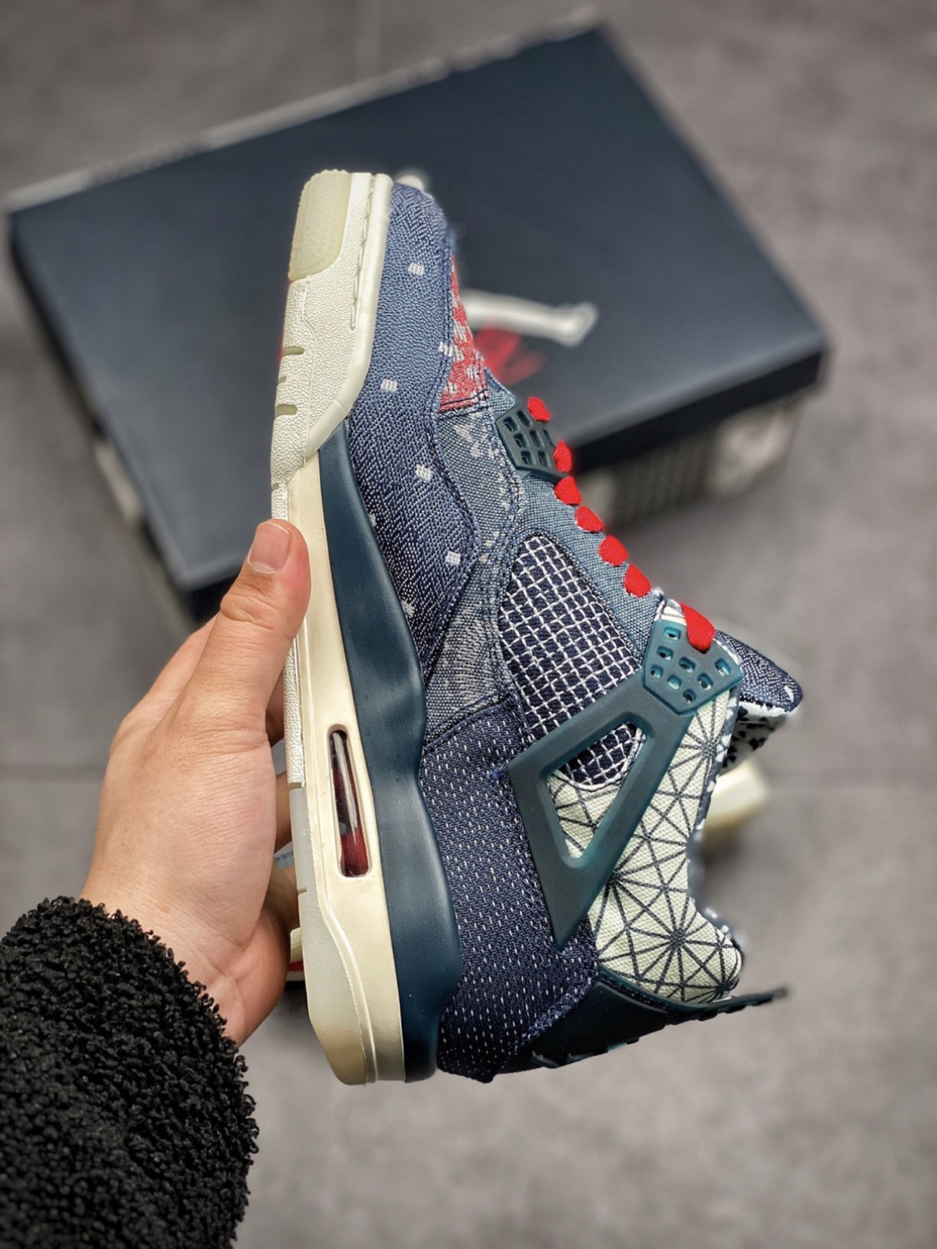 眼前这双 Air Jordan 4 SE “Sashiko” 则将日本刺子绣的经典图案悉数囊括,通过不对称的拼接手法,最大限度展现丰富的视觉魅力。 除了靛蓝色外,还有些许白色、红色点缀鞋头及鞋舌位置。 鞋带也附赠了红、蓝双色,构建鸳鸯穿发。 后跟鞋提内侧都充满细节,承载的信息量将刺子 绣的经典图纹展现的淋漓尽致