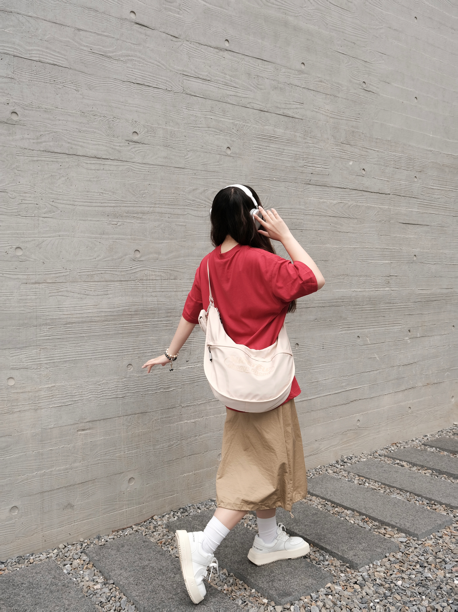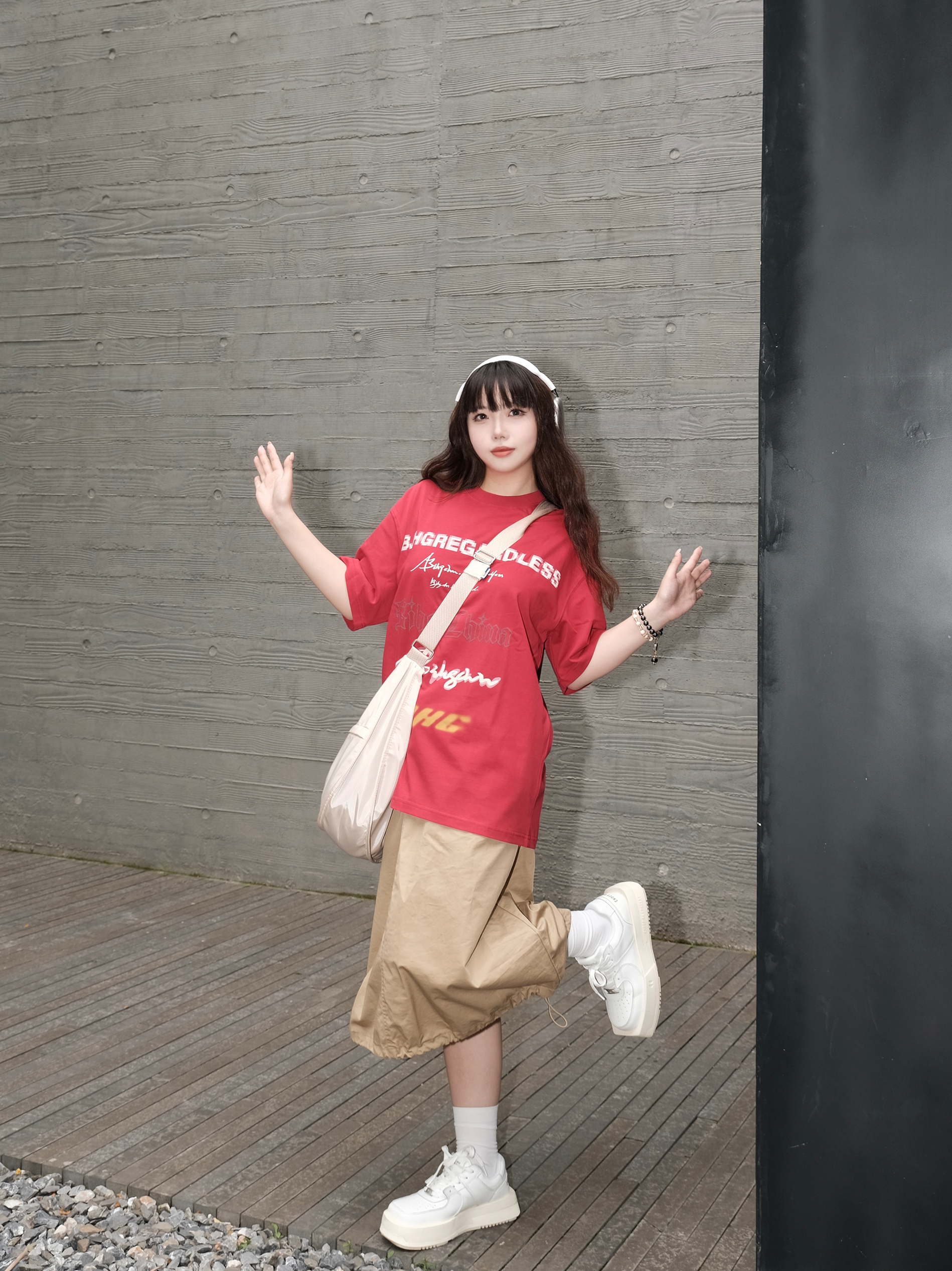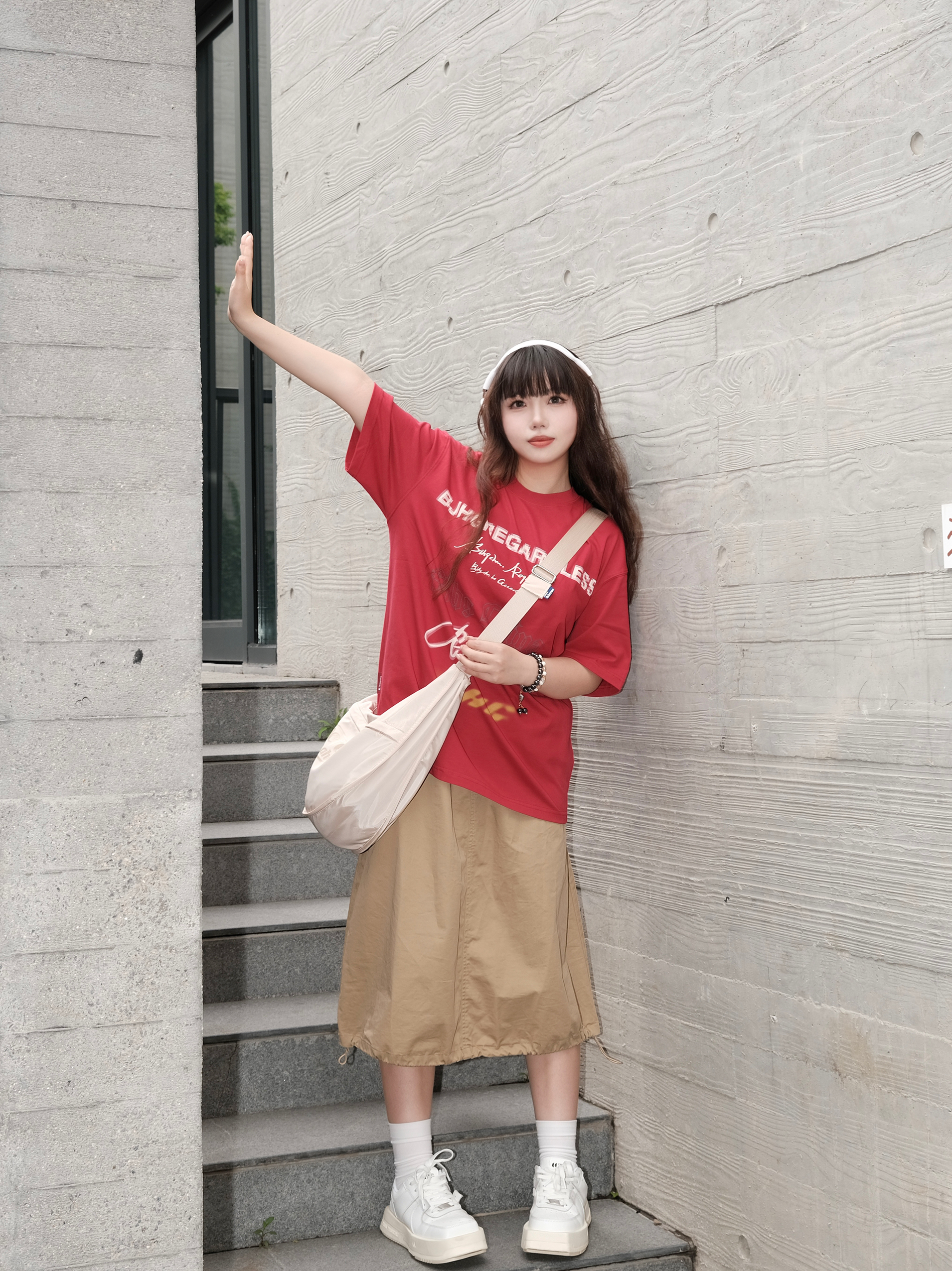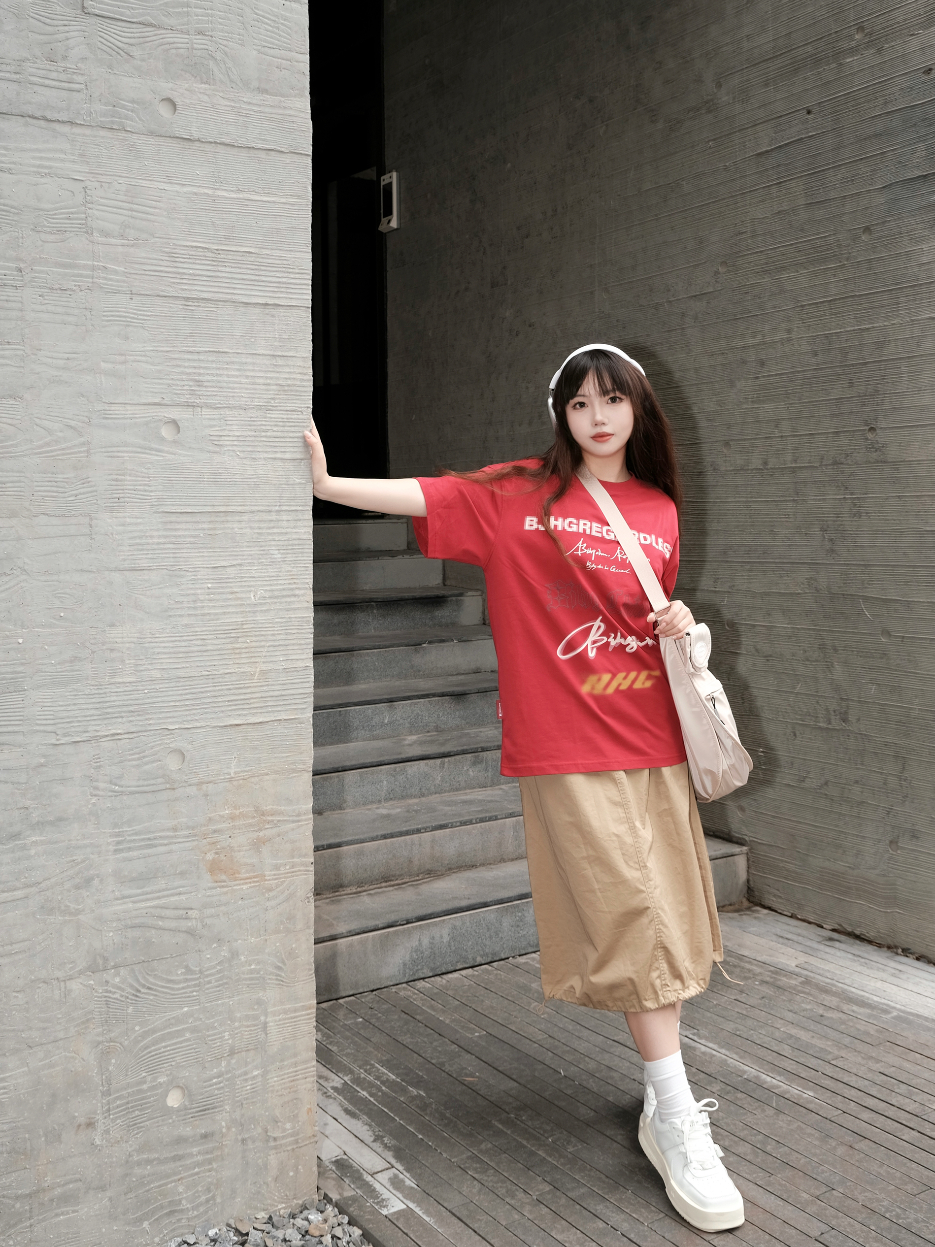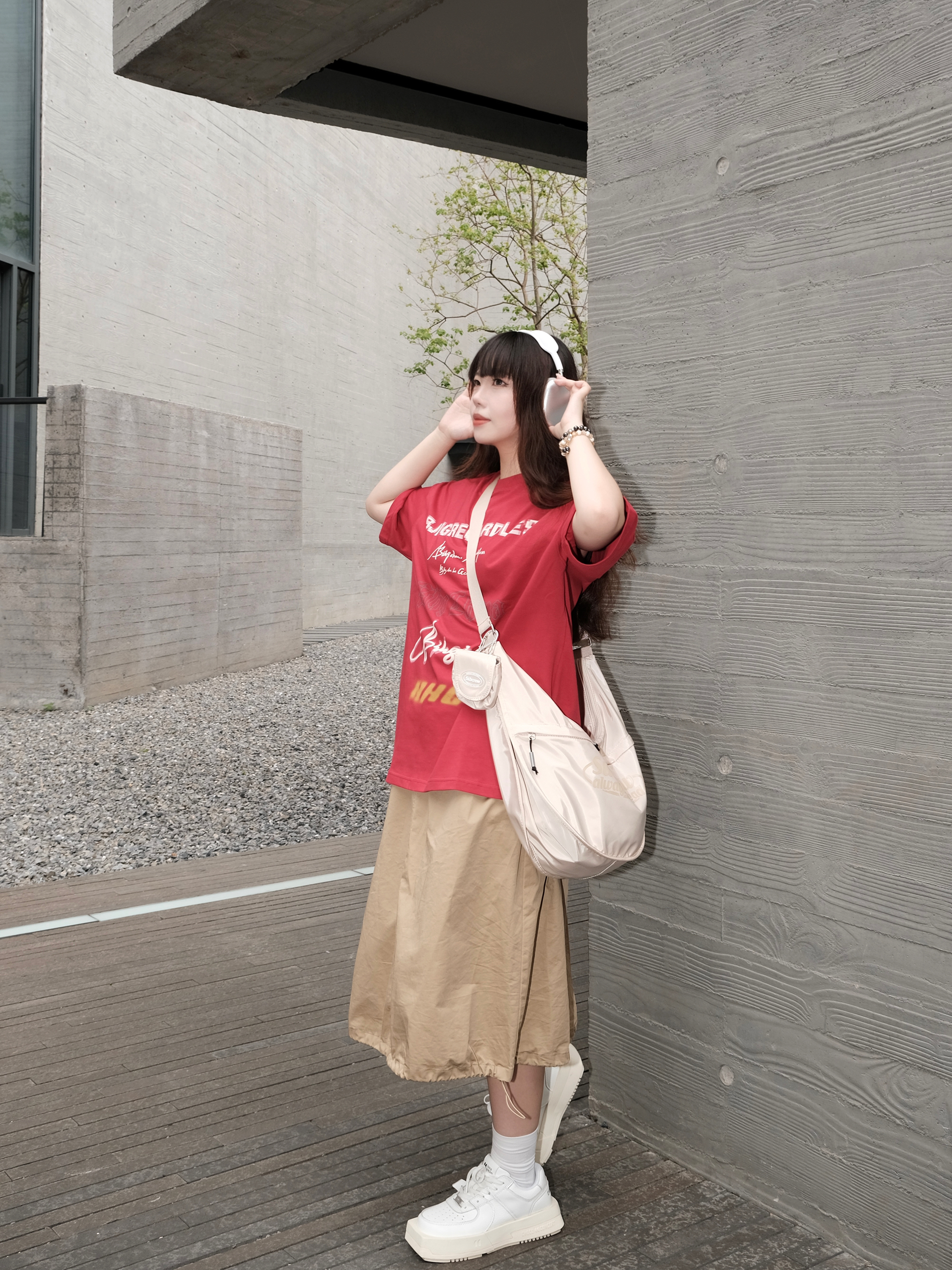 𝐇𝐢,下午好呀! 这里是你的朋友小须, 炎炎夏日约上三五知己👬 相约一起去感受夏日乐趣🎇 字母印花短袖➕卡其工装裙 红色短袖散发活力与俏皮气息🏂 简约的设计🎗展现出 日系文艺的风格📖 搭配上卡其工装裙👗 再次凸显出少女的清新和自然美🩰 出门在外怎么能少得了背包👜 超大容量米白⚪️斜挎包 能够轻松装下必要的物品🪆 不仅仅是个实用的配饰🎀 更是表达自我个性⛓ 在夏日蓝天白云下🌁 一起去感受这个时...