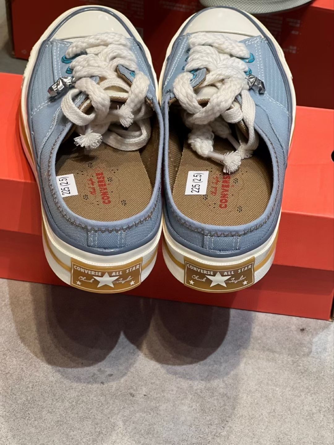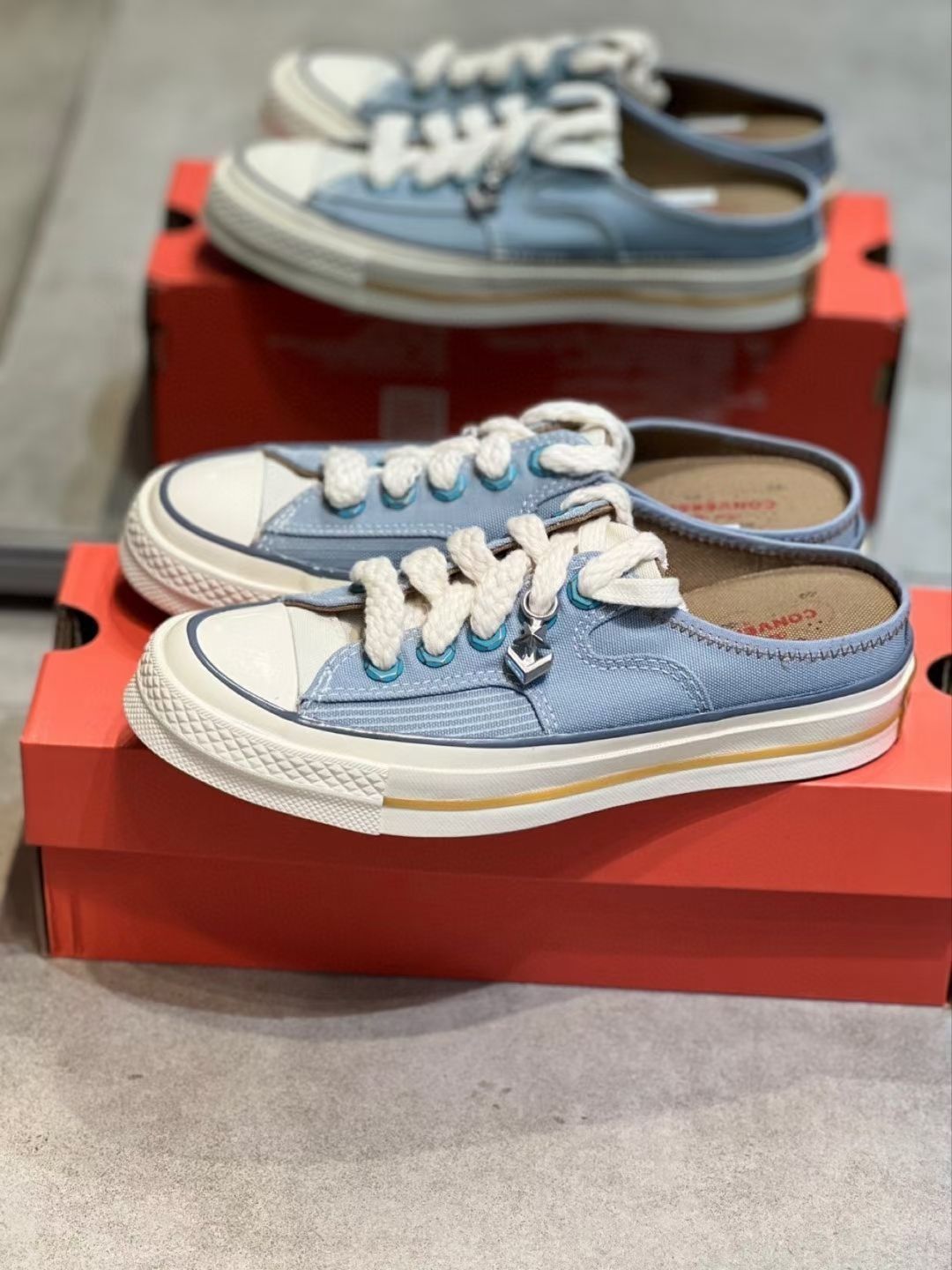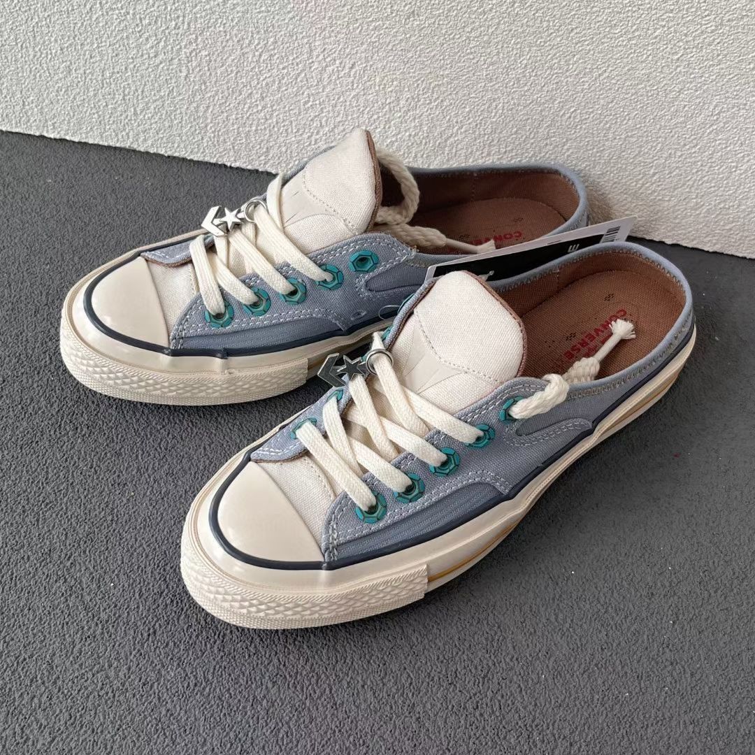 - Converse Chuck 70 Mule 半拖 📭牛仔蓝拼接 帆布鞋 穆勒鞋是很夏天的一个款、比较小众,搭配特殊鞋带设计、还有星箭头logo的装饰、细节做的是不错的、最主要清爽又方便脚感是延续1970S 尺码选择也一样,出门一踩就可以了、很方便的懒人鞋