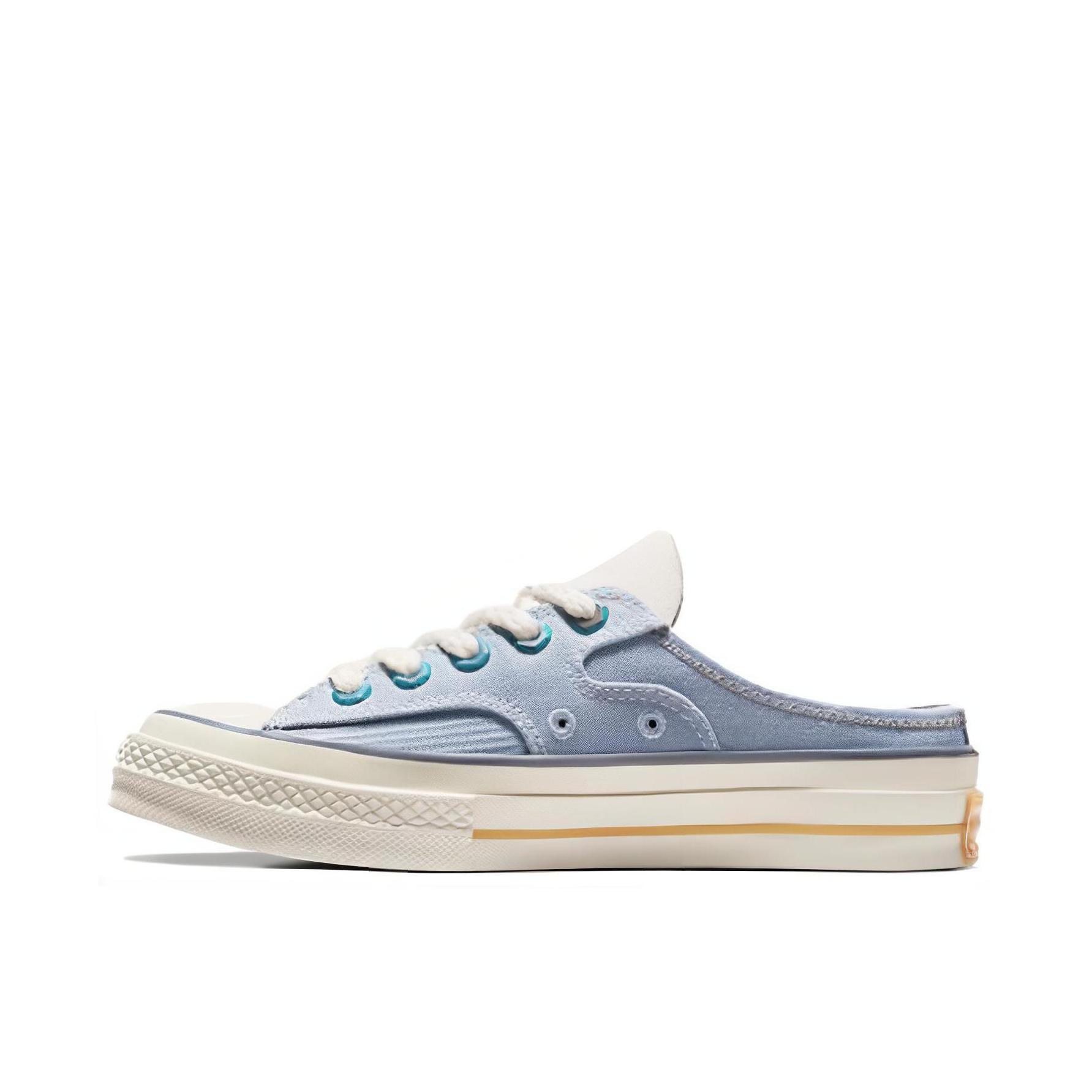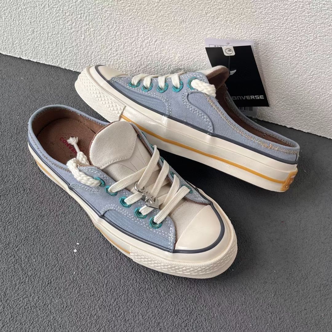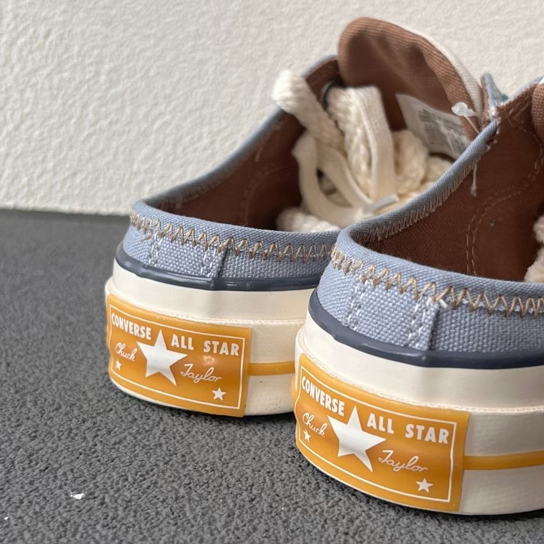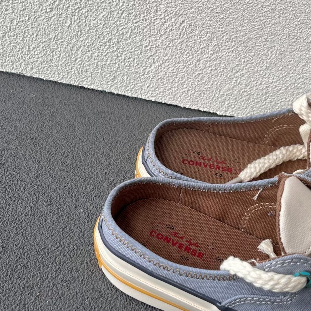 - Converse Chuck 70 Mule 半拖 📭牛仔蓝拼接 帆布鞋 穆勒鞋是很夏天的一个款、比较小众,搭配特殊鞋带设计、还有星箭头logo的装饰、细节做的是不错的、最主要清爽又方便脚感是延续1970S 尺码选择也一样,出门一踩就可以了、很方便的懒人鞋