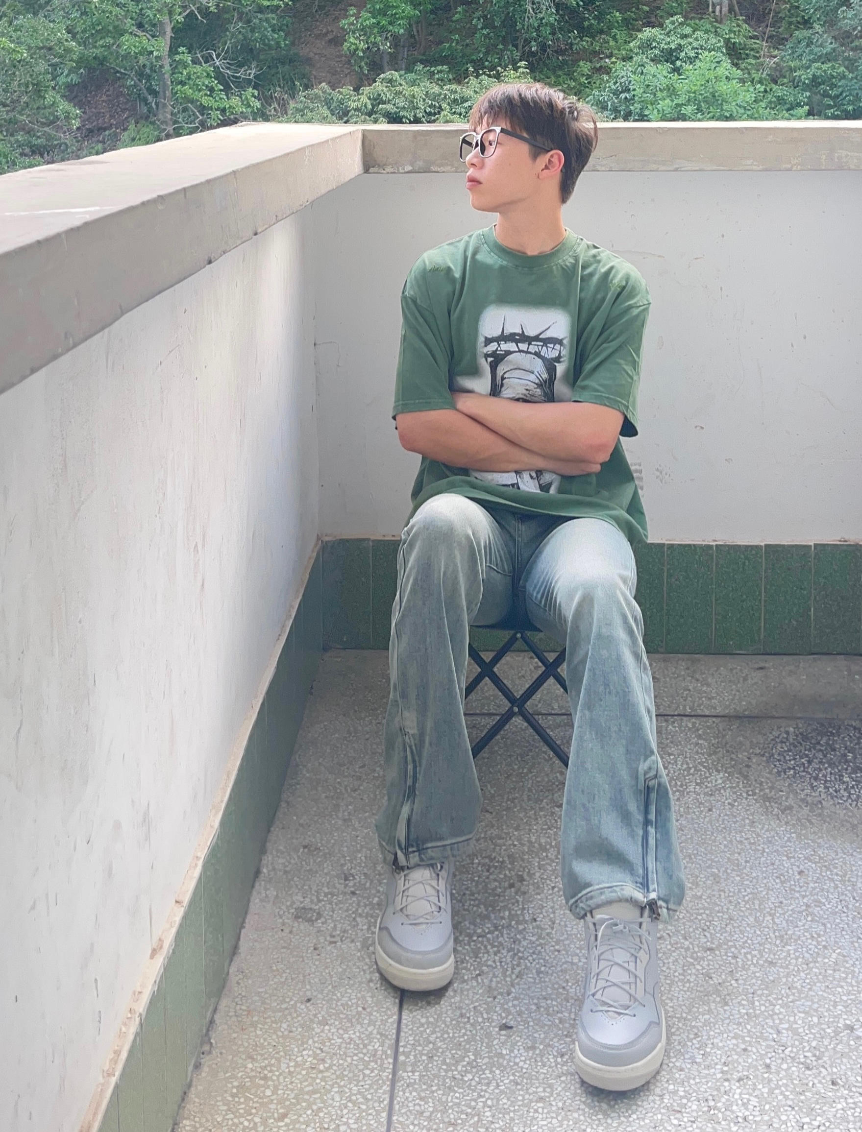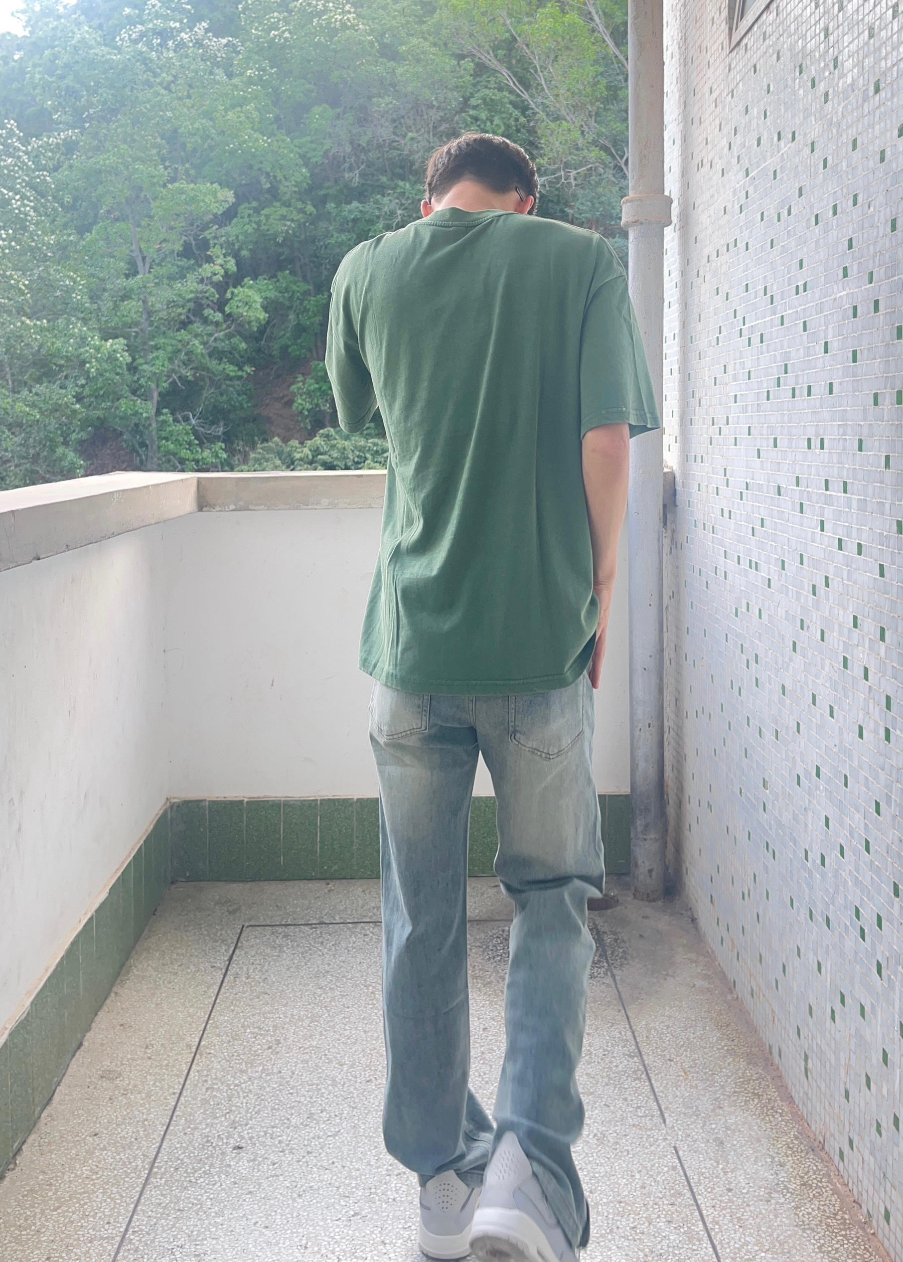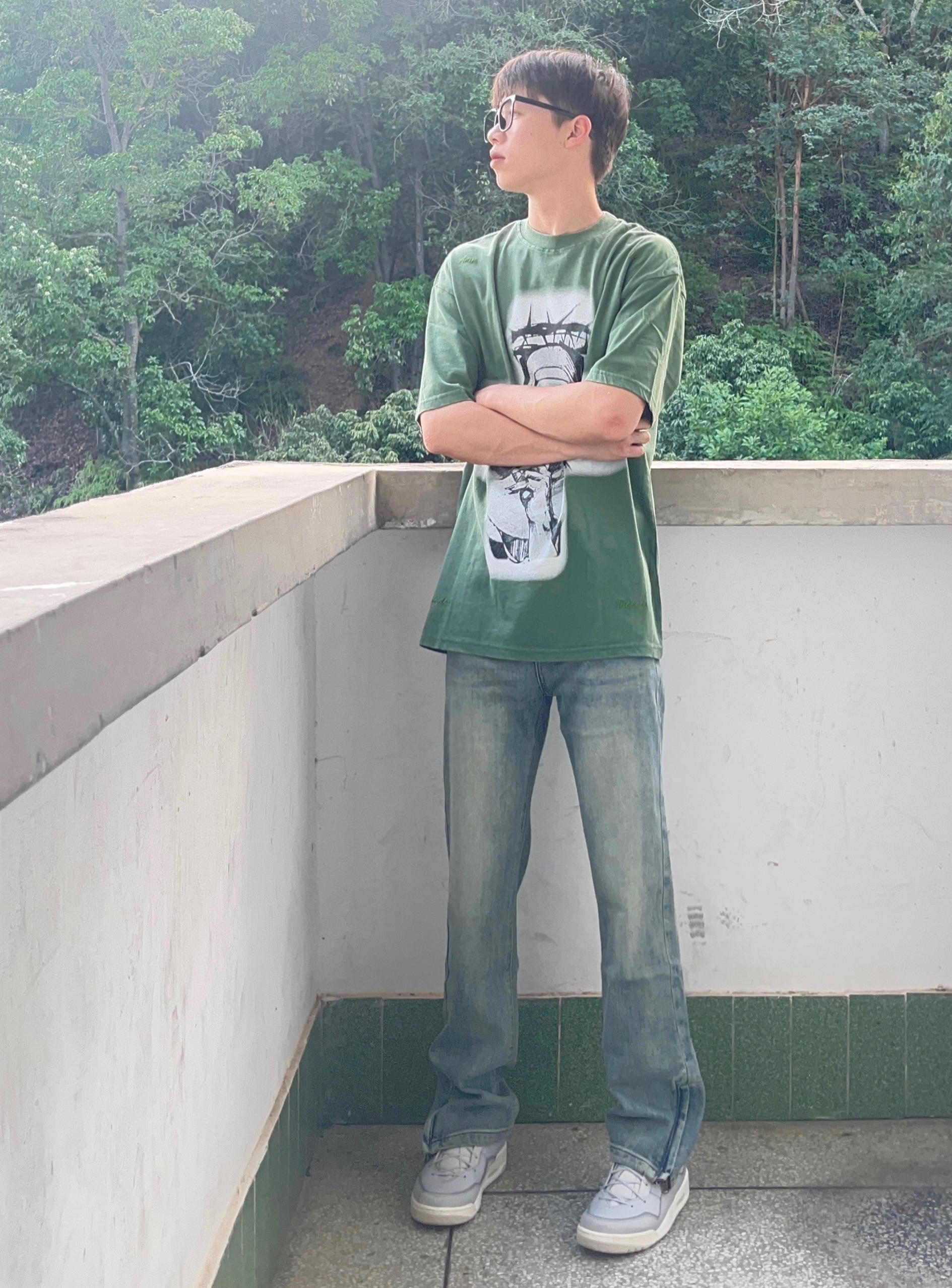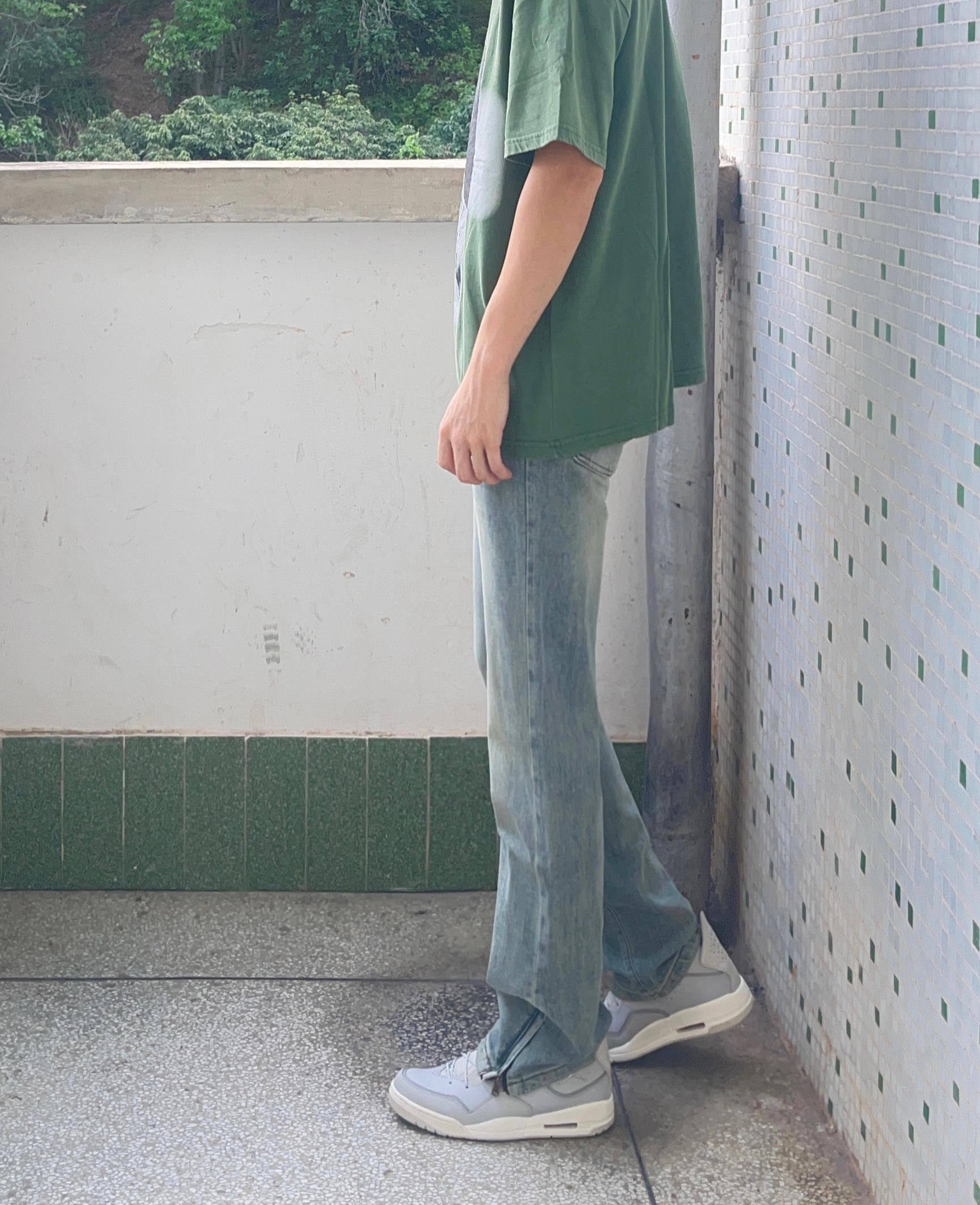 - 绿色美式简约印花短袖搭配水洗拉链直筒牛仔裤 搭配灰色复古板鞋点缀 男生这样穿夏天显瘦又百搭 -