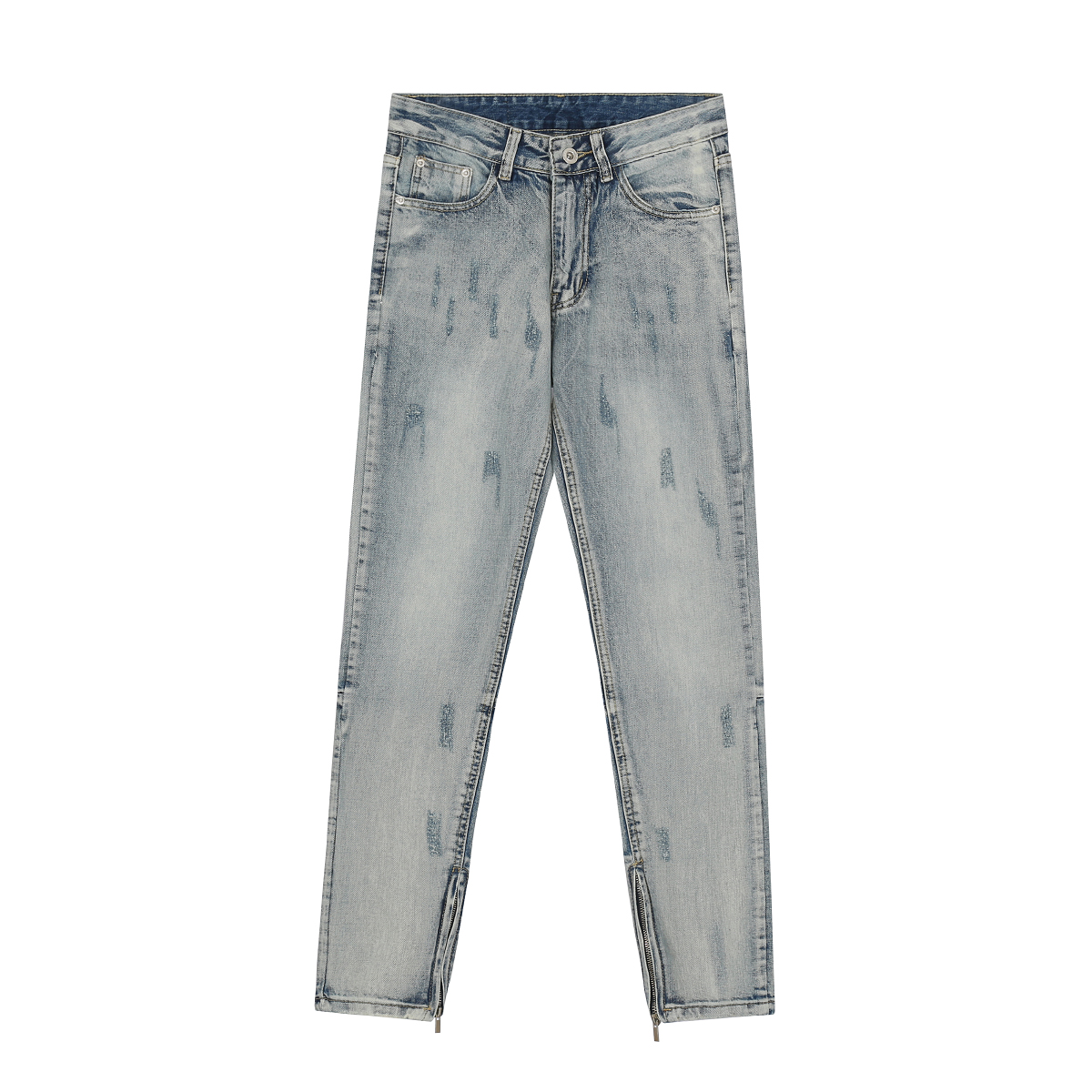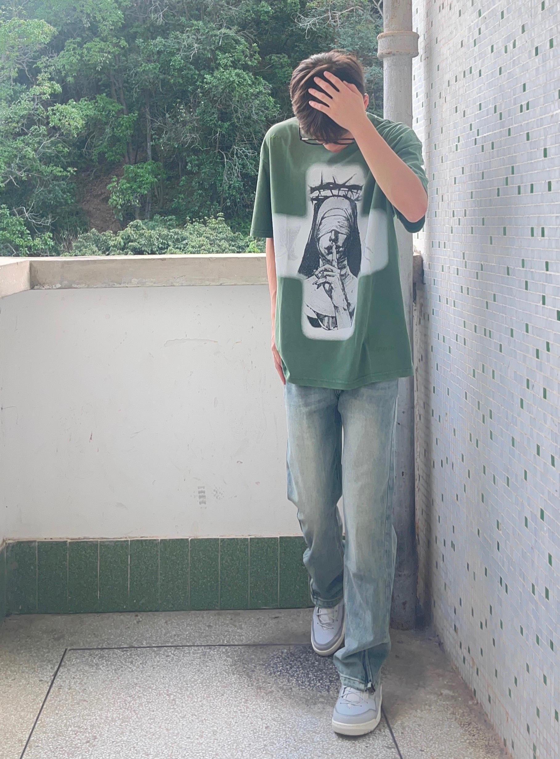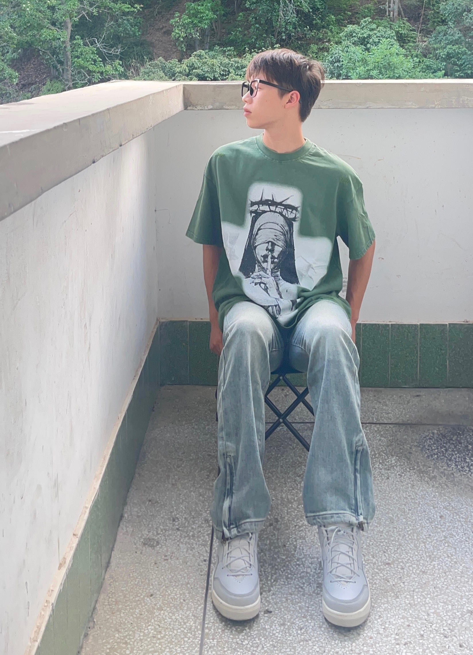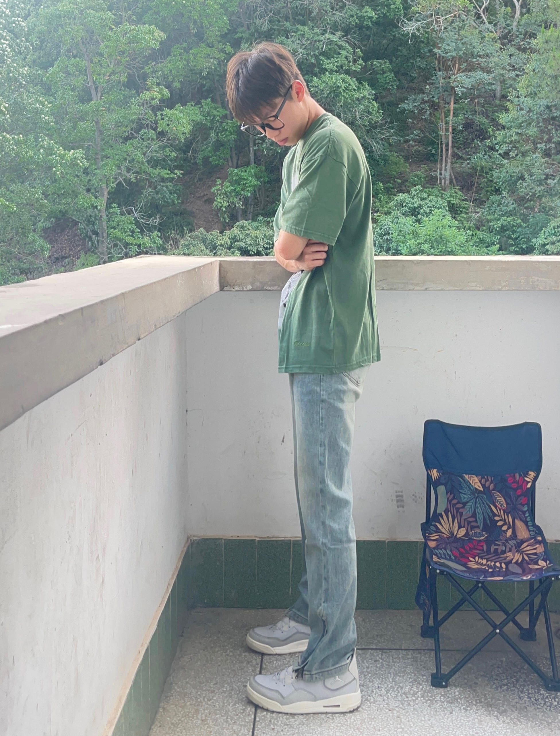 - 绿色美式简约印花短袖搭配水洗拉链直筒牛仔裤 搭配灰色复古板鞋点缀 男生这样穿夏天显瘦又百搭 -