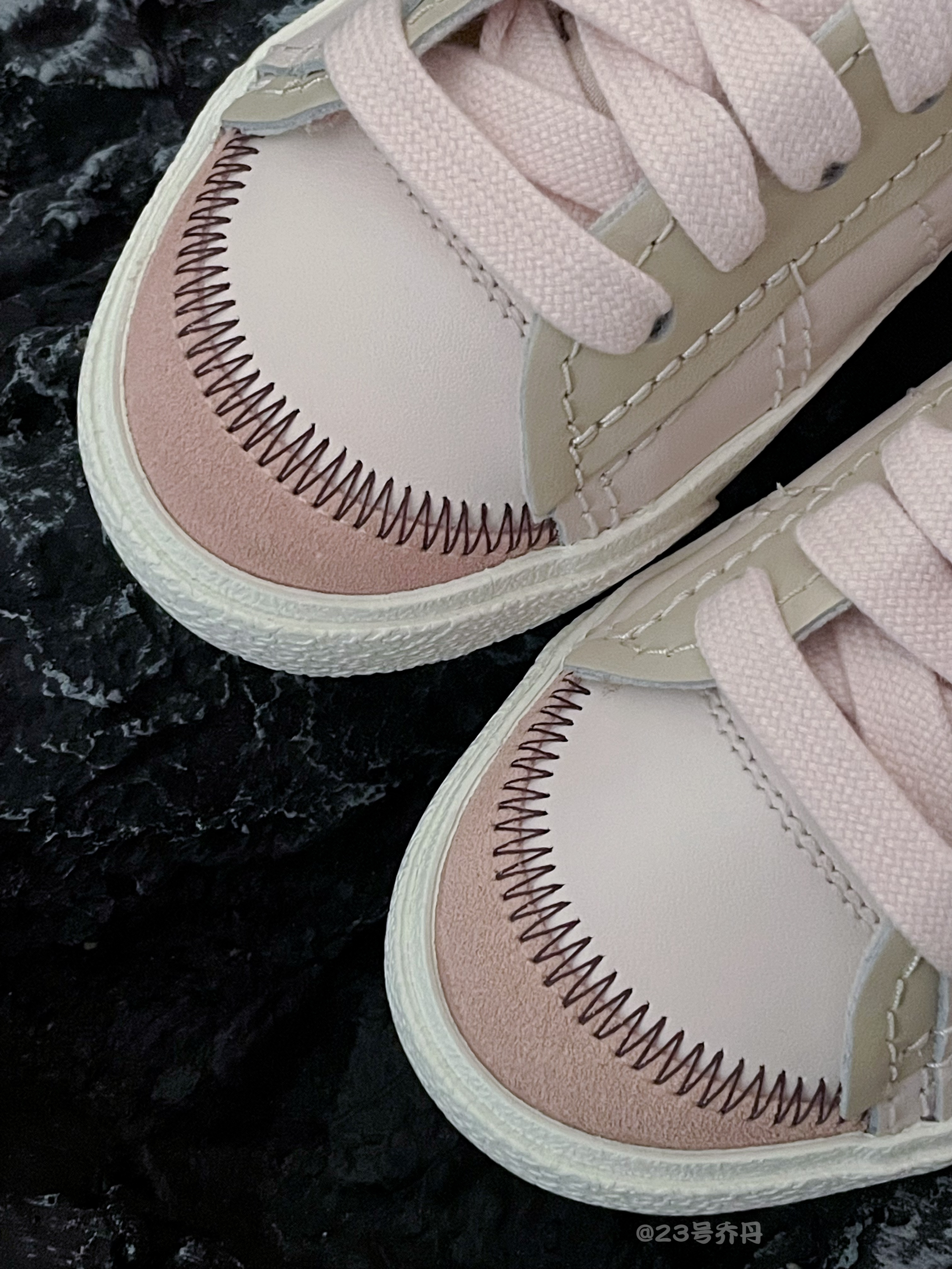 今天给大家分享一双颜值很不错的板鞋 Nike Blazer Low Jumbo『白粉』 鞋款采用了白色/浅粉/深粉等进行搭配 鞋面则运用了牛剖层革+合成革材质 大部分面积比较好打理 质感也挺到位 鞋舌与鞋尾设计有品牌Logo信息 特别是鞋口还采用了黄色裸露海绵的解构设计 不仅十分潮流 也避免了后期氧化的问题 白色的中底和同色的人字纹橡胶大底收尾 整体来说这是一双颜值设计细节都到位的板鞋 粉粉嫩嫩 ...