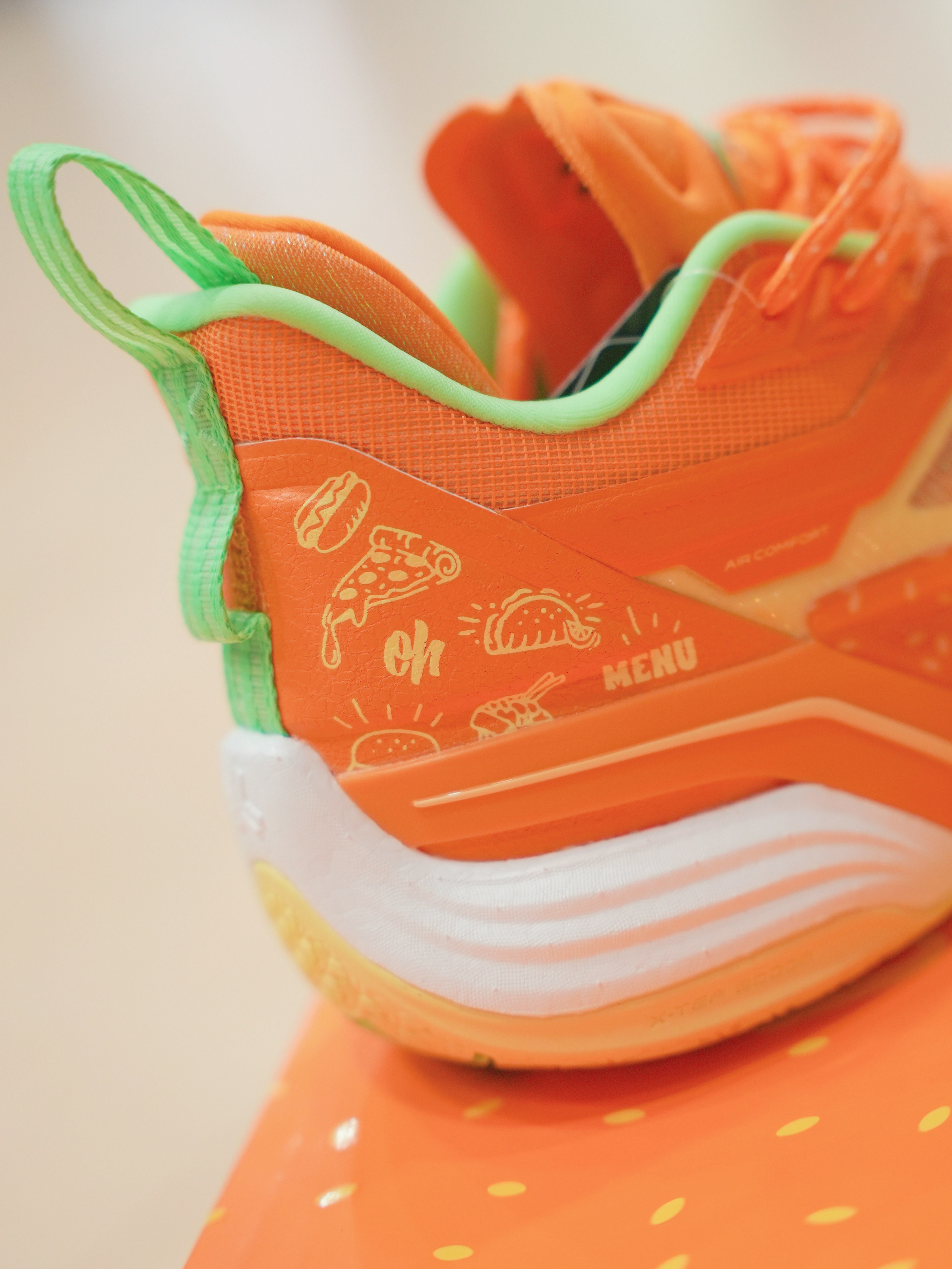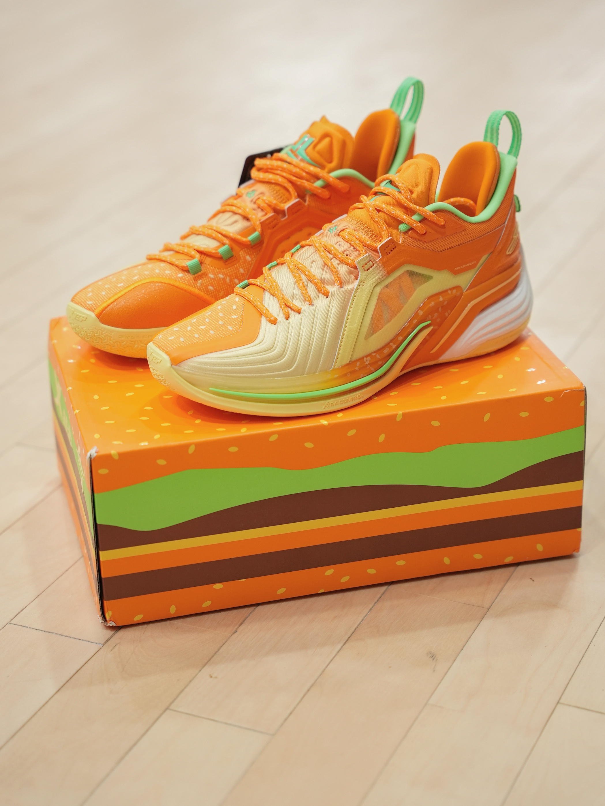 林书豪3汉堡配色! 这双应该是我第一双特步的篮球鞋,拿到手里鞋盒整体的质感还不错。 至于为啥买这个配色我是觉得,就这款还蛮有特点的,鞋面的小芝麻,鞋舌还有各个地方的小细节。真应该让钩子来康康,咱们特步对待签名球鞋的态度。 整个中底采用特爆,也不知道上上强度会不会爆。鞋面我看这个地方跟手法配色不太一样,感觉这个材质会更透气一点。整个鞋子拿起来满轻,尺码个人感觉内长又一度丢丢长,建议瘦脚选小一码.