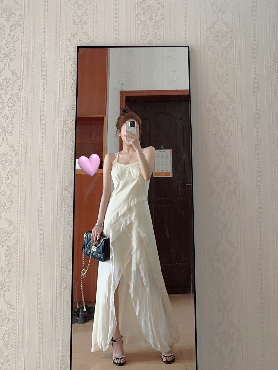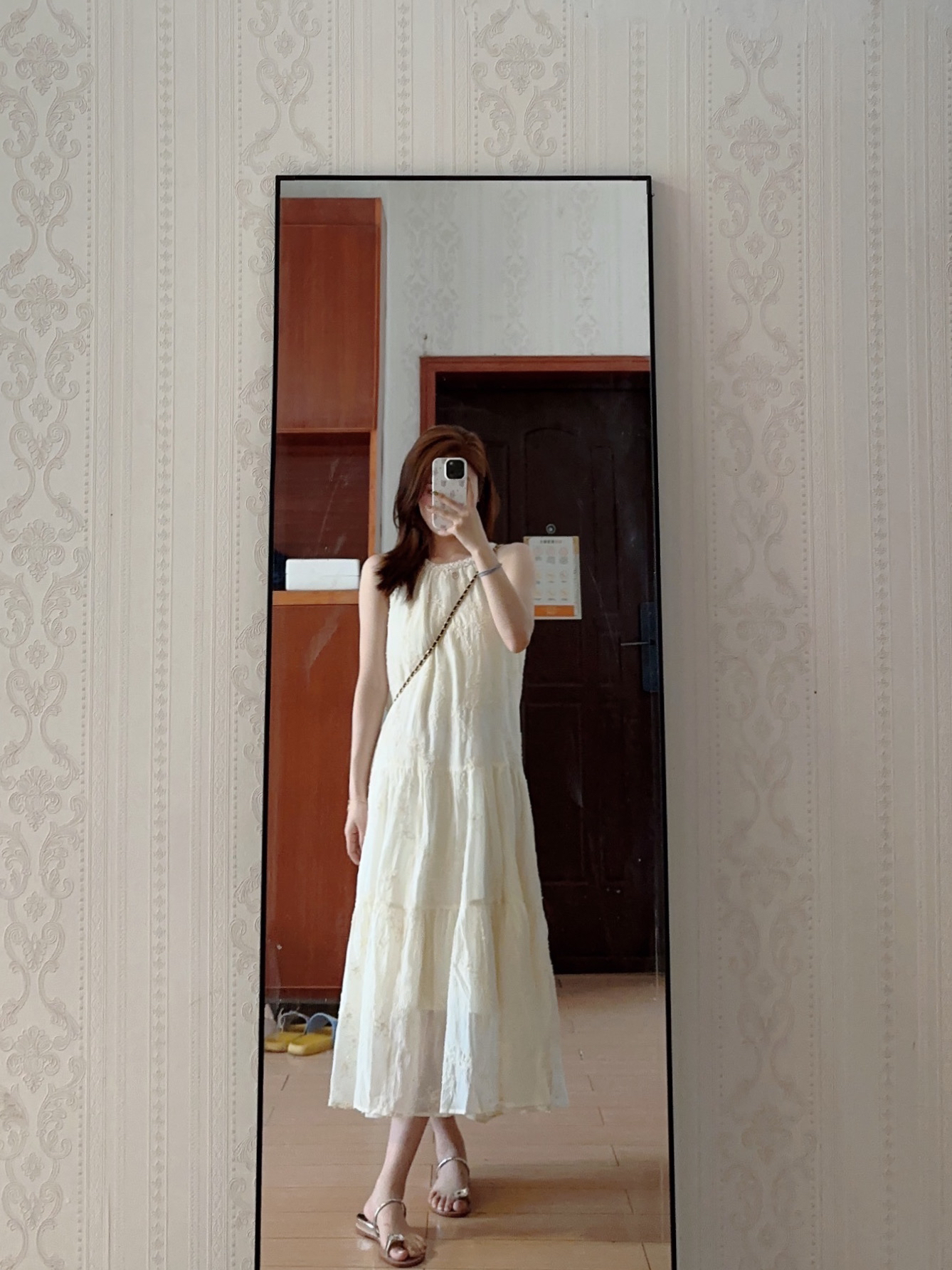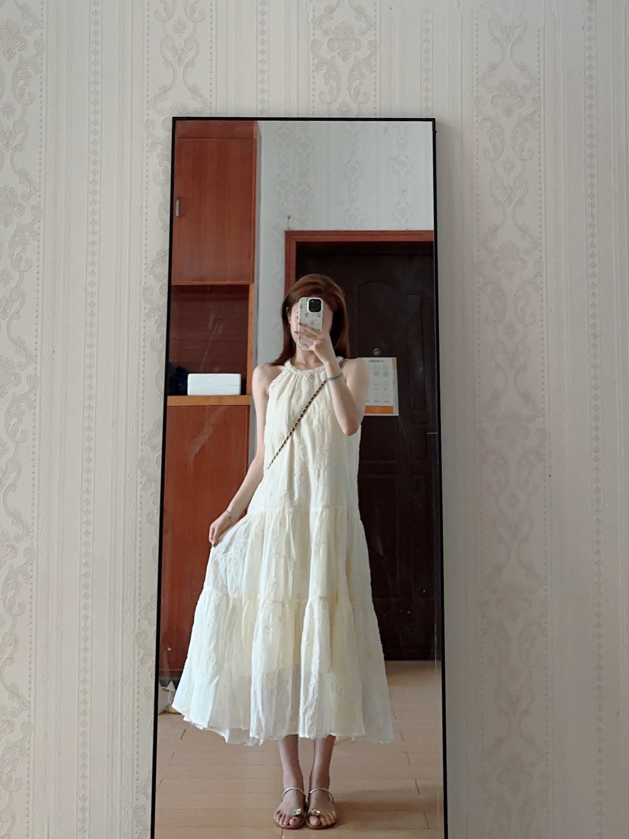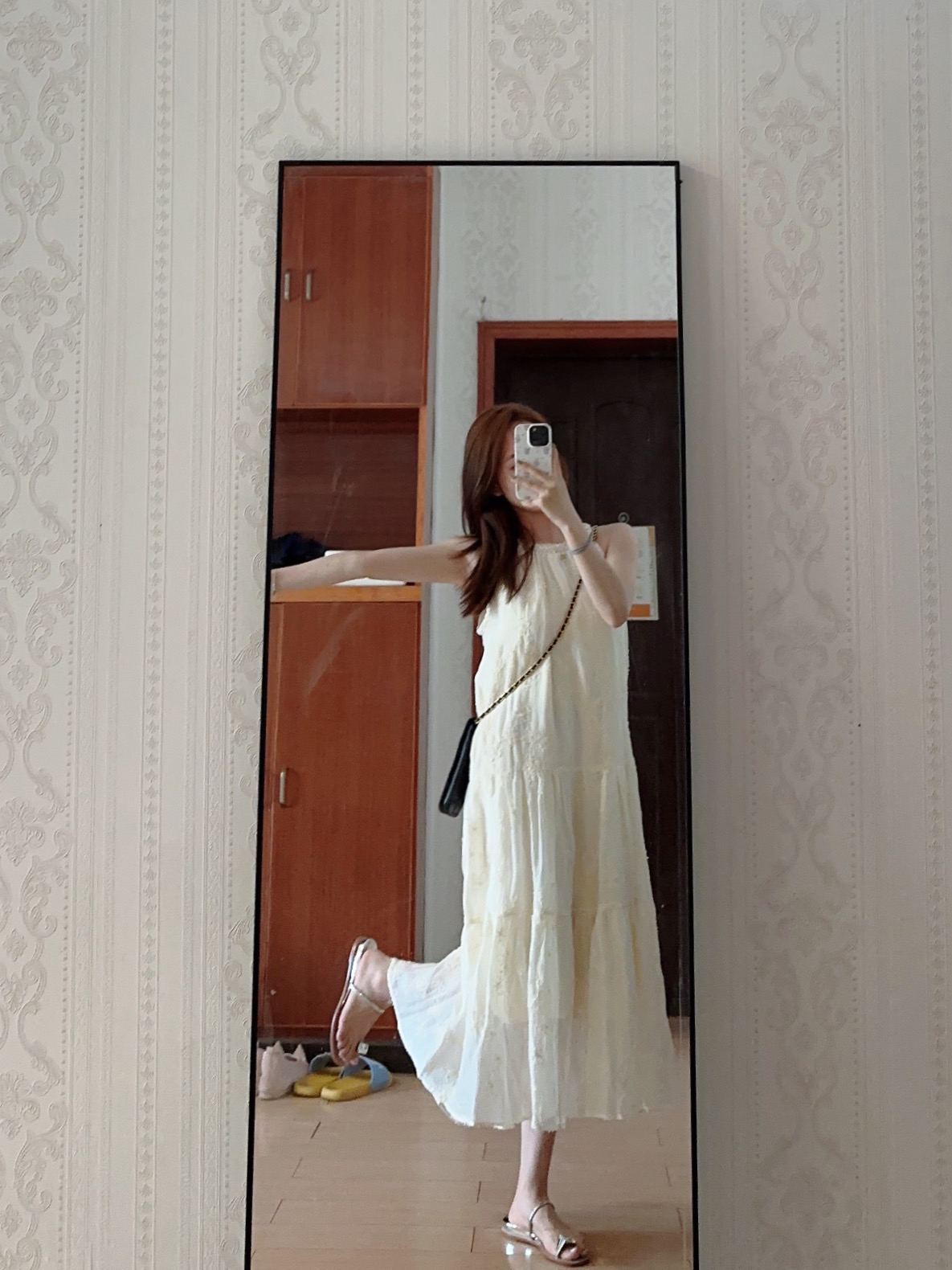 这条裙子质感好好~ 这样穿好好看!而且一点也不会显胖! 背一个斜挎链条包!又淑女又好看!