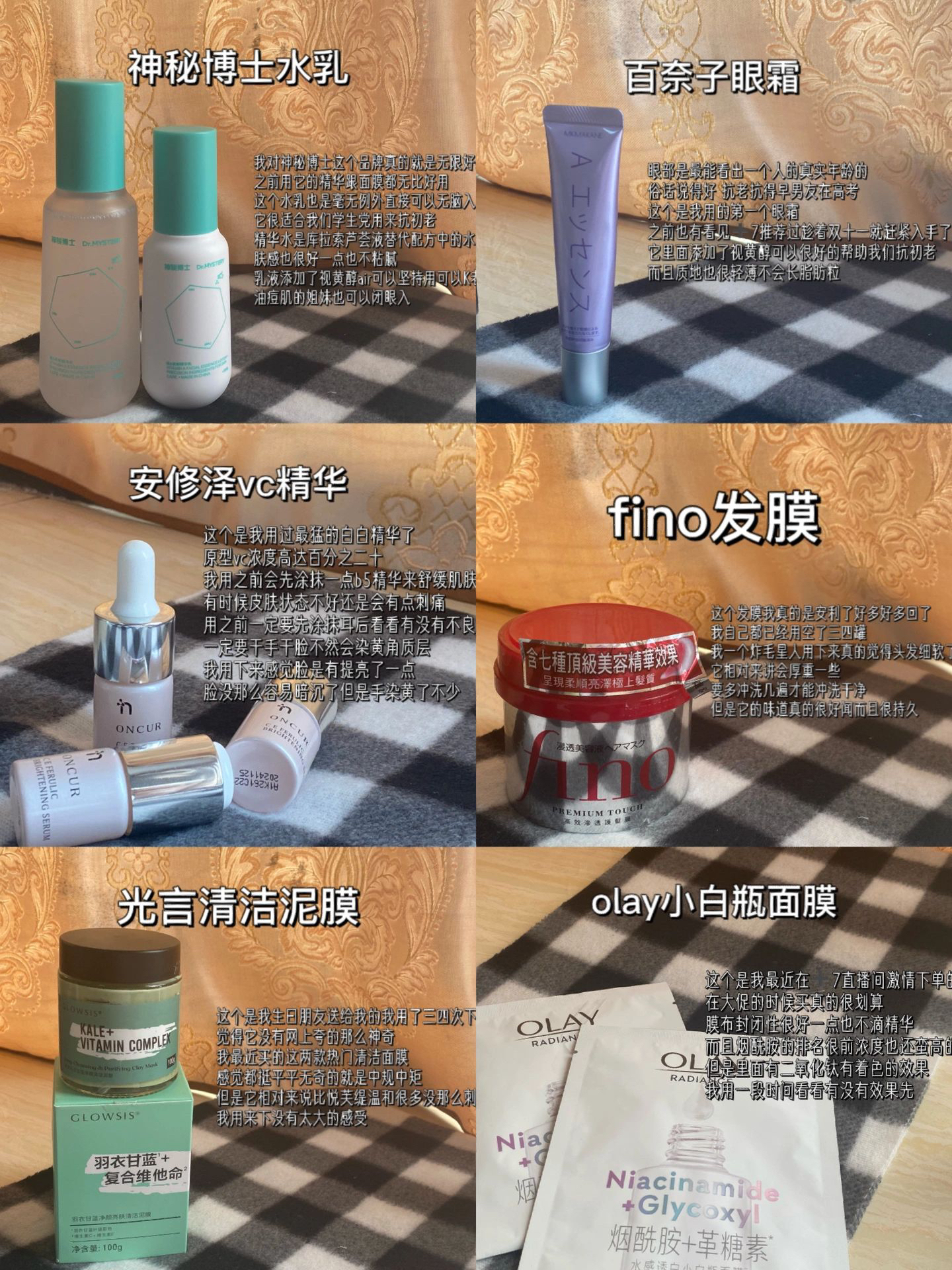 ▪️每个人肤质都不一样 我仅代表个人的观点 理性观看 -神秘博士水乳 优秀 -百奈子眼霜 优秀 -安修泽vc精华 优秀 -fino发膜 良好 -光言清洁泥膜 良好 -olay小白瓶面膜 良好