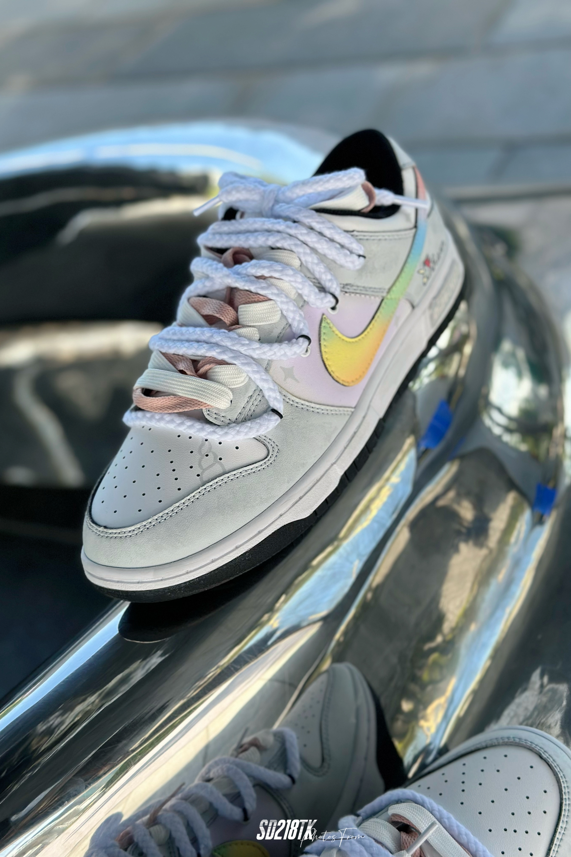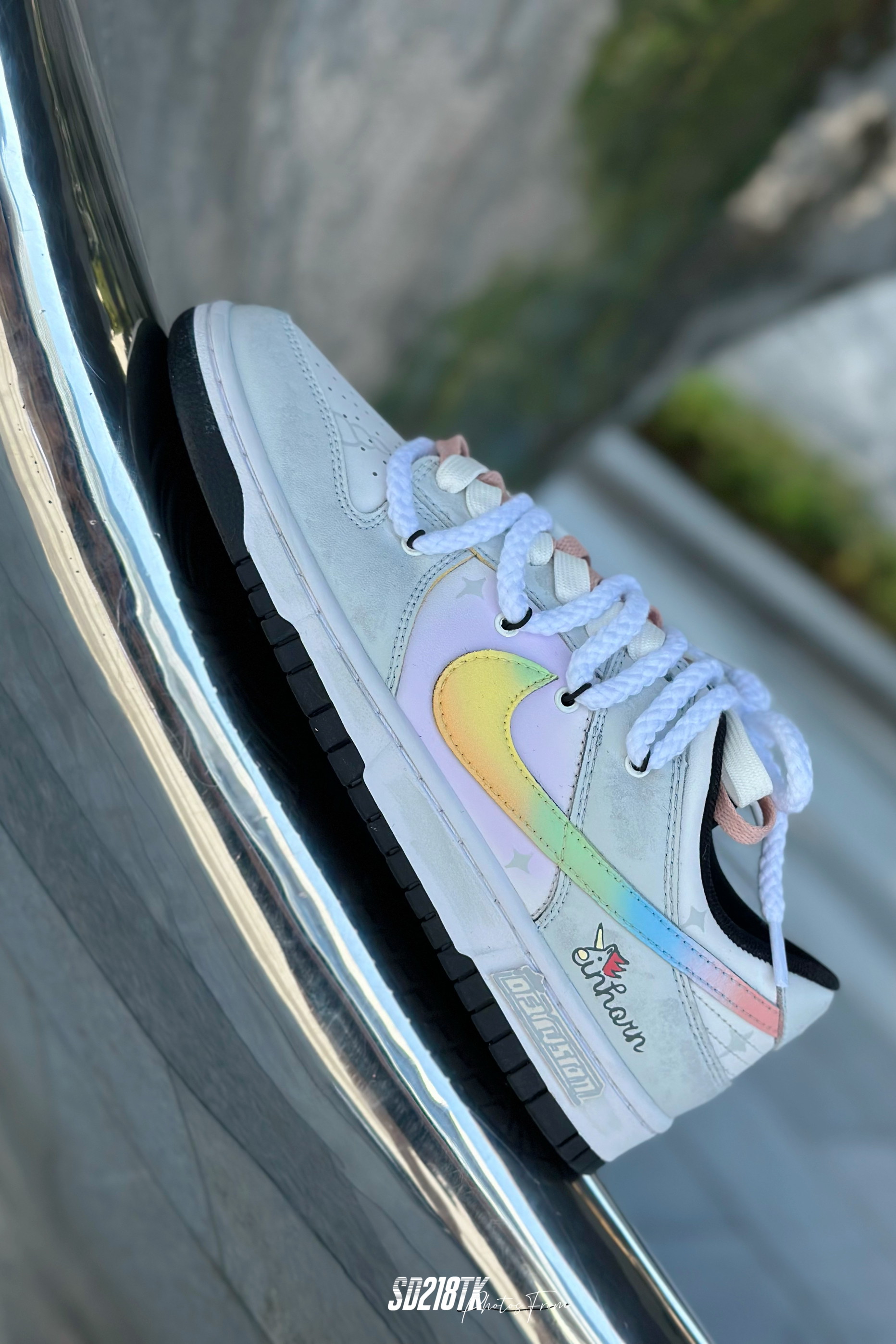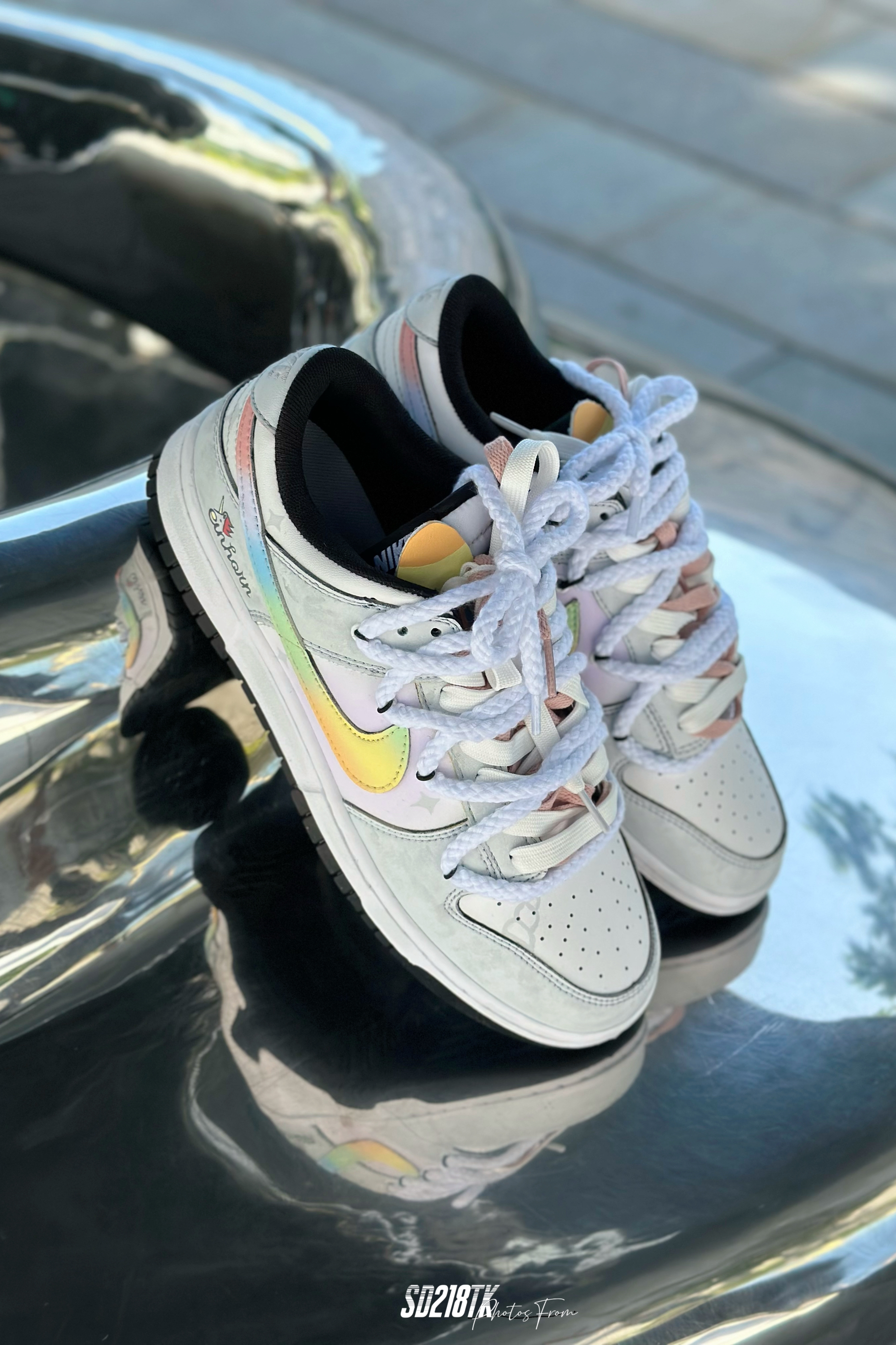最近着迷定制球鞋,这双星黎闪耀主题的nike dunk low质感拉满,融入近年来热门的解构风,独角兽的logo,彩虹渐变的smooth鞋面,细节满满,双鞋带系统,未来简约风的这组照片,夏日搭配起来毫无压力。码数不偏,正常购买就行了。