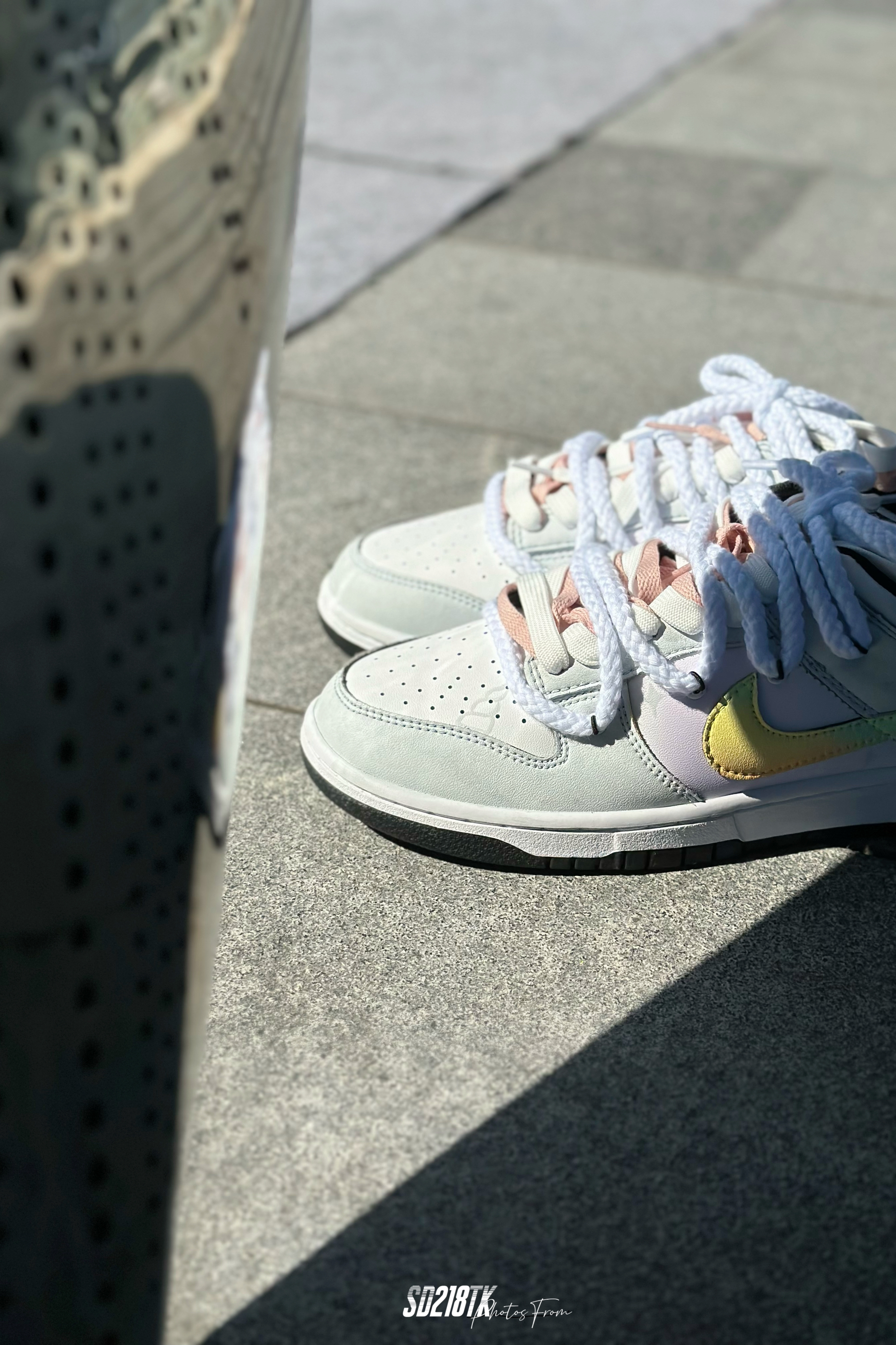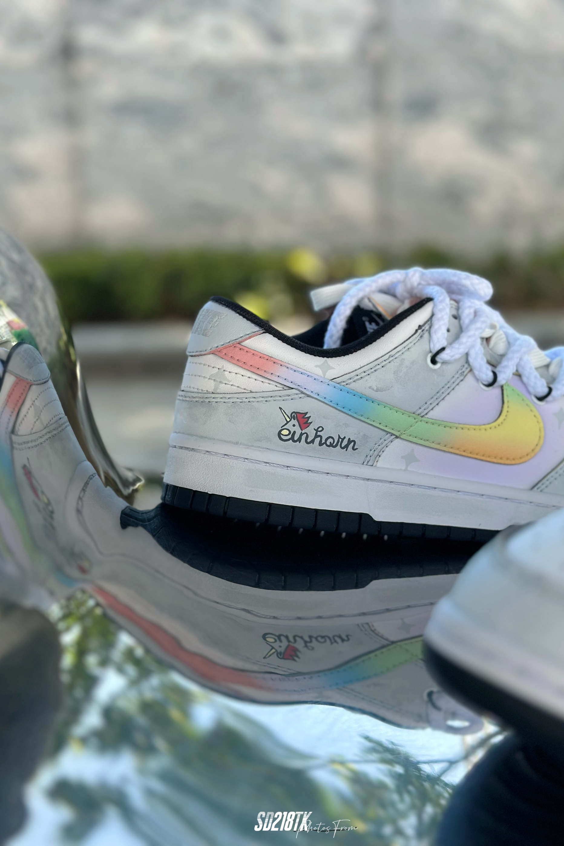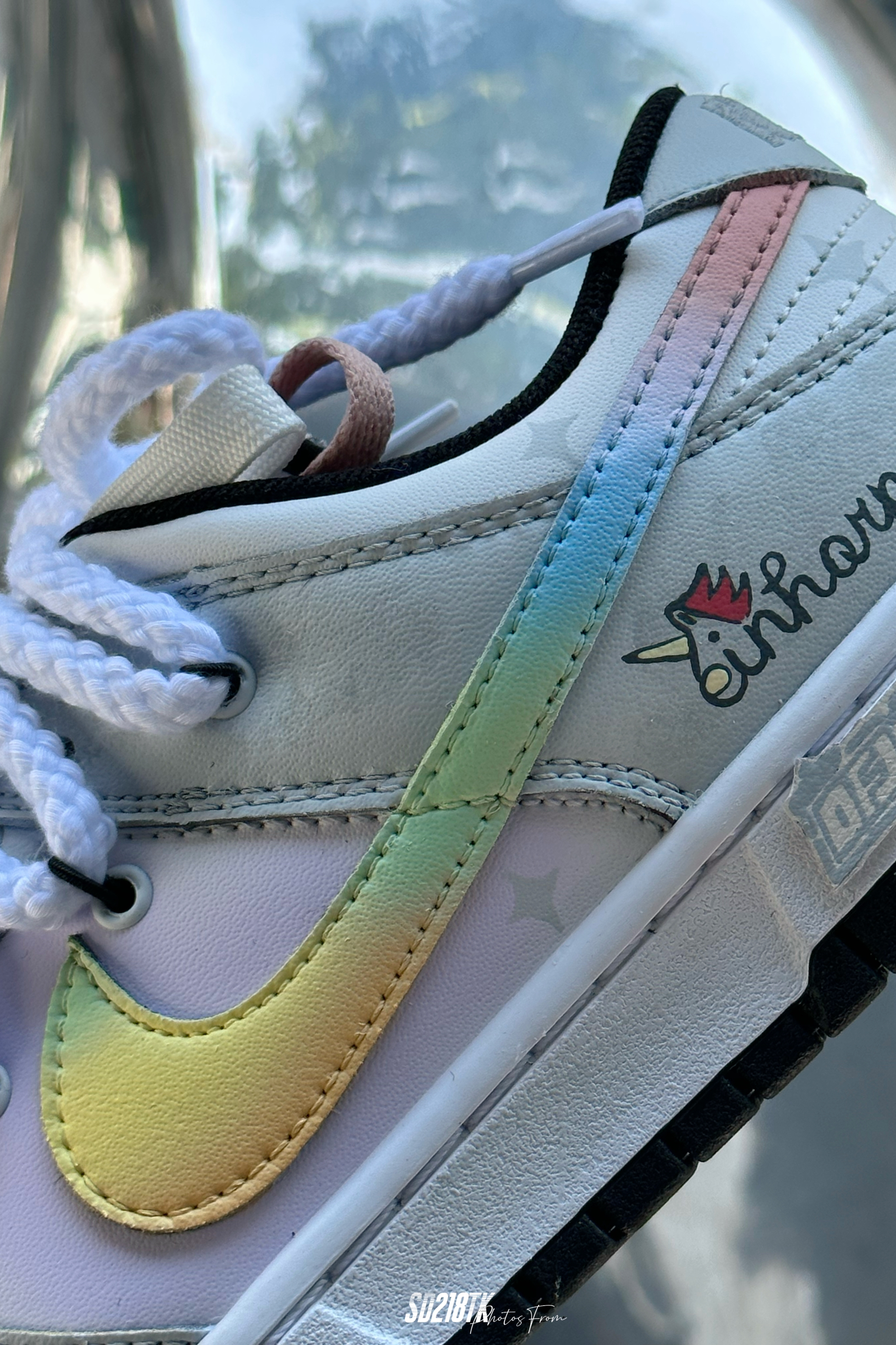 最近着迷定制球鞋,这双星黎闪耀主题的nike dunk low质感拉满,融入近年来热门的解构风,独角兽的logo,彩虹渐变的smooth鞋面,细节满满,双鞋带系统,未来简约风的这组照片,夏日搭配起来毫无压力。码数不偏,正常购买就行了。