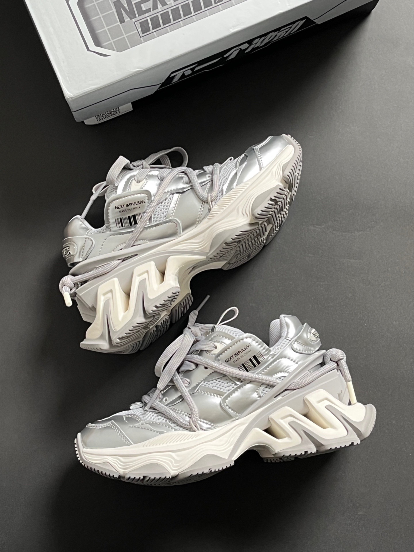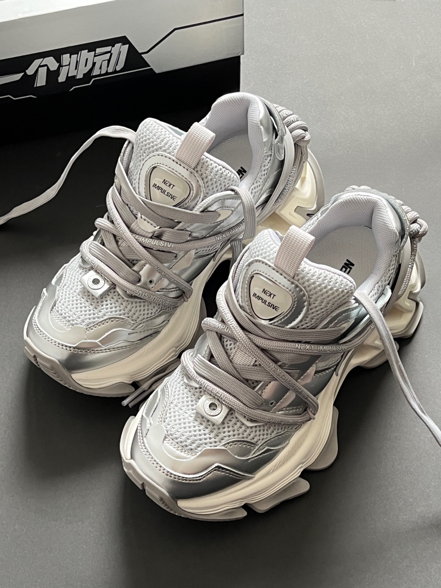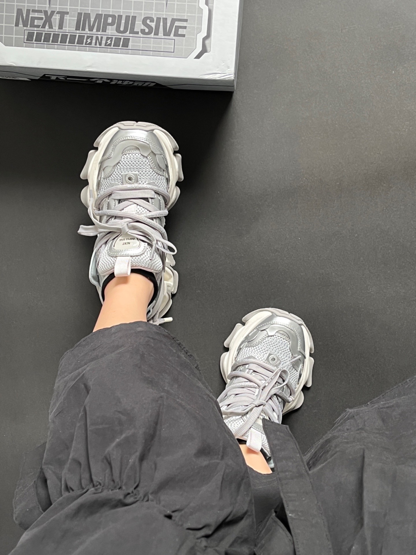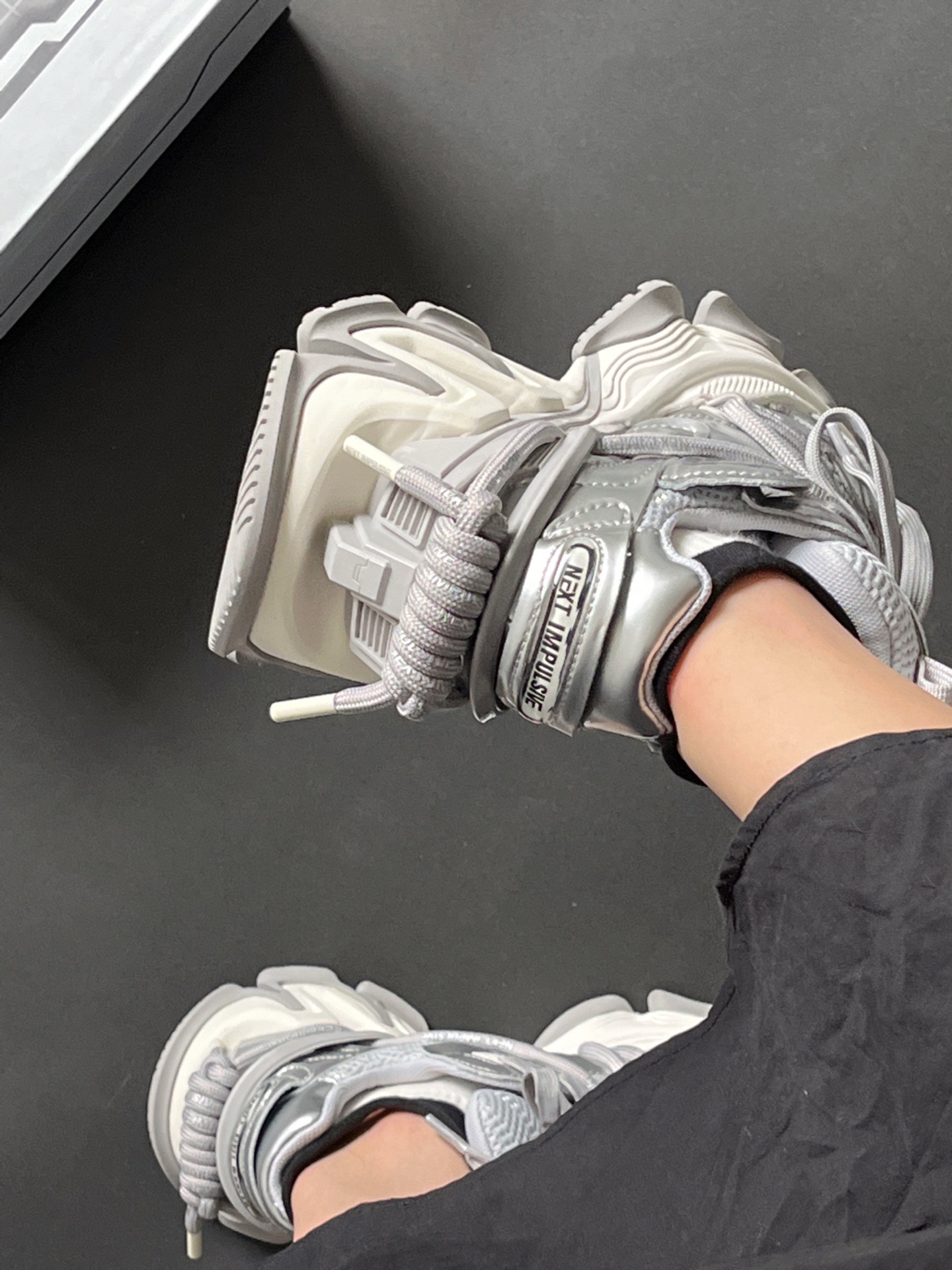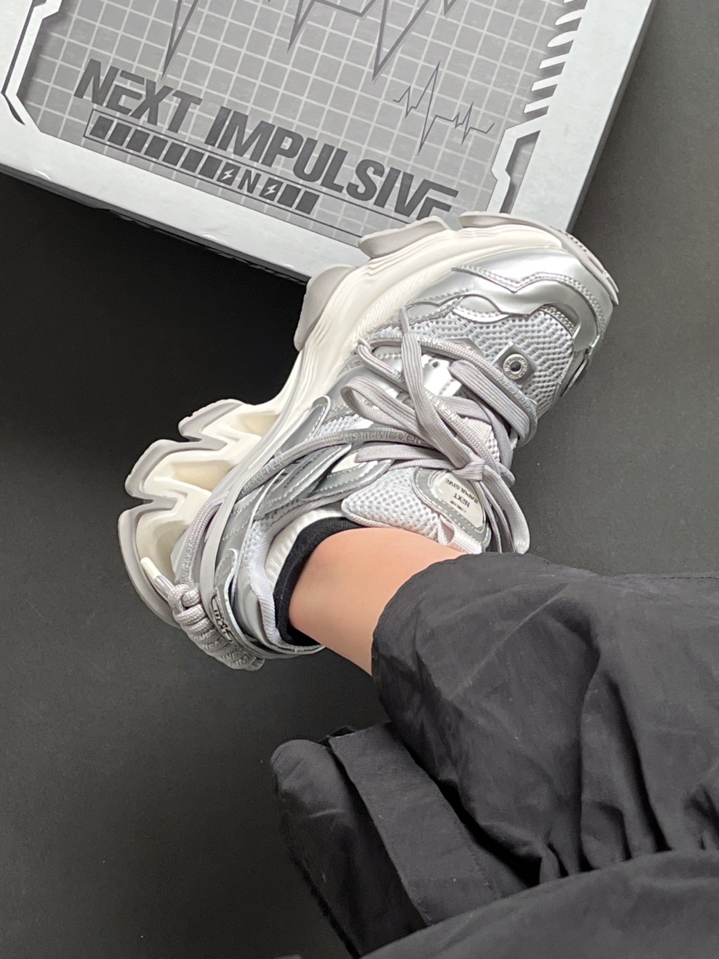 真的很有巴黎世家的感觉! 其实是NEXT IMPULSIVE冲动系列老爹鞋 挺小众的 但是真的很有设计感🆒 也是新解锁了很少穿的银色系🤍🤍 增高厚底 上脚真的相当帅的!! 而且还是舒适透气款的 夏天穿也很舒服 还是男女同款 可以和男朋友一起炸裂出街去喽~ #穿这双鞋去户外走走 #一双老爹鞋搞定夏天 #挖宝春夏宝藏鞋 #球鞋三十天挑战