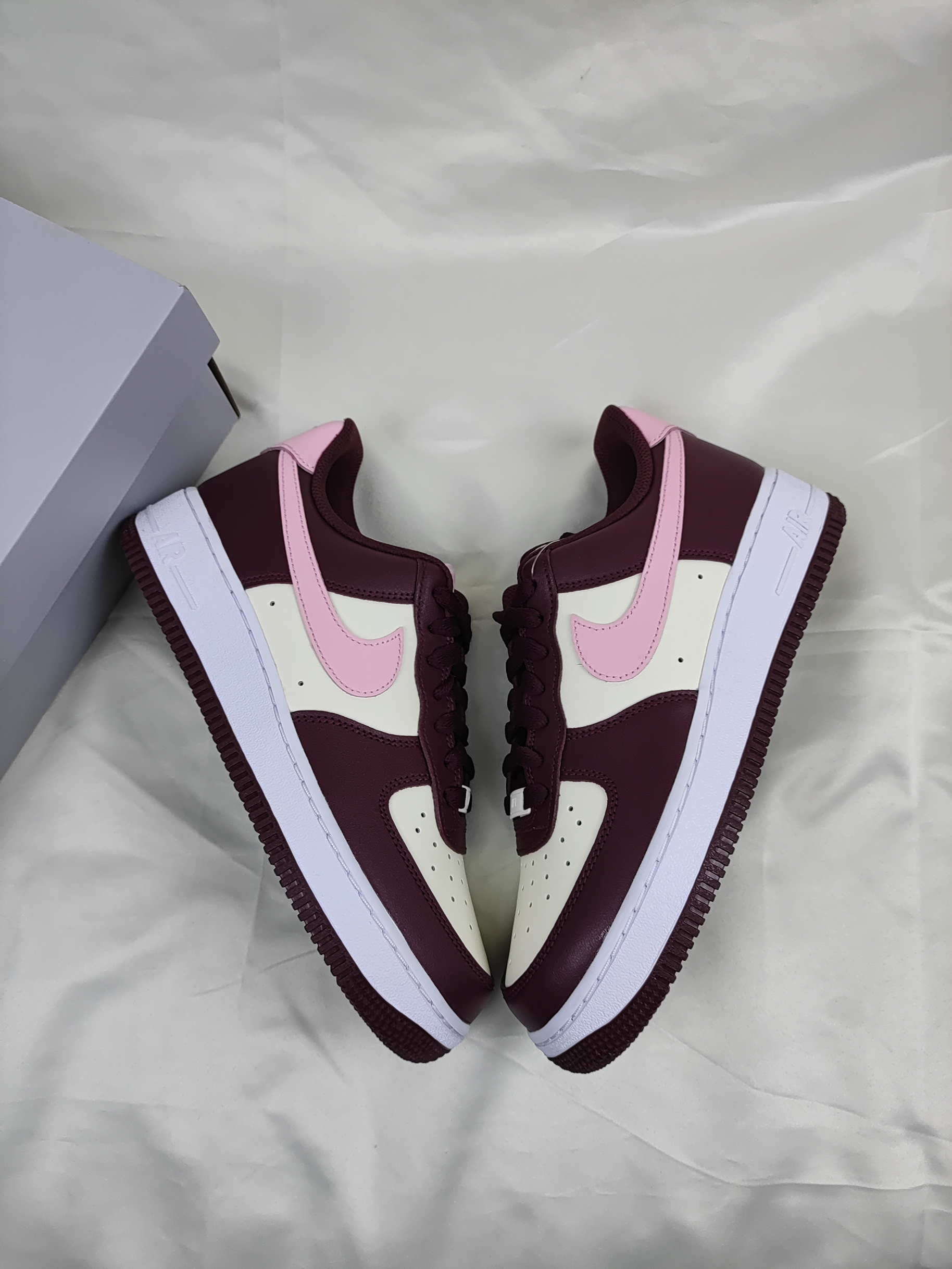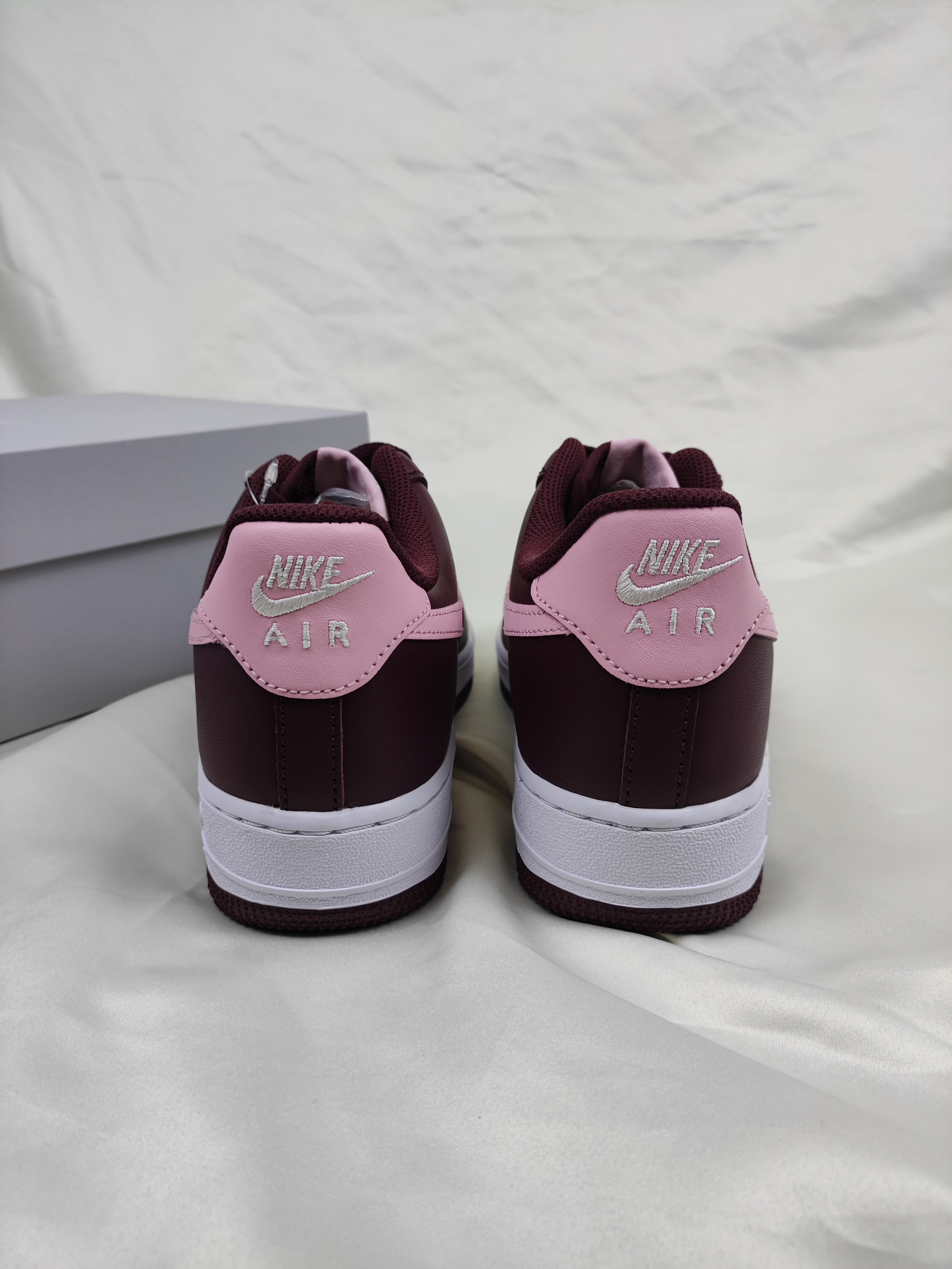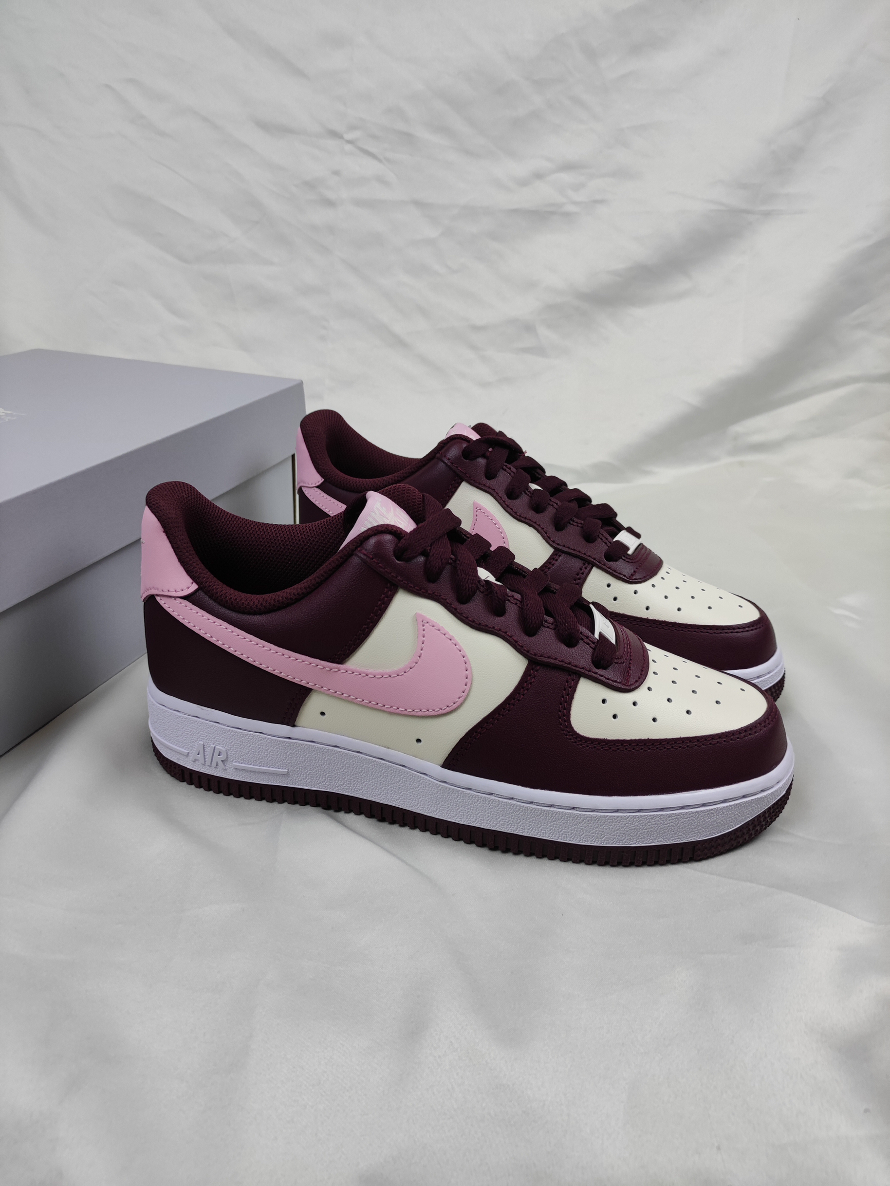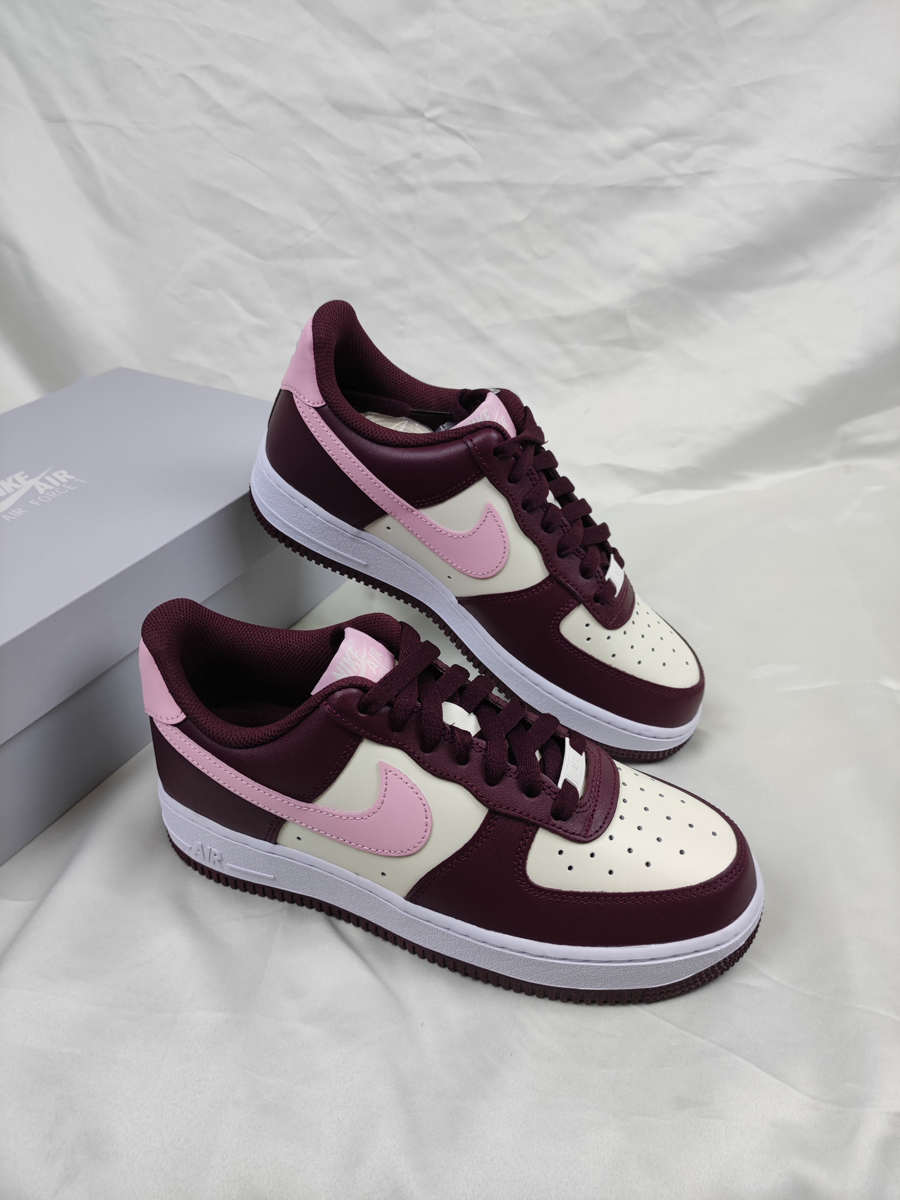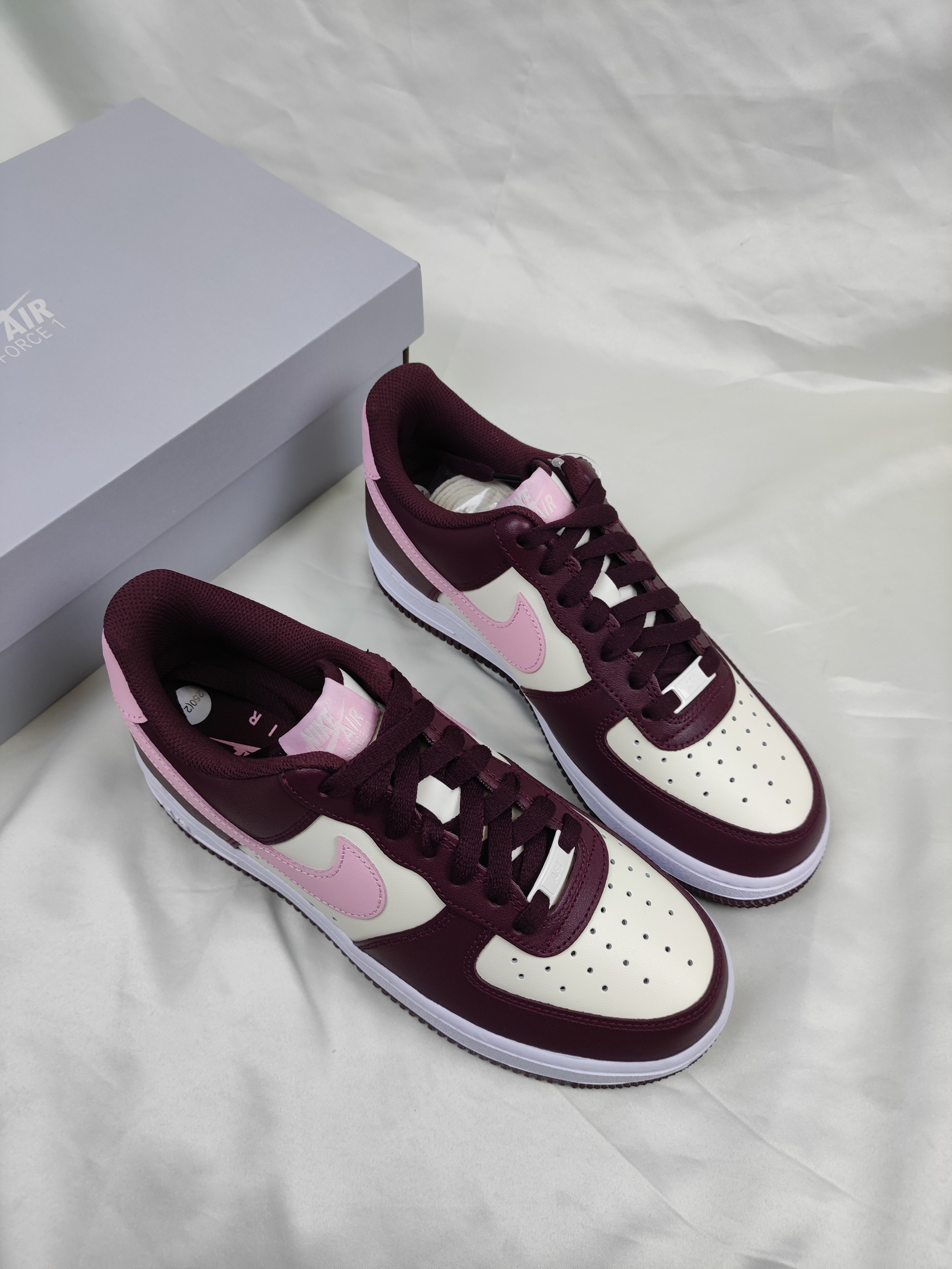 这双白粉酒红AF1算的上男女穿都好看的配色❤️ 酒红色搭配白色,Swoosh和鞋后跟点缀粉色, 鞋身的皮革质感也是相当出色,同时方便打理, 校园上脚回头率百分百哟。