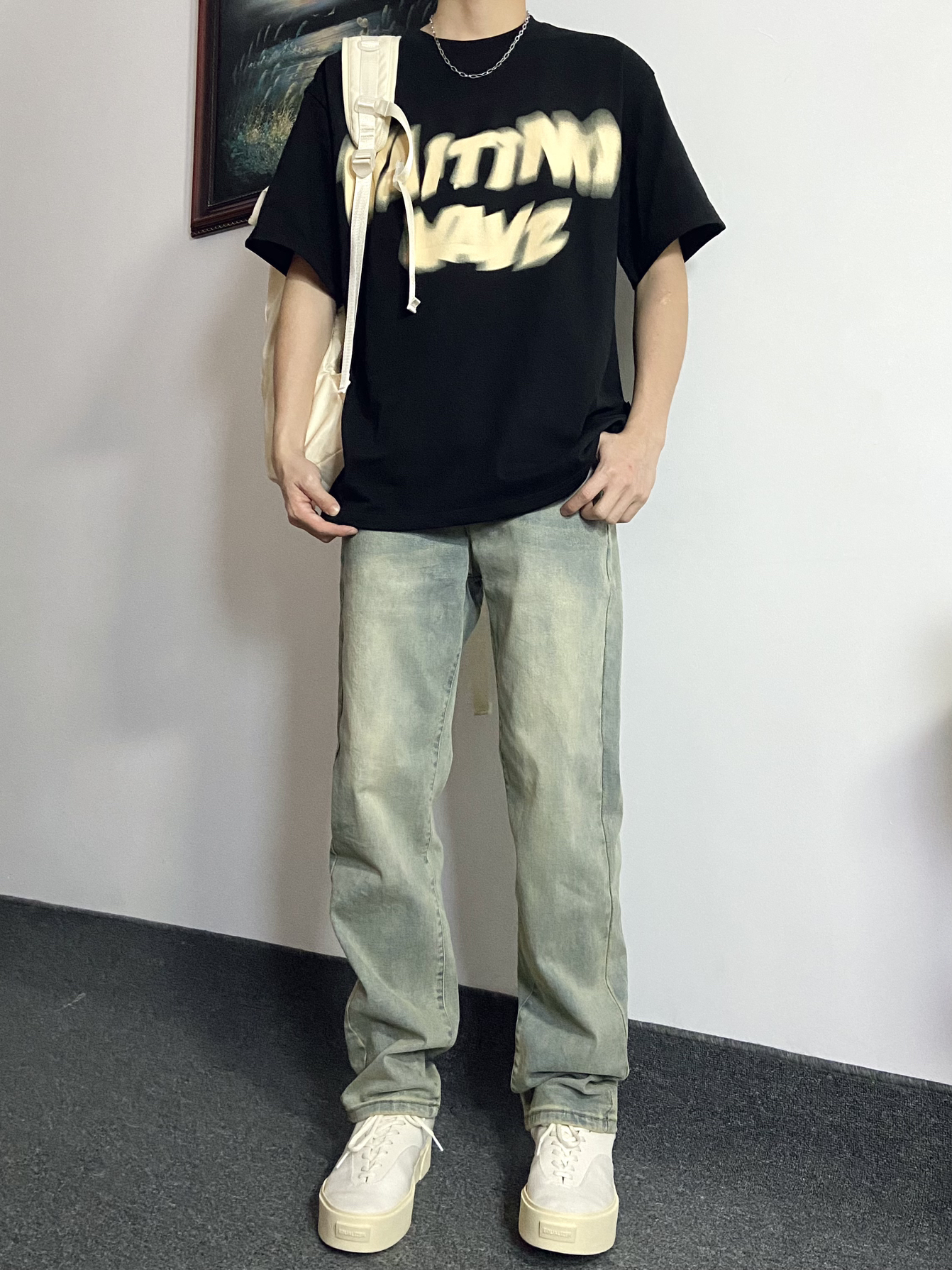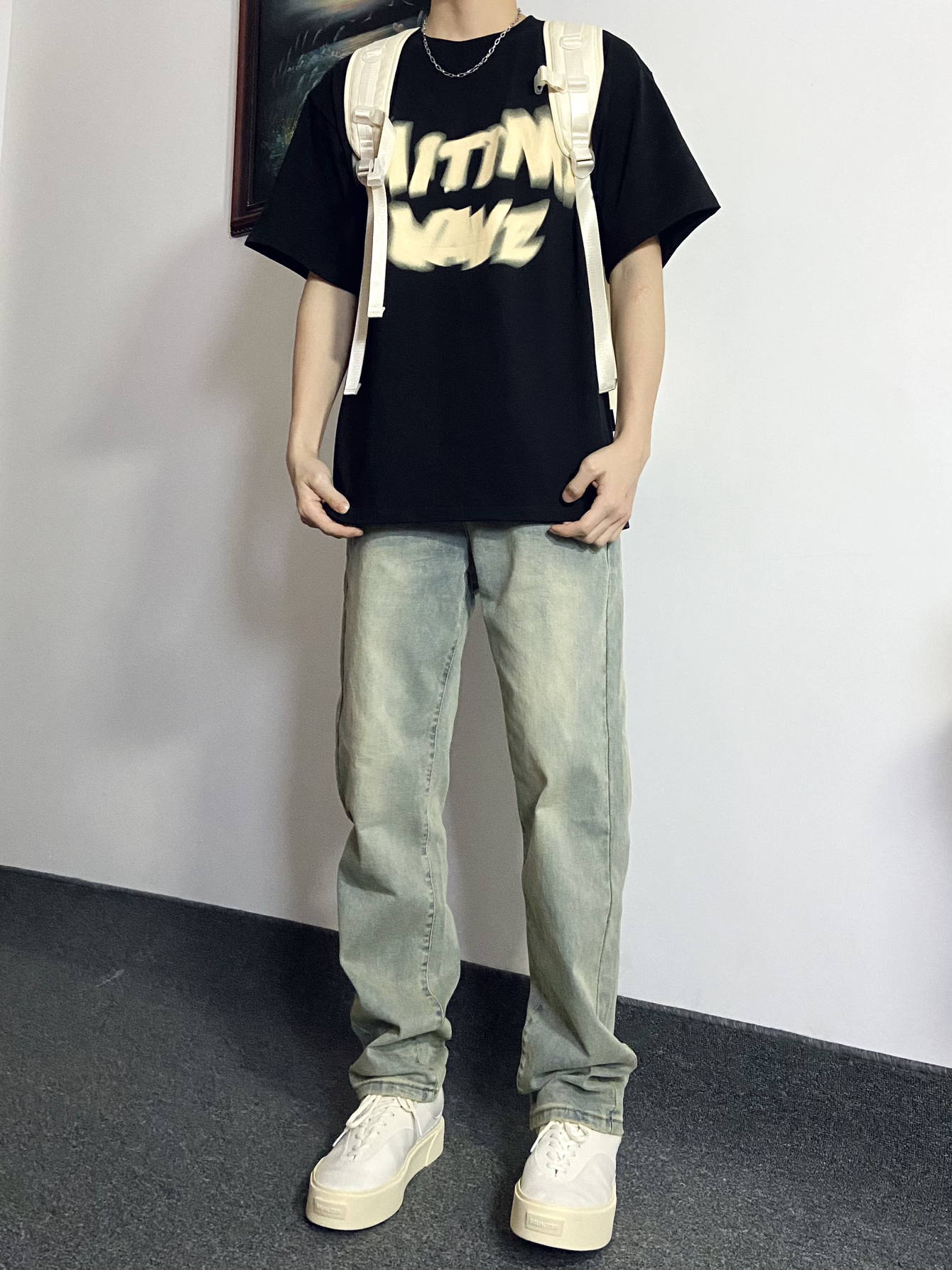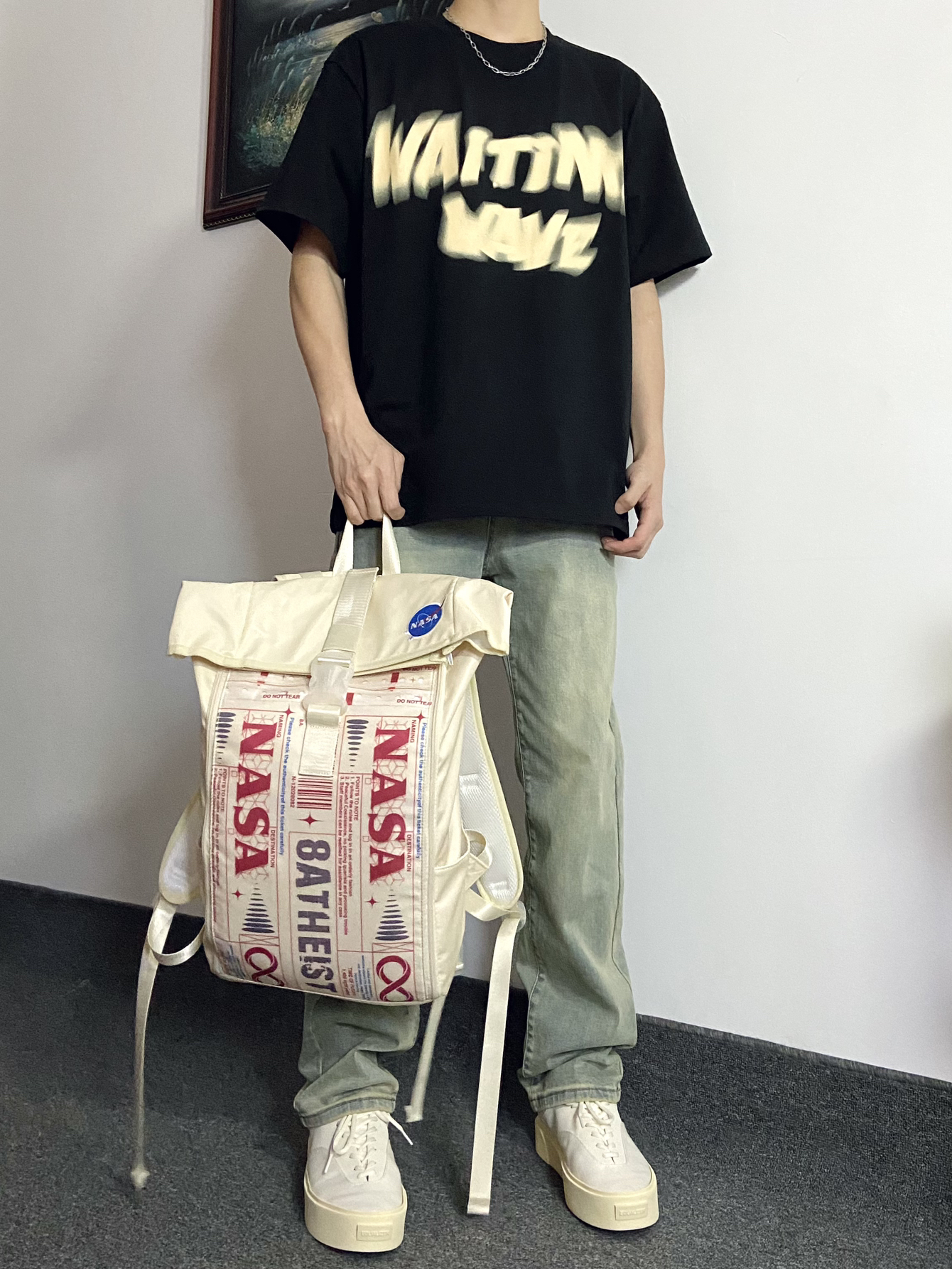 🙋♂️身高|体重:181|130 今日份Ootd: 眩晕Logo设计黑色潮酷T恤,绝了! 裤子选择了显腿长的泥黄浅色牛仔裤✨ 修身显腿长确实爱了🉑️ 这套穿搭简直氛围感拉满😎 搭配上这款潮酷的国潮双肩包太帅咯! 分享不同好看的穿搭,感谢支持❤️