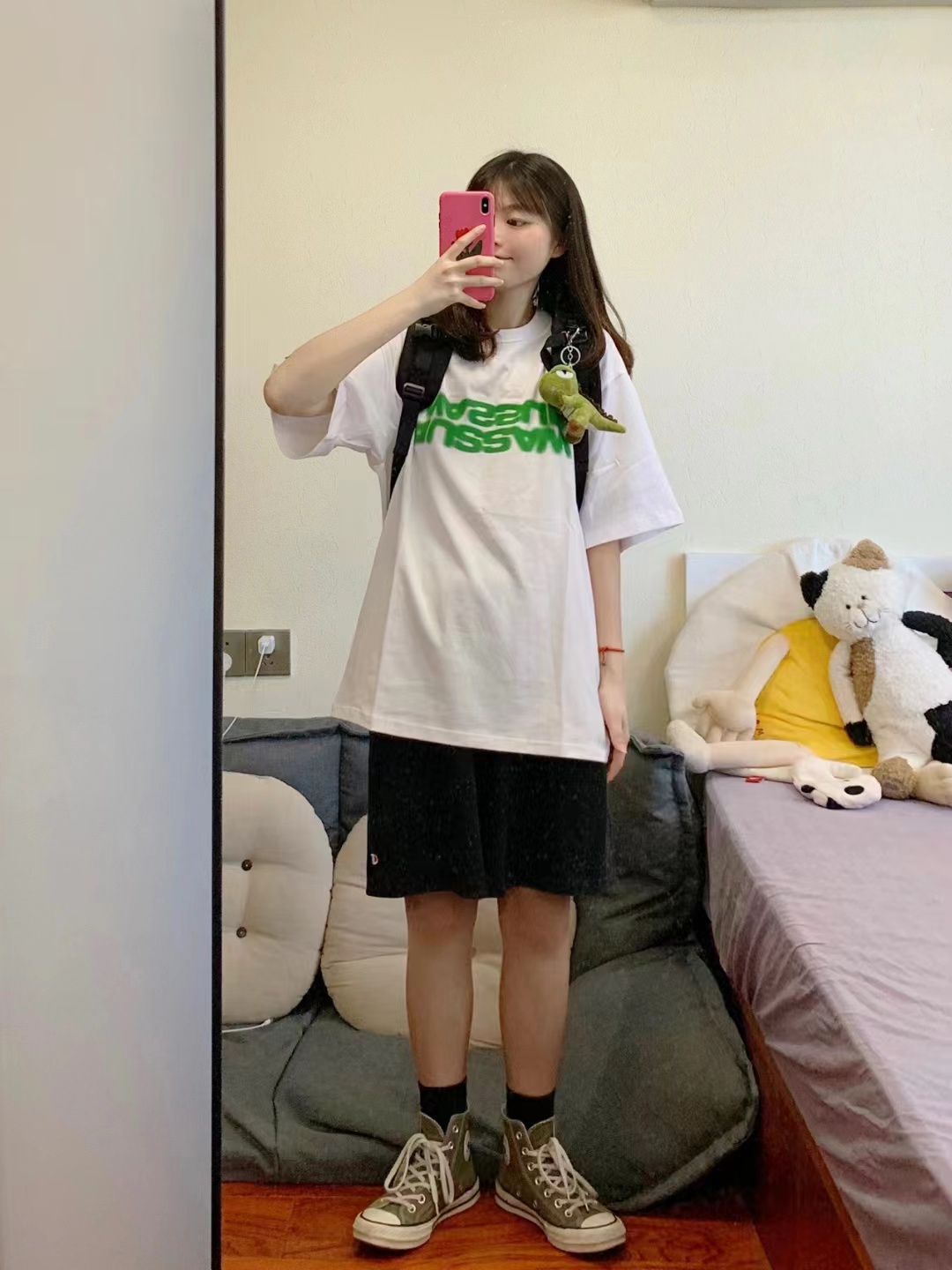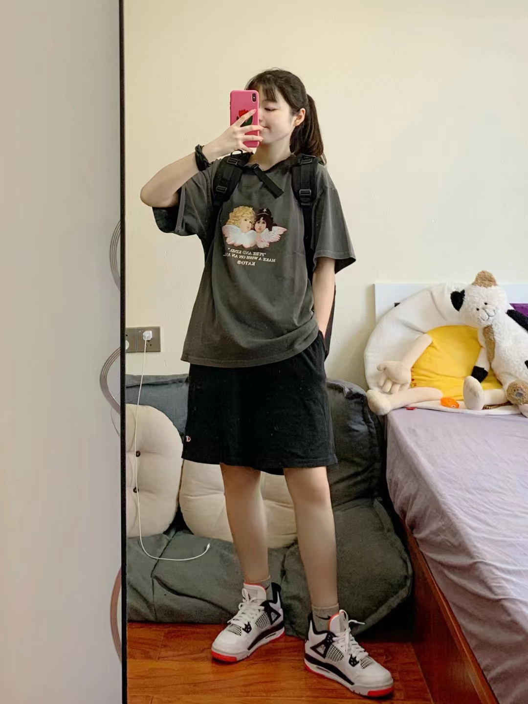 今天是跟对象比酷的一天 不过穿成这样回头率是真高🧏🏻♀️ 嗷嗷嗷!分享两套我日常真的超爱的风格! 🍋 Look1 T恤:Kaalixto(S) 我为数不多的小灰T!属于那种不那么宽大、合适但是不窄的版型 !反正就很搭小黑短裤!小天使图案加点可爱!感觉自己超! 裤子:Champion 鞋子:AJ4热熔岩 🍋 Look2 T恤:FW store(S) 很很很清爽的一件白T!绿色的字母并没有显得很突兀...