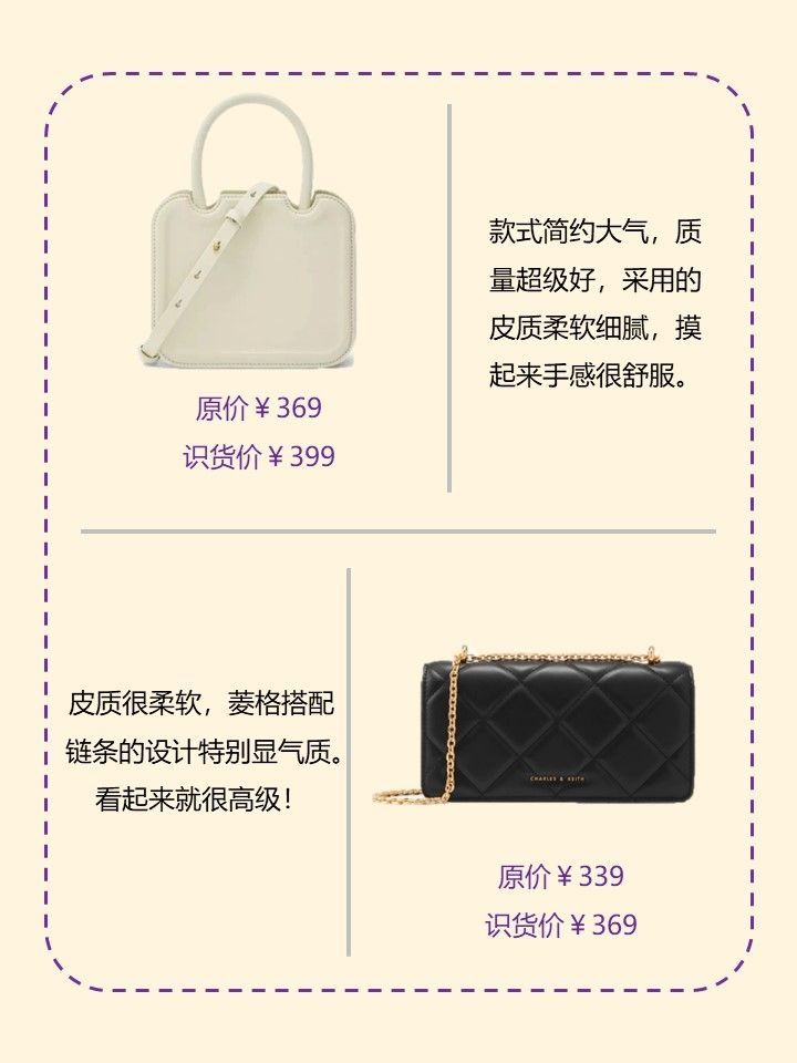 618小ck包包闭眼入打工人的天菜 - 品牌名称:小香风菱格金属扣斜挎包单肩链条包 识货售价:263 推荐理由:小ck小香风菱格链条包!整体轻巧方便,有零钱包和卡包层,经典翻盖,任何场合都ok (分享自识货博主@殊言syth) - 品牌名称:菱格链条单肩斜挎包 识货售价:339 推荐理由:简约洁白的颜色高级低调奢华,链条增加时尚度,包包手感高级摸起来很舒服,软软的也很棒 (分享...