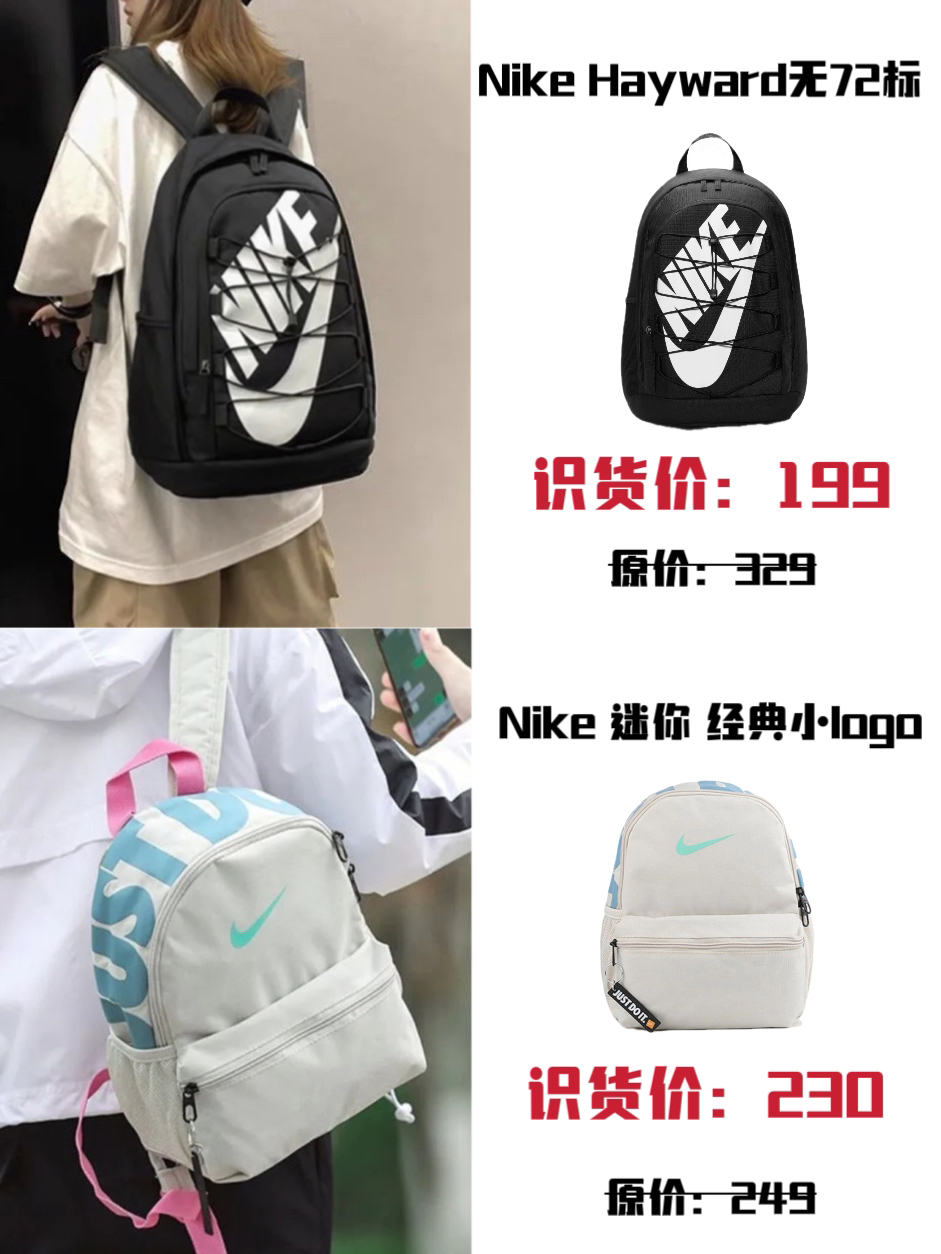 💕Nike Hayward 背后无72标大Logo绑带大容量拼色 背包双肩包 💰识货价:329元 这款包的设计也太可了吧,纯黑色的包身是简约百搭的 款式,休闲风十足,而且肩带的设计也很可以,做工精致的超适合背出去健身、旅游啥的哦,完全是很百搭基础的款式。 (分享自识货@晒谷久里子) 💕Nike 爆裂纹金属飞人logo徽章书包篮球包双肩背包 💰识货价:449元 爆裂纹纹理在阳光下有种波光粼鄰的感觉...