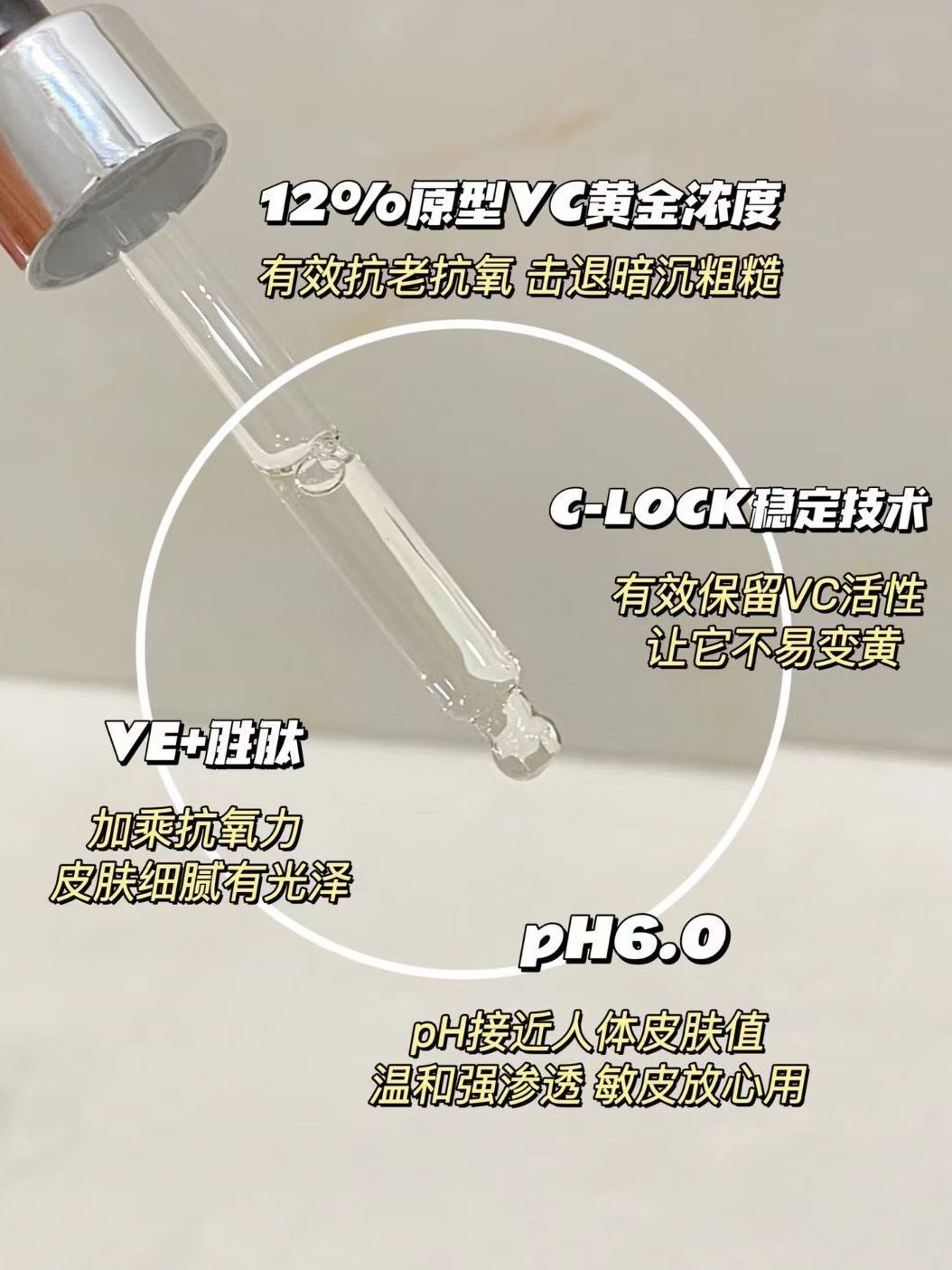作为一个996熬夜打工人 每天早上起来脸蛋子暗沉粗糙到不行,一整个"黄脸婆"既视感 直到我用了这个真C瓶 发现它简直就是妥妥的嫩肤小能手嘛 这个真C瓶它在抗氧化让皮肤透亮这块,真的没话说 🔵成分方面: 12%的原型VC 网上都说它这个浓度刚好是发挥抗氧提亮作用的黄金浓度 而且用的是水溶原型VC 不会染黄角质层,也没有难闻的铁锈味,更不会过度刺激损坏皮肤屏障! 加上复配了VE和二胜肽,清扫自由基...
