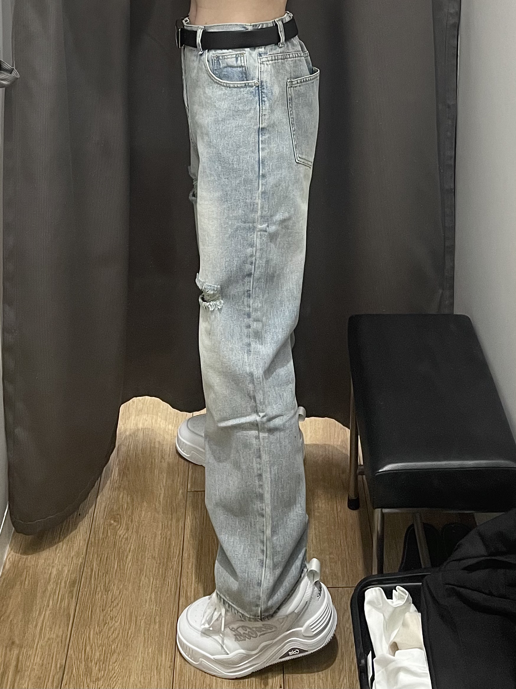夏天超级舒服的破洞牛仔裤来咯!浅蓝色的渐变设计风格 拖地版型 直筒显瘦!好绝‼️ 搭配条纹蓝黑细条纹短袖 校园风格满满 真的太显年轻啦! 怎么可以少了一双面包鞋呢!!真的太爱这双面包鞋啦!一下子又长高啦!鞋型很适合搭配拖地版型牛仔裤!绝啦!