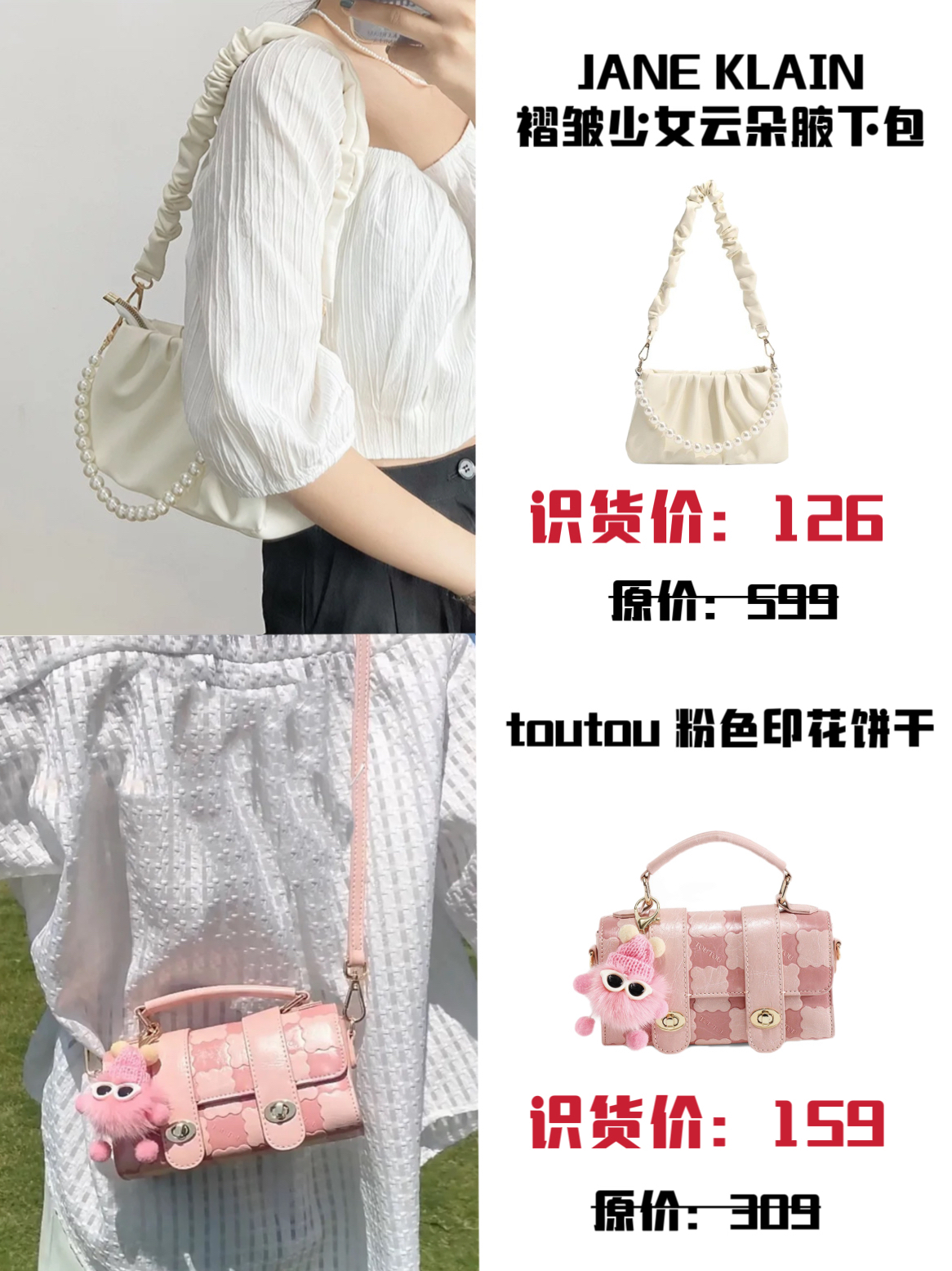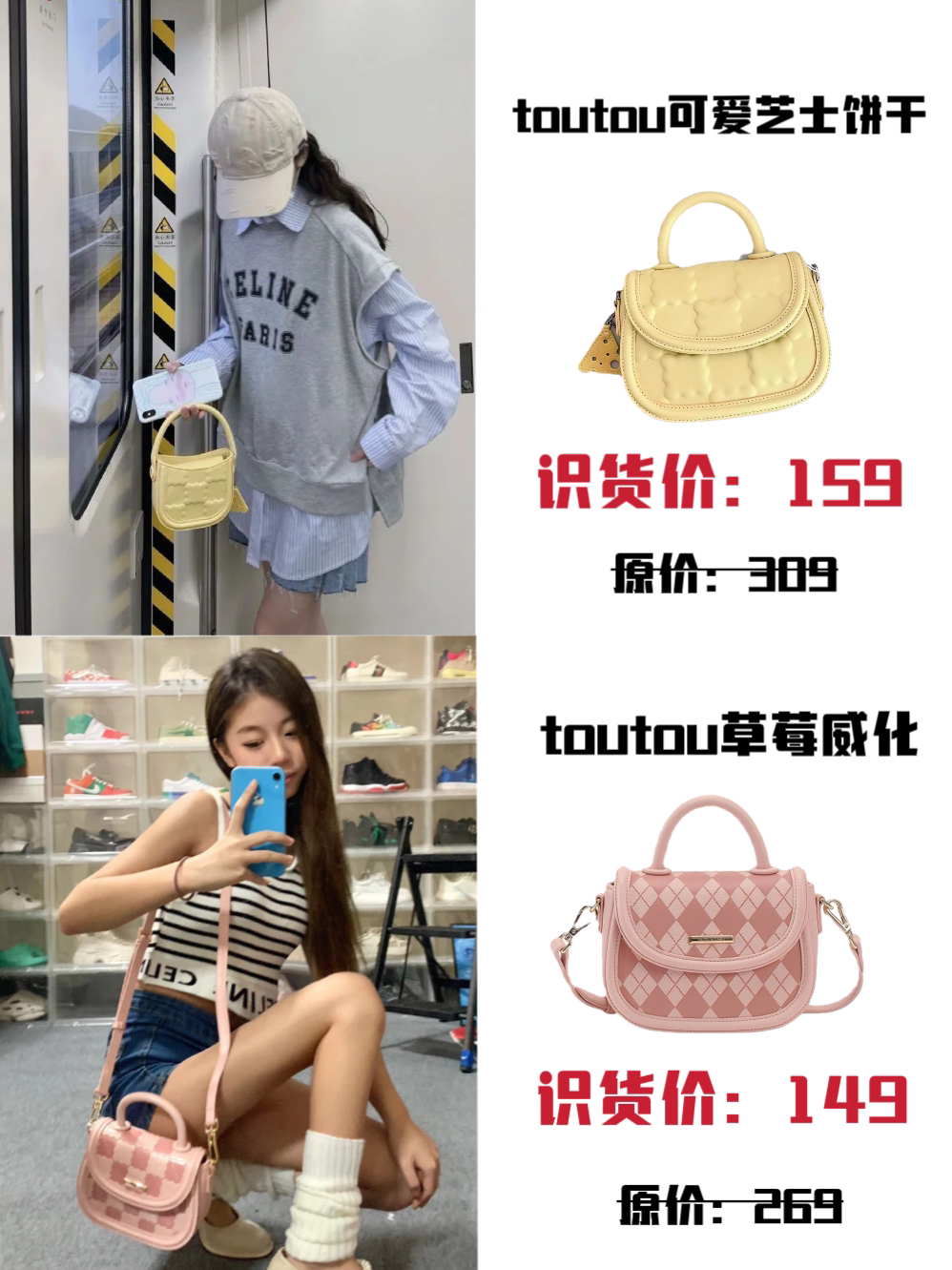 🍊toutou 粉色印花併干斜桍包 💰识货价:159 天啦嘛这只包真的戳到我惹~小饼干图案的印花设计,粉粉嫩嫩可可爱爱还搭配了一个小毛球的挂件,毛茸茸的感觉心都要被融化了,而且剑桥的包型背上就妥妥的 时尚弄潮儿 (分享自博主:超爱草莓) 🍊toutou 简约百搭斜挎包 💰识货价:129 大小刚好!质量也杠杠的,感觉他家的包包喜欢就可以直接入了,一般都不会超过两百!绝对值!而且这个包包皮质不硬,但...