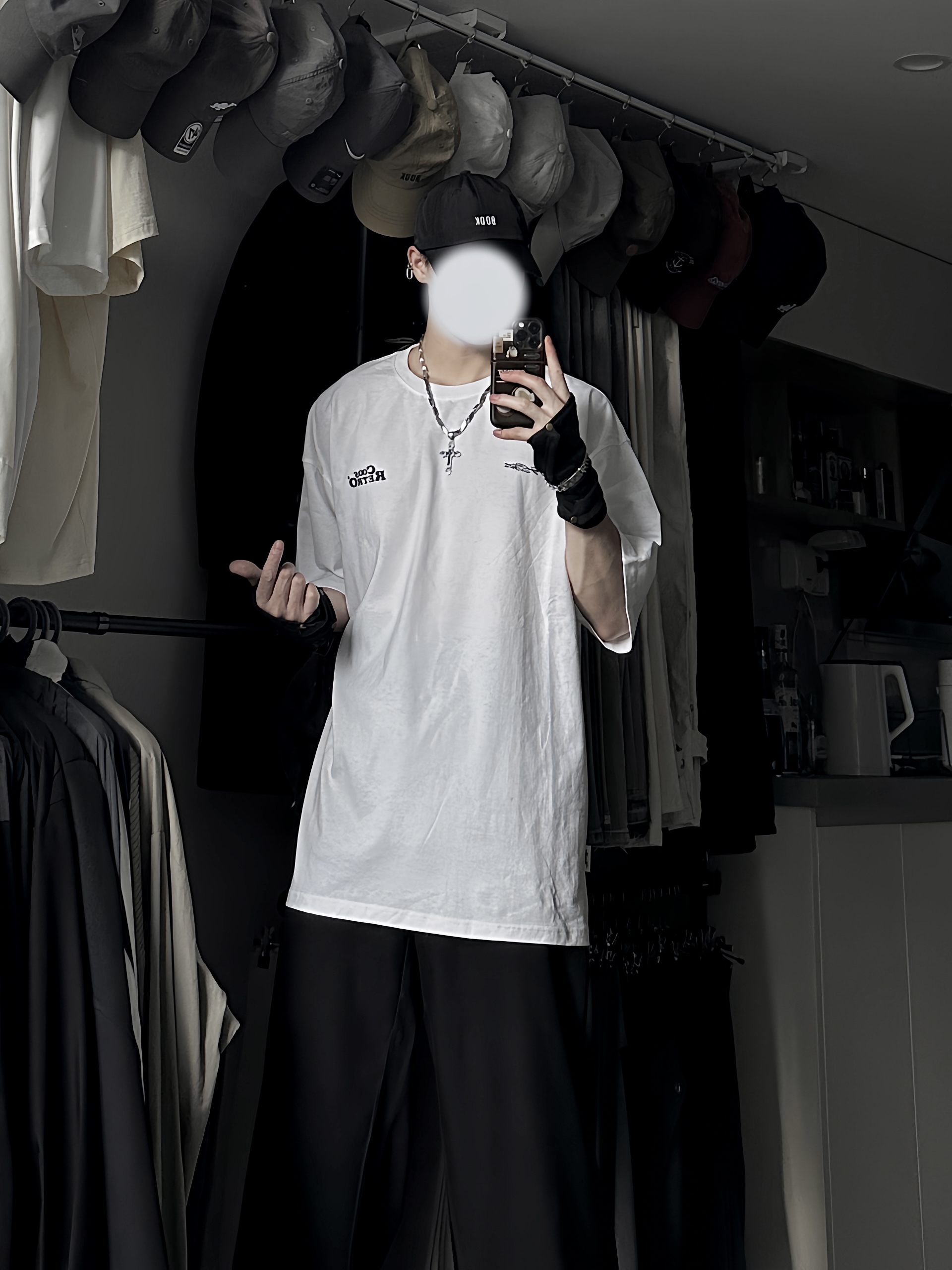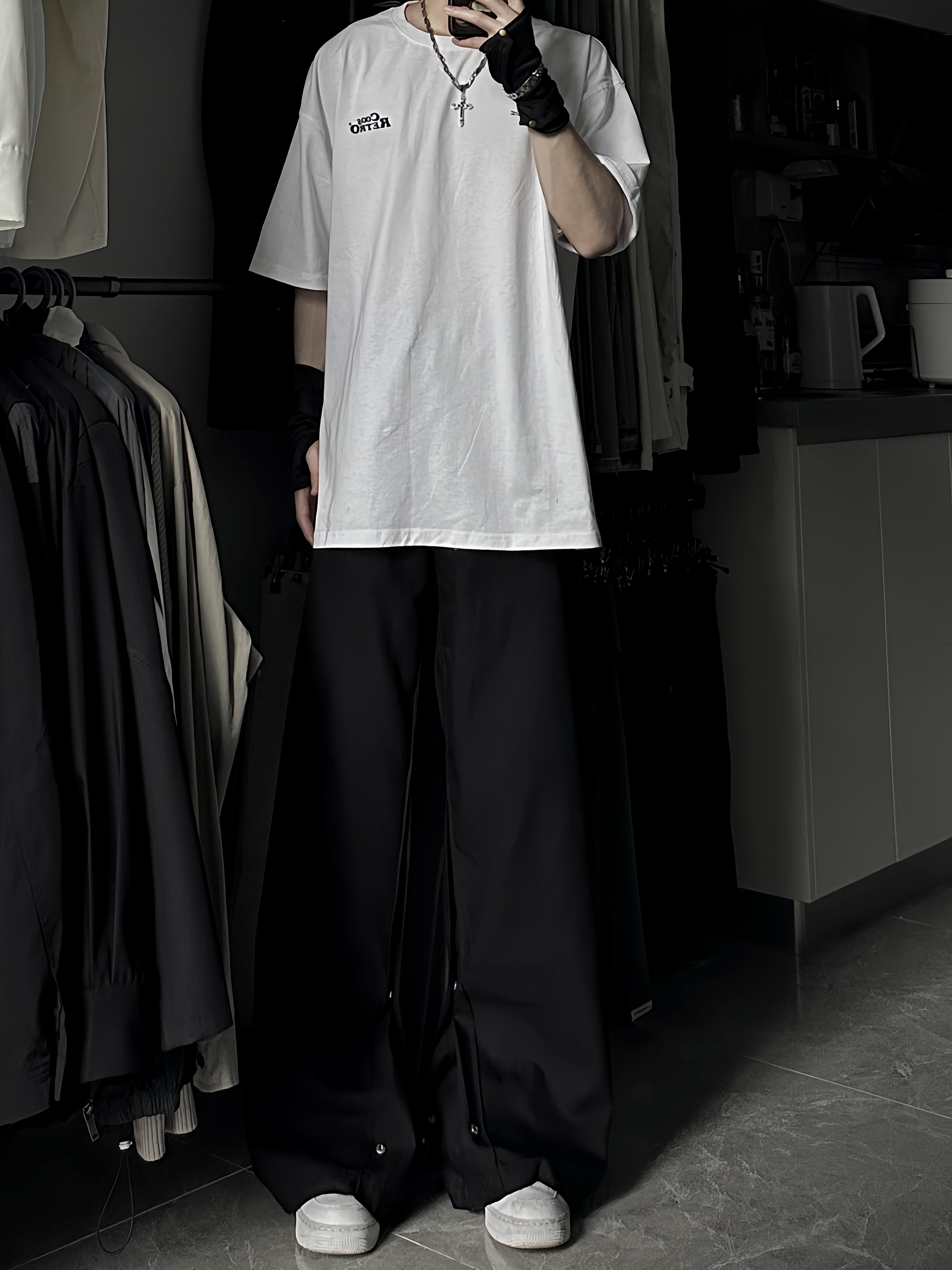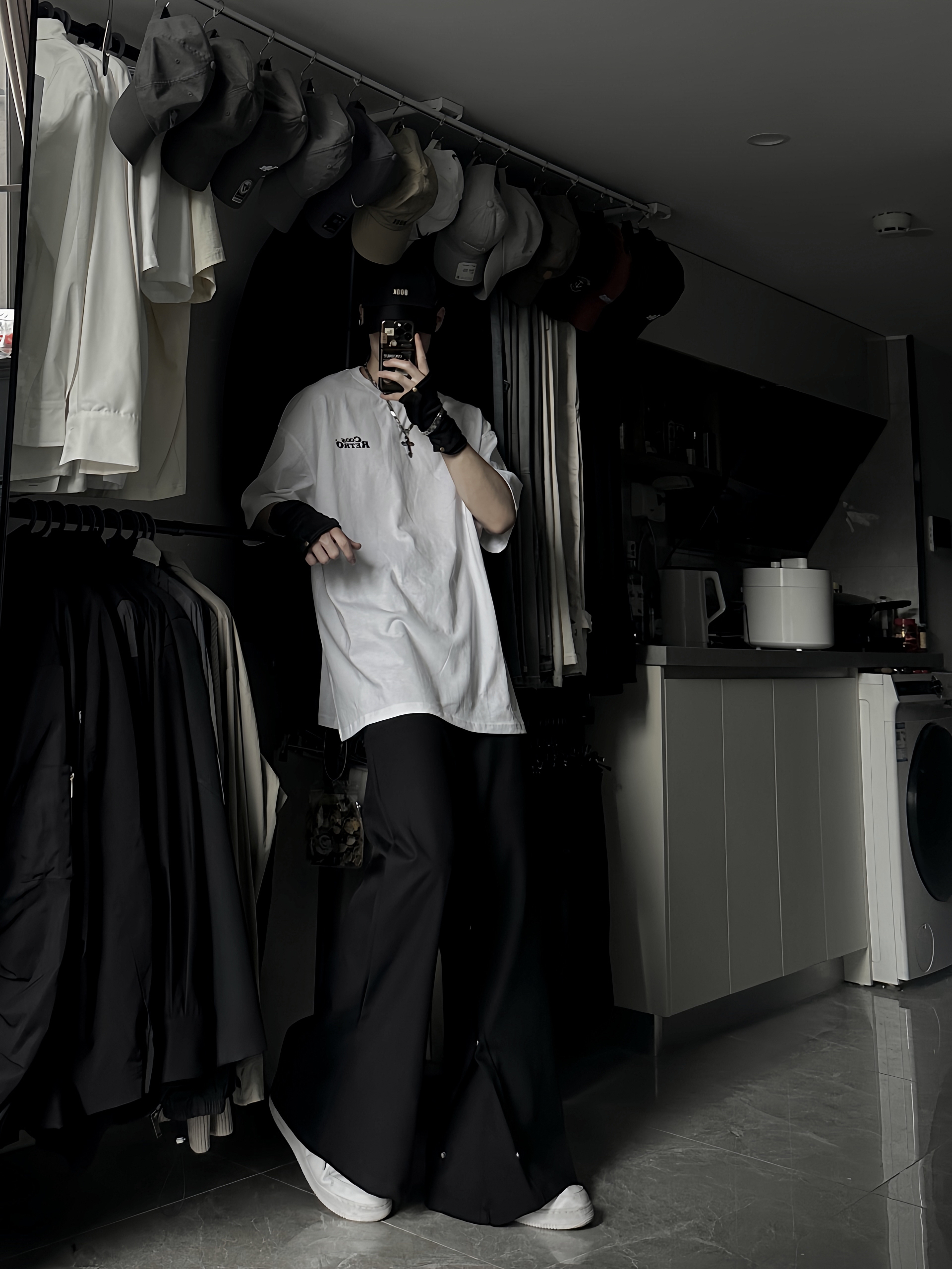 今天是白丁➕黑色阔腿裤 简约的短T真的很百搭 👔 上衣是来自CoosRetro字母印花tee 整体是属于简约设计,版型宽松挺括! 上身很帅! 👖 裤子来自UGL YHOT的排扣西裤 最近一直都在上身的裤子,内侧排扣可以自由调整裤脚宽松程度(我喜欢解开一个扣子 就像微 喇阔腿) 宽松版型,内侧的排扣设计很帅! 👟 nike AF1