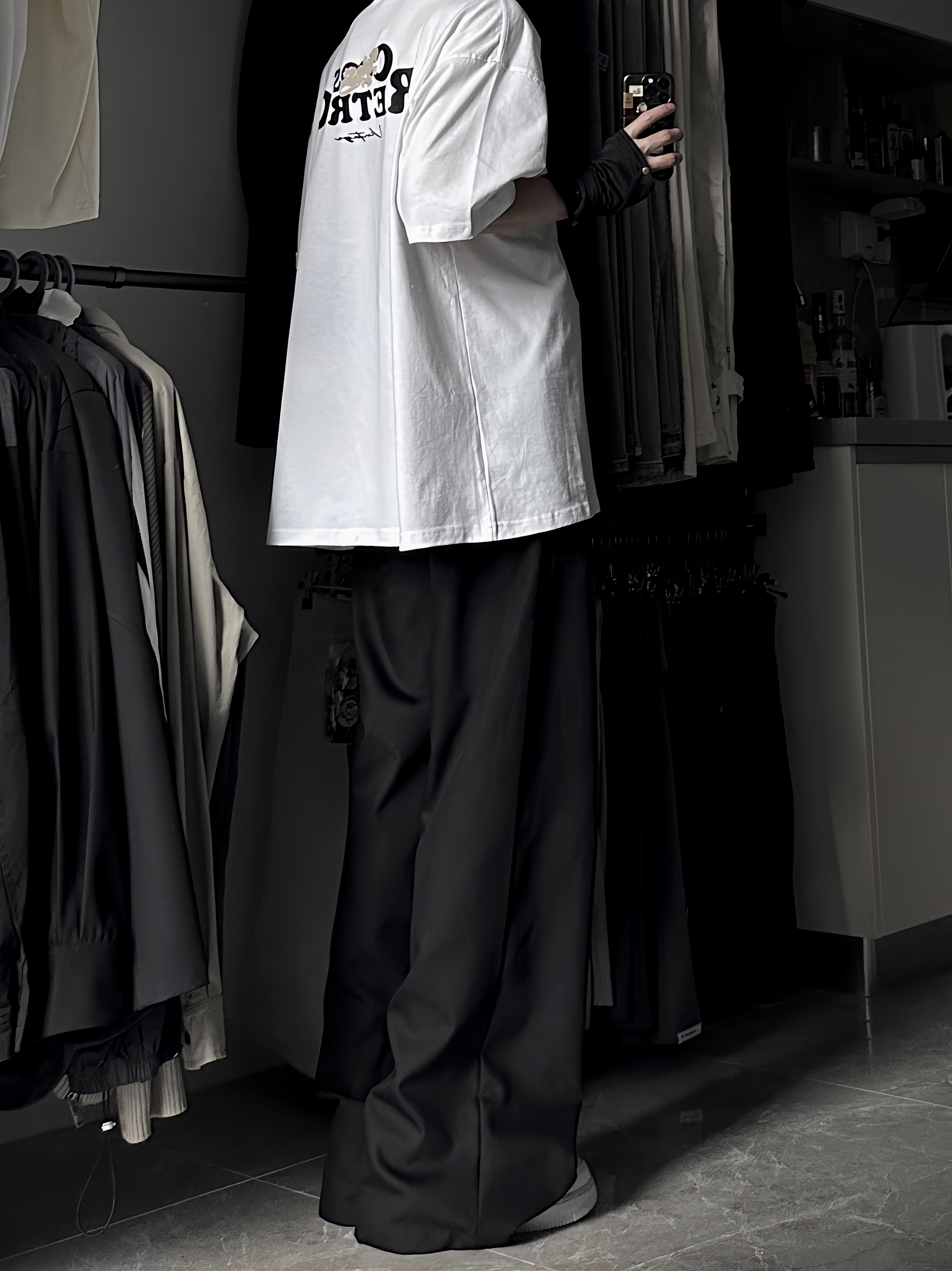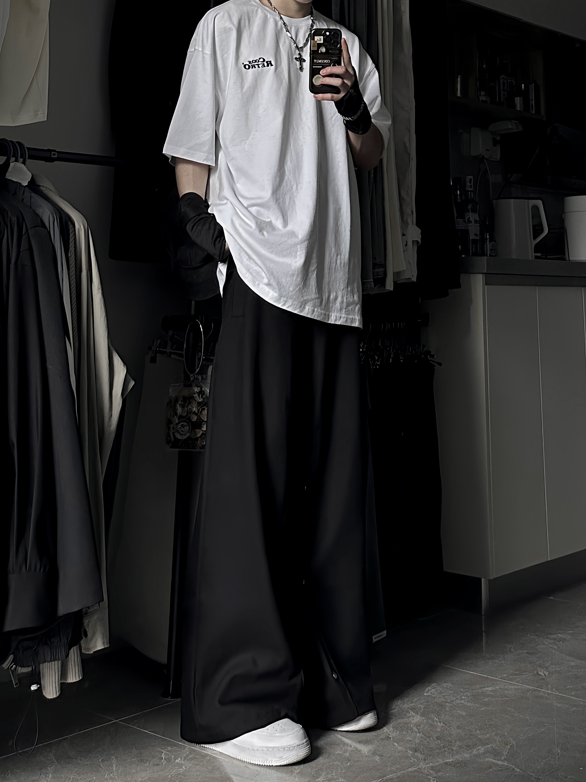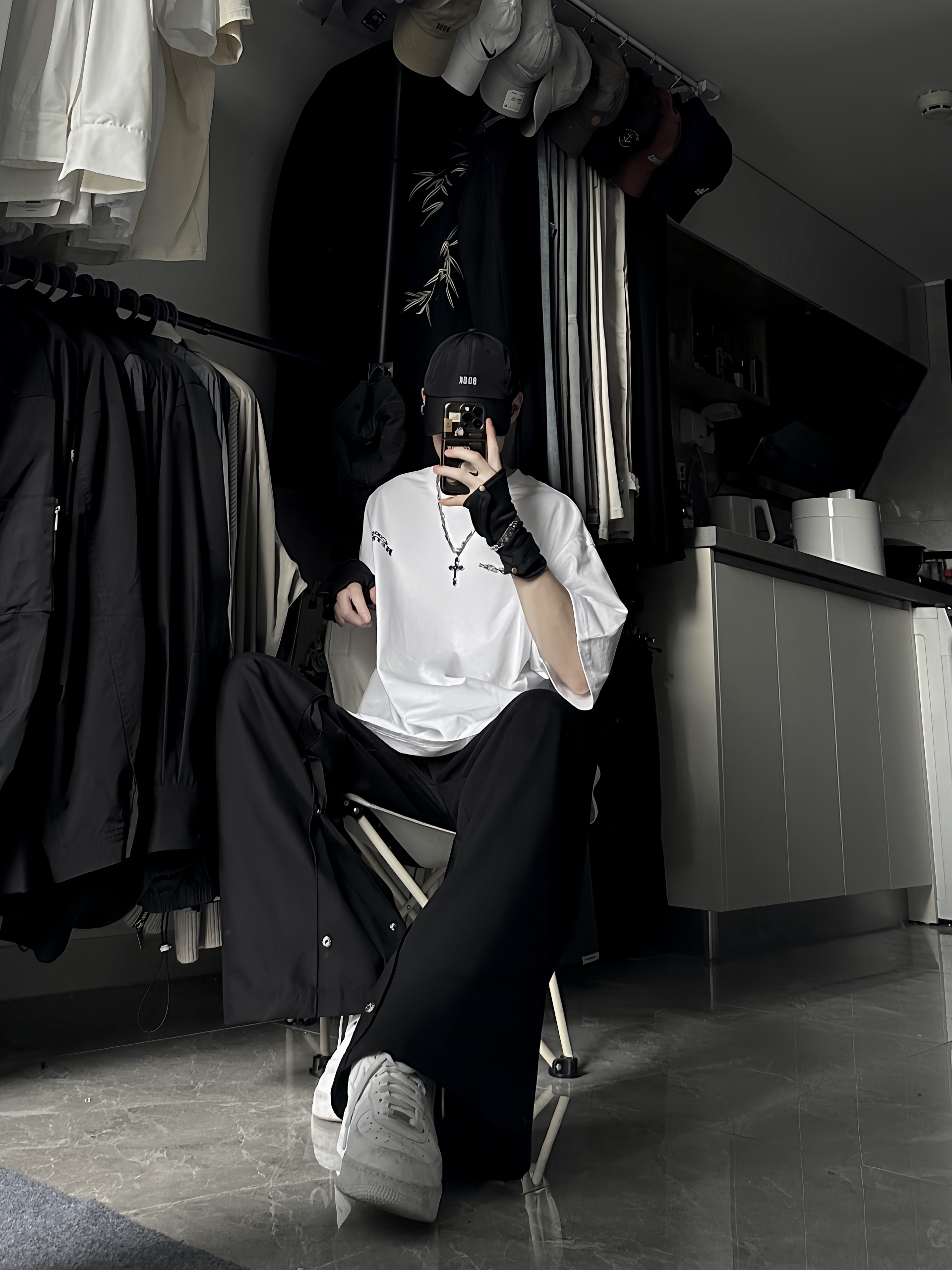 今天是白丁➕黑色阔腿裤 简约的短T真的很百搭 👔 上衣是来自CoosRetro字母印花tee 整体是属于简约设计,版型宽松挺括! 上身很帅! 👖 裤子来自UGL YHOT的排扣西裤 最近一直都在上身的裤子,内侧排扣可以自由调整裤脚宽松程度(我喜欢解开一个扣子 就像微 喇阔腿) 宽松版型,内侧的排扣设计很帅! 👟 nike AF1