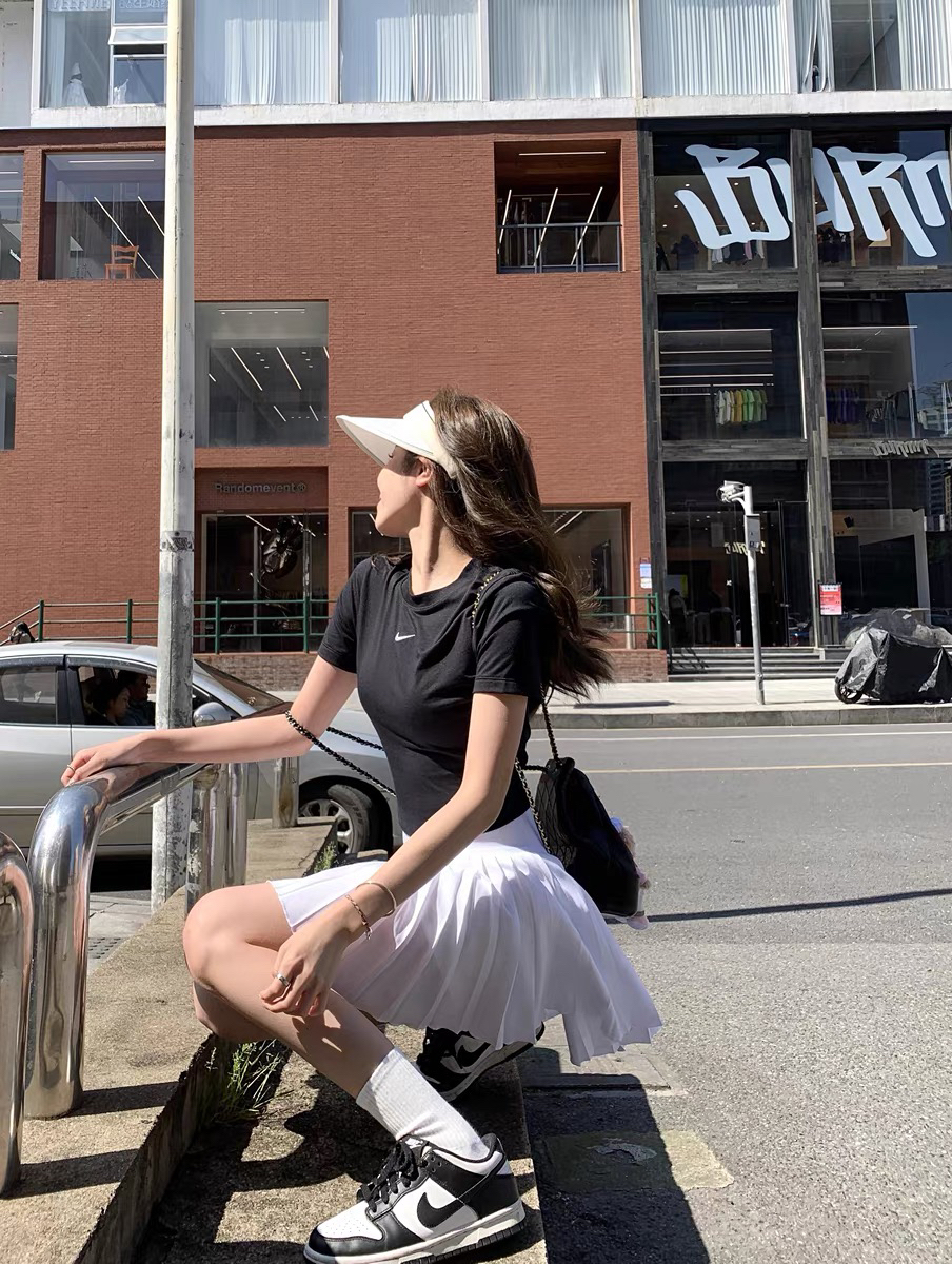 白色超短百褶裙搭配黑色T恤,清纯美少女既视感! 这件短袖一定要入手,百搭还不贵,真的一搭青春气息扑面而来,仿佛是甜甜的恋爱味道。 在超短裙映衬下,满屏都是细、长、直的筷子腿。不得不感叹一句:年轻真好! 图源于网络